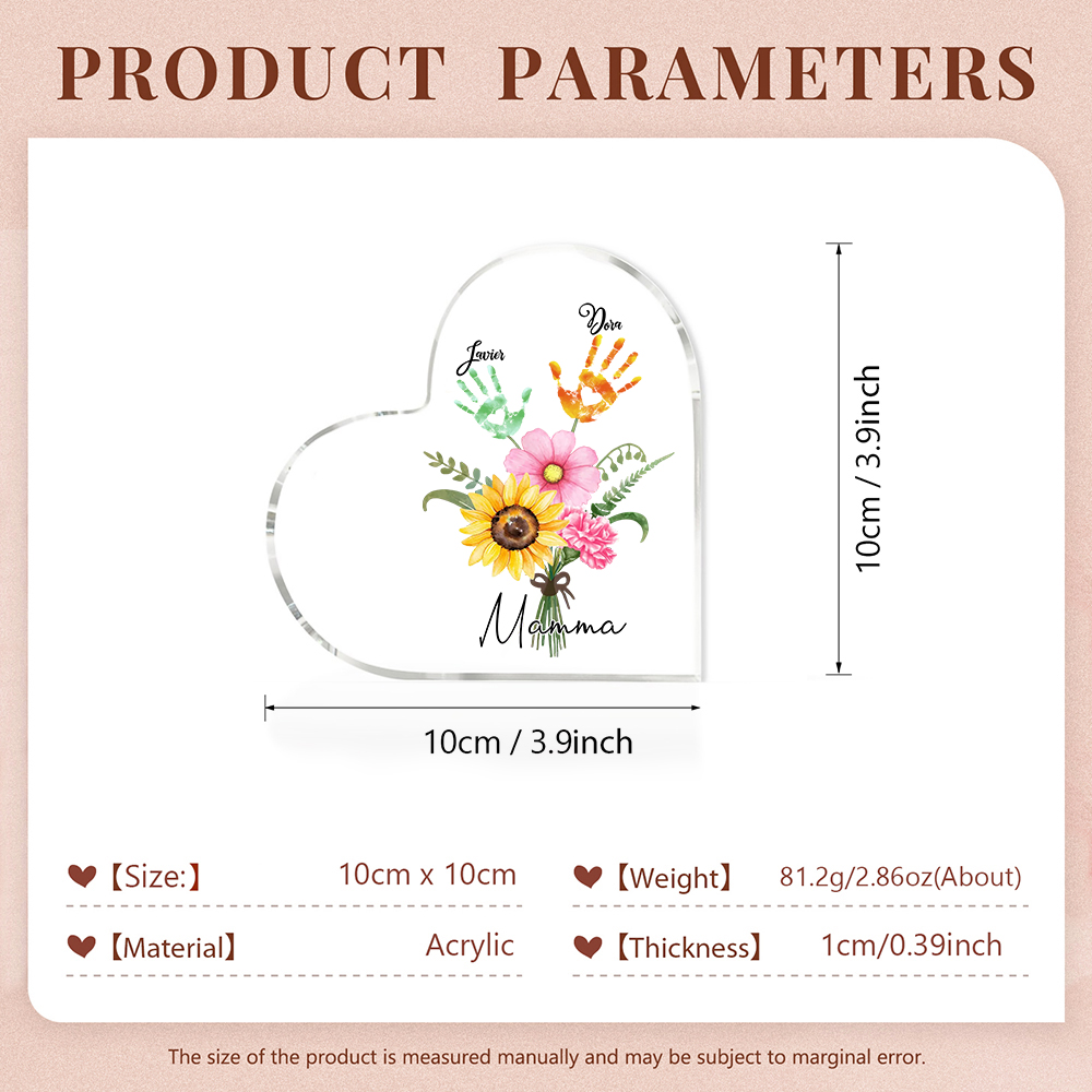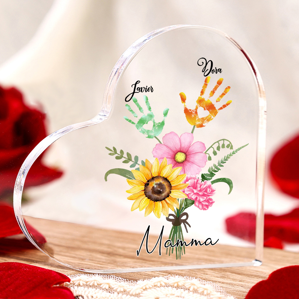 Mamma-Decorazione acrilica con un mazzo di fiori e mano 2 nomi e 1 testo personalizzati per mamma/nonna
