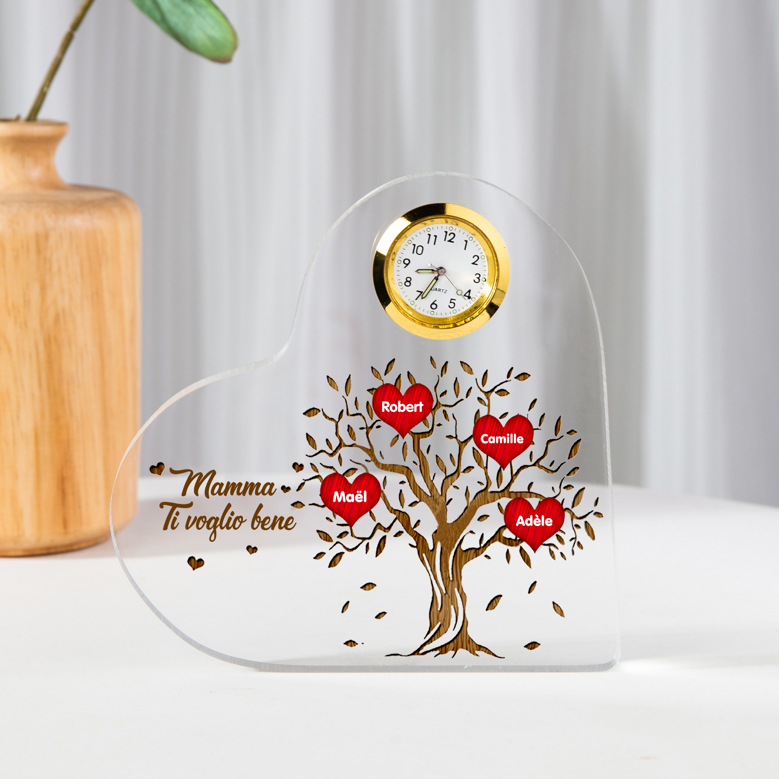 Decorazione acrilica albero di vita 4 nomi e 1 testo personalizzati con orologio regalo per mamma/nonna