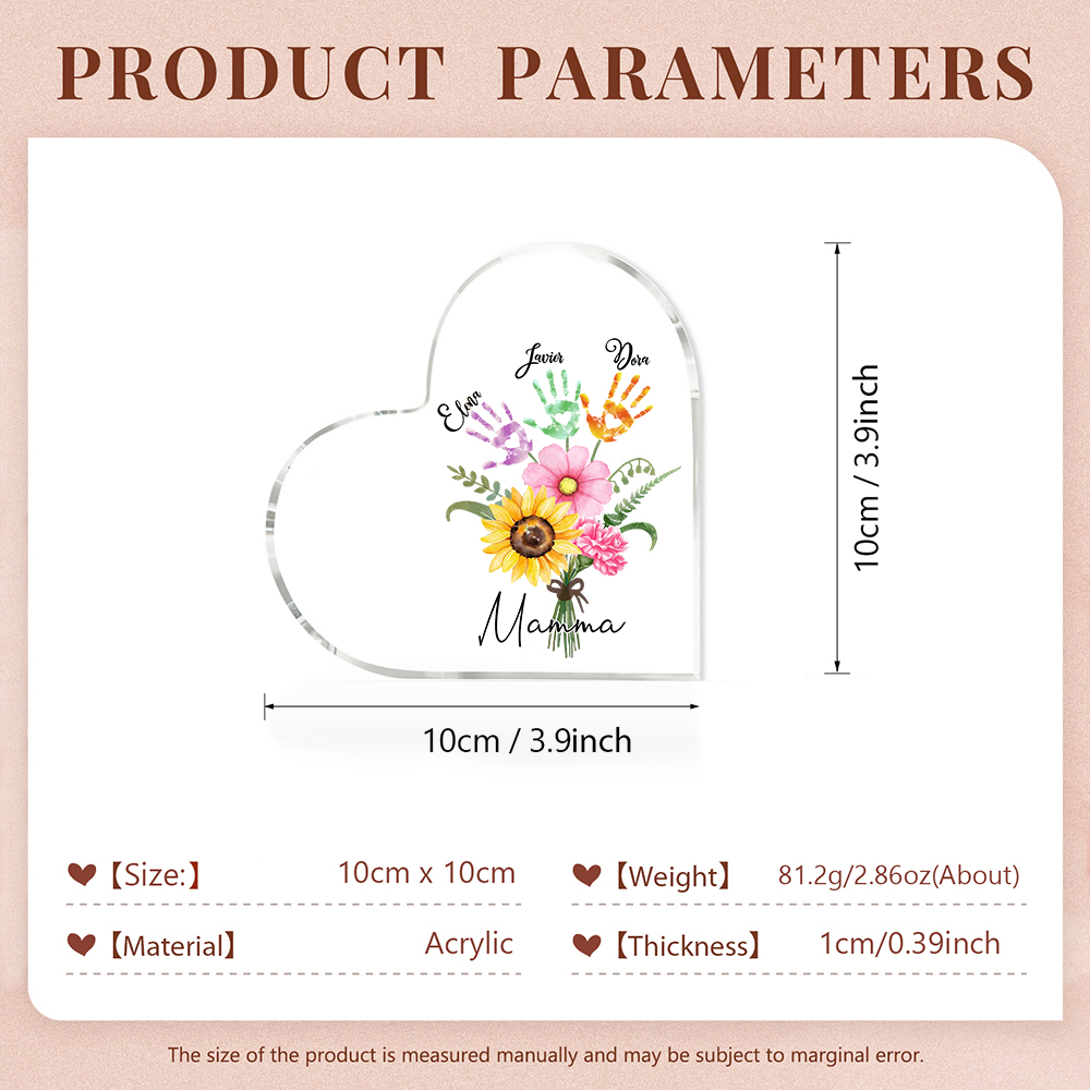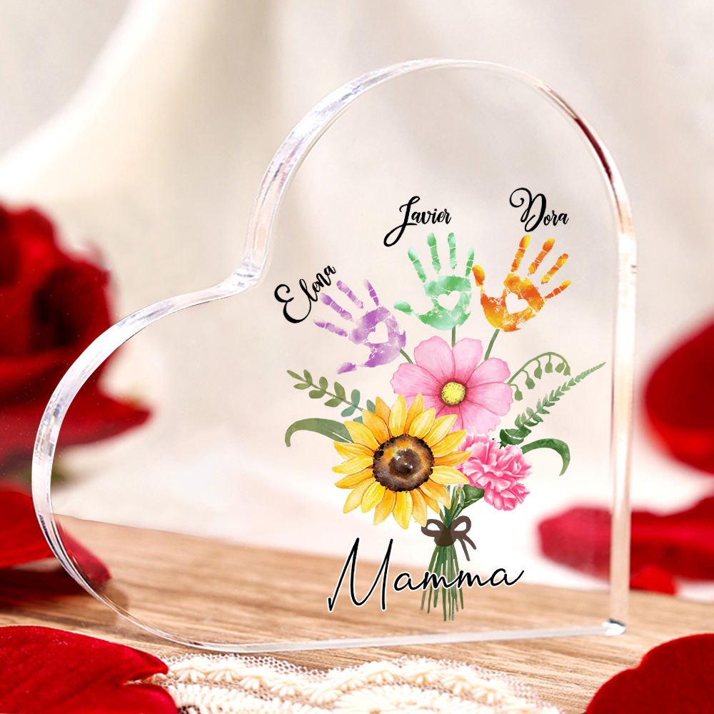 Mamma-Decorazione acrilica con un mazzo di fiori e mano 3 nomi e 1 testo personalizzati per mamma/nonna