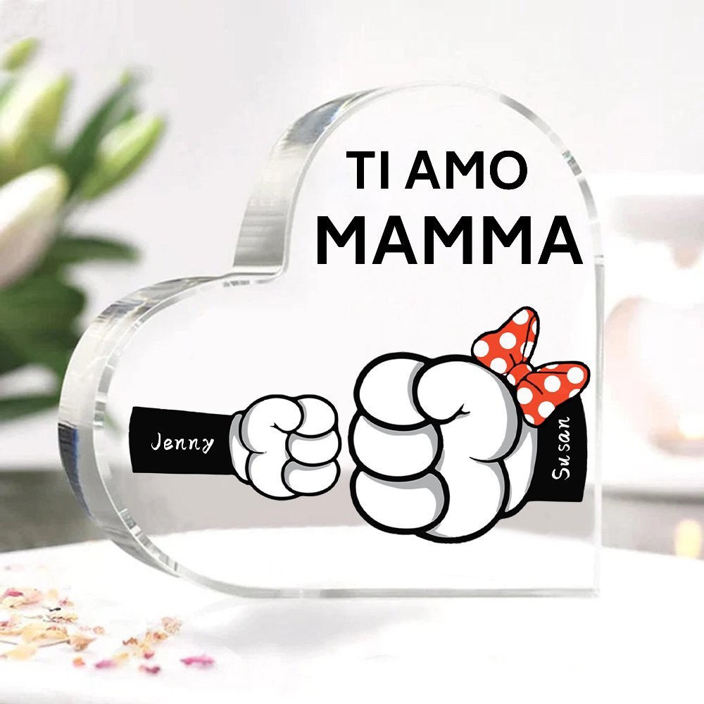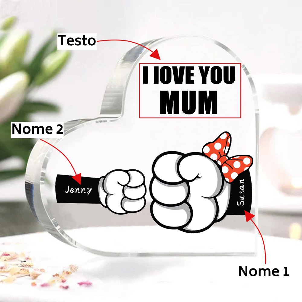 MAMMA Decorazione acrilica pugno a pugno a forma di cuore 2 nomi e 1 testo personalizzati per mamma/nonna