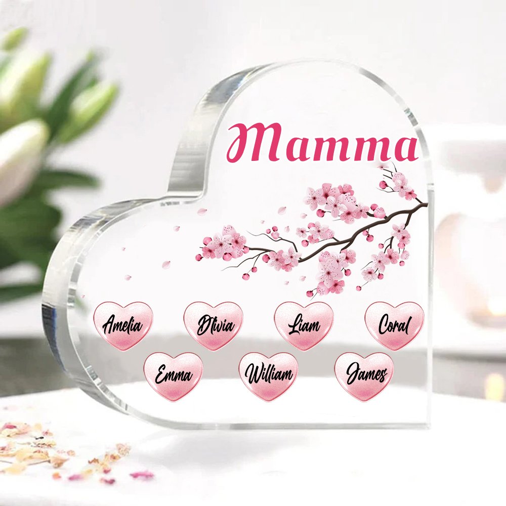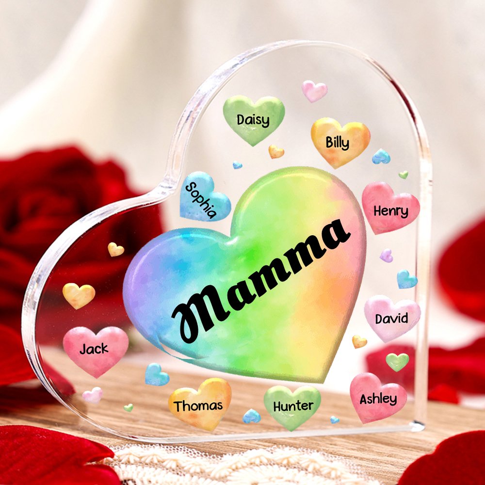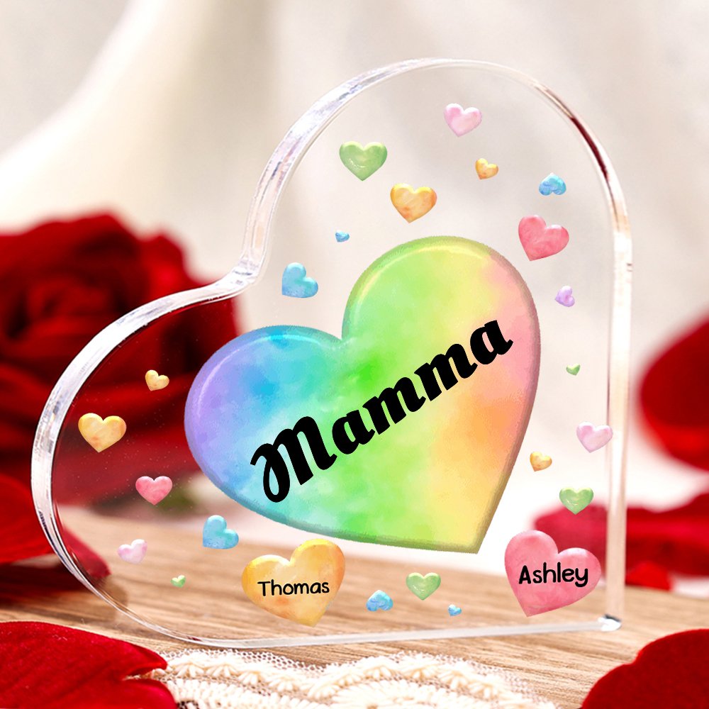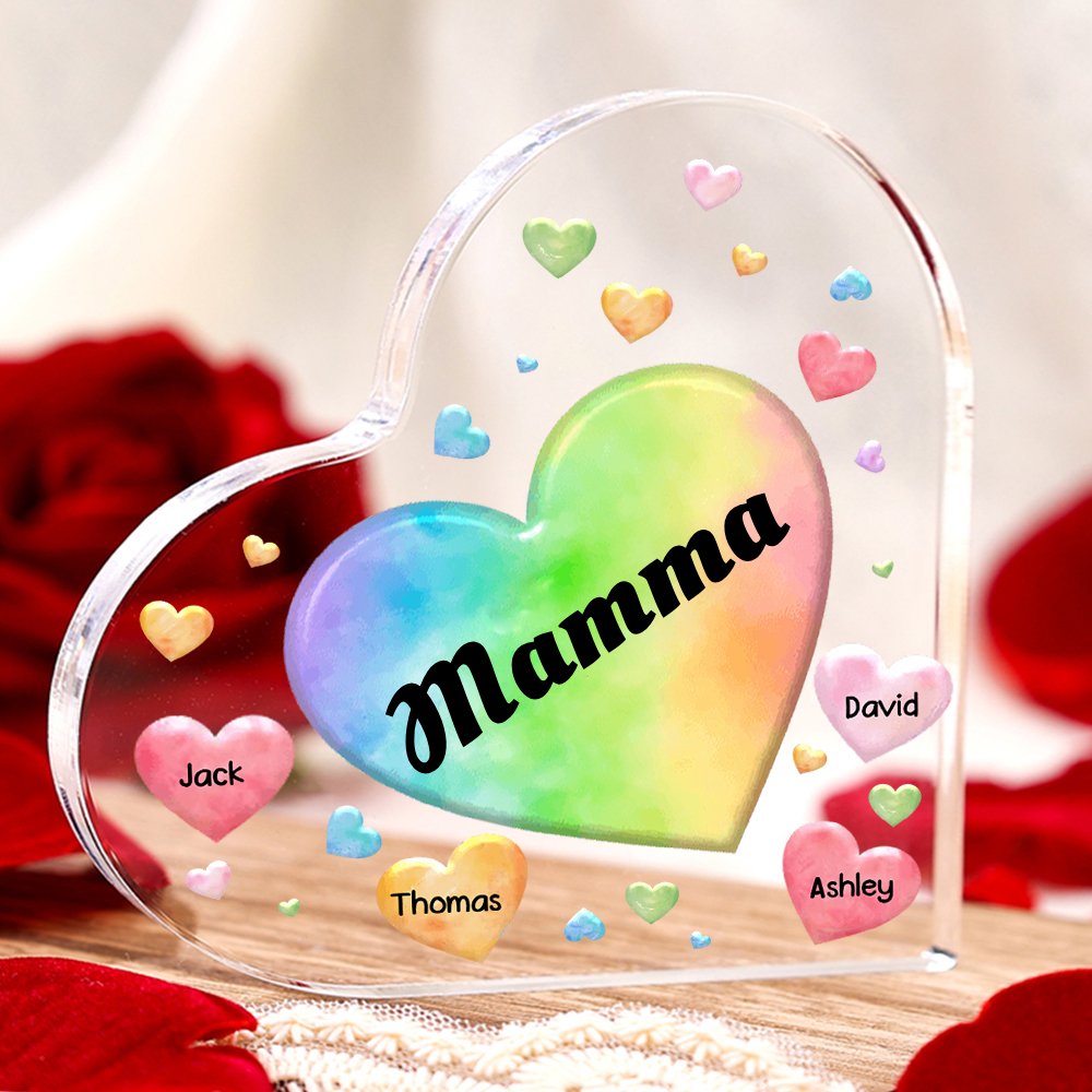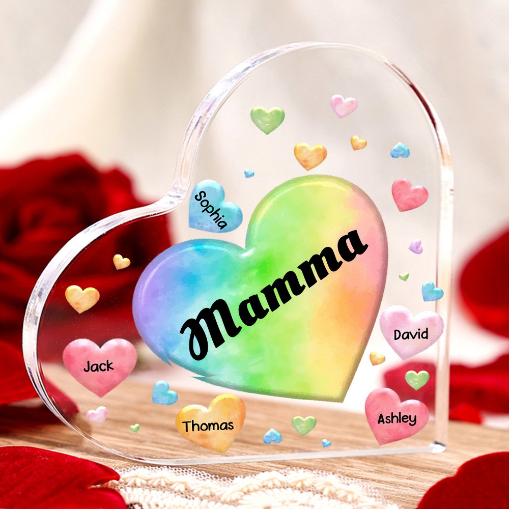 MAMMA-Decorazione acrilica cuore colorato 8 nomi e 1 testo personalizzati per mamma/nonna