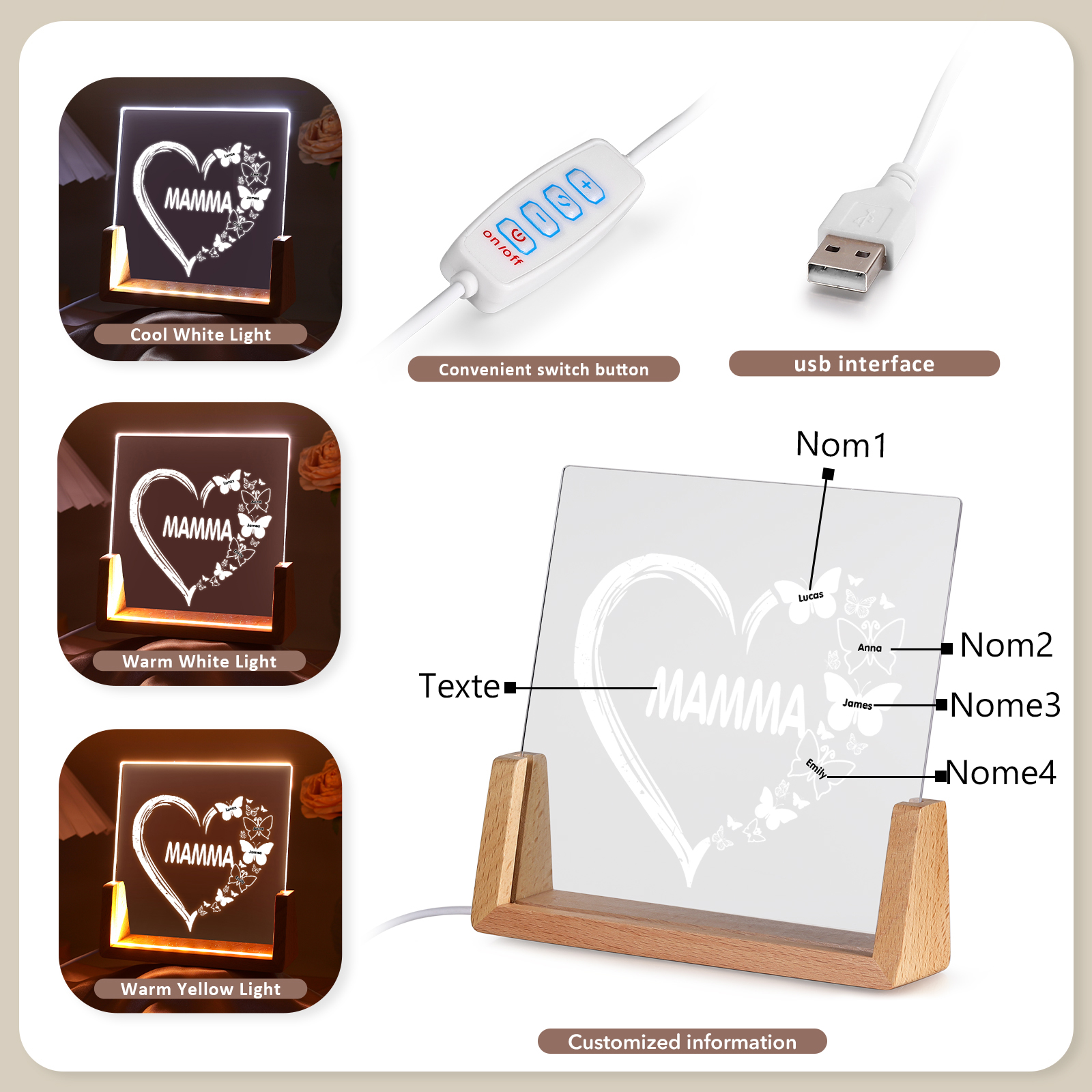 Lampada cuore e farfalle con 3 tipi di colori di LED luce 4 nomi e 1 testo personalizzati per mamma/nonna