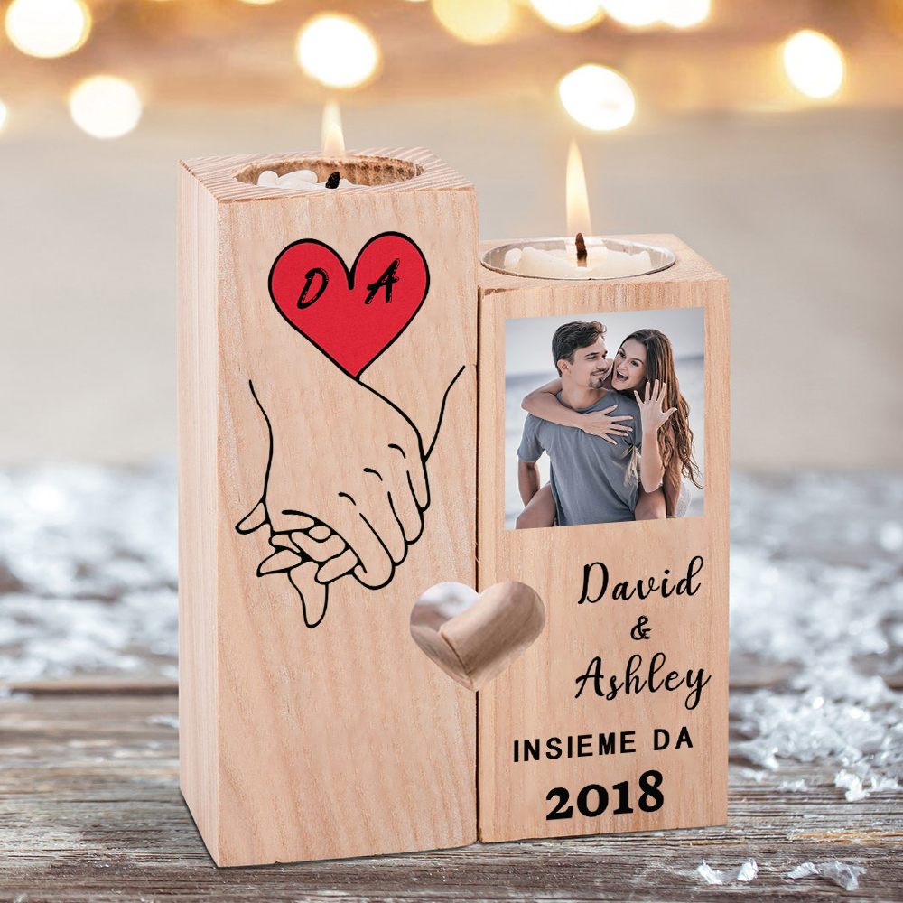 mano nella mano un cuore-Candelieri in legno 2 nomi 2 lettere 1 data e 1 foto personalizzati per coppia regalo di amore