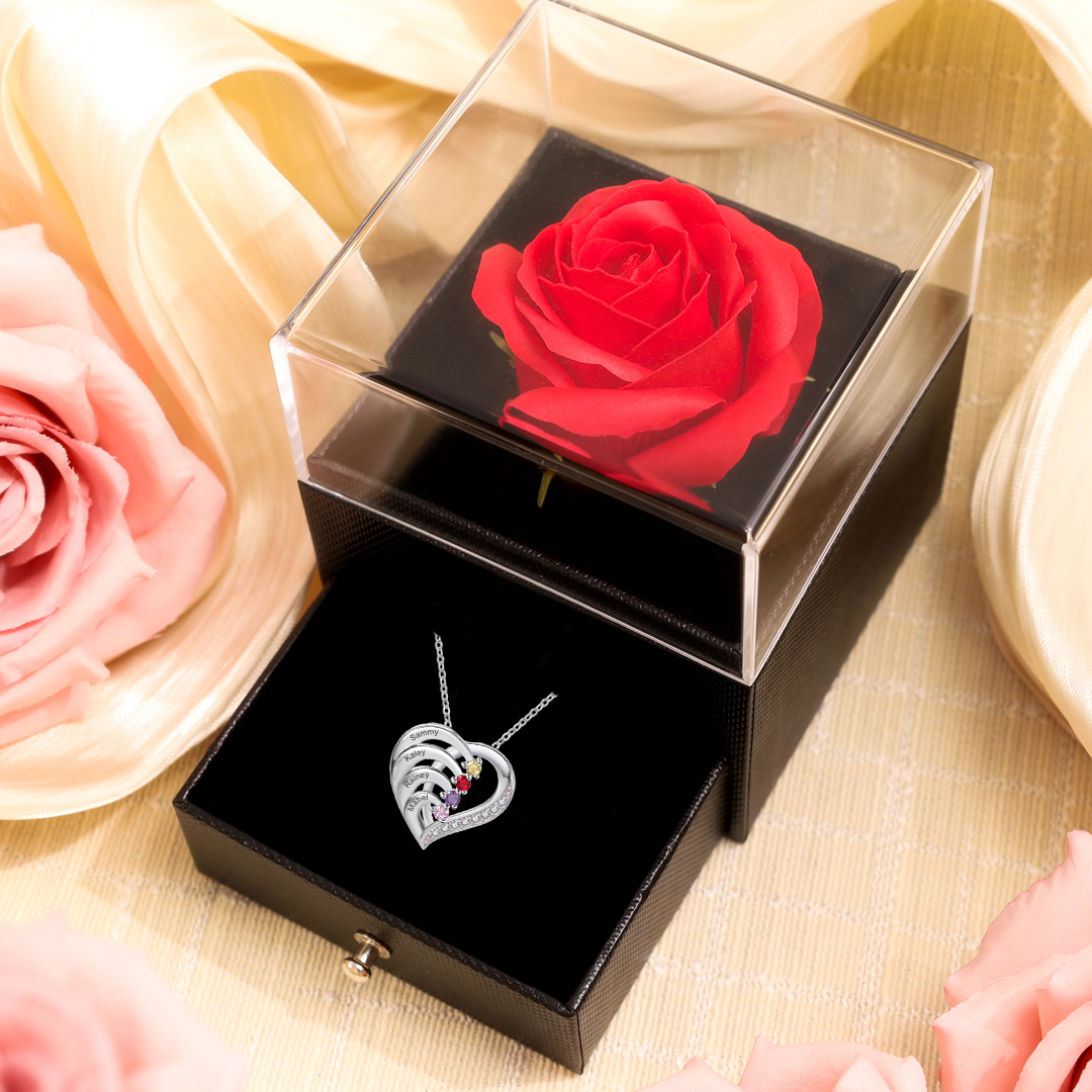 Argento S925 Collana con 4 nomi personalizzati e 4 pietre di nascita in ciondolo a cuore con scatola rosa