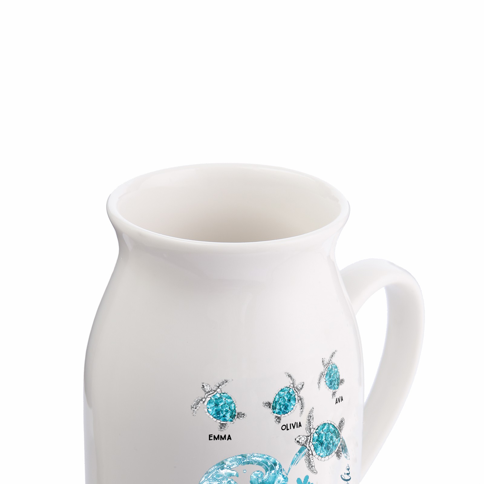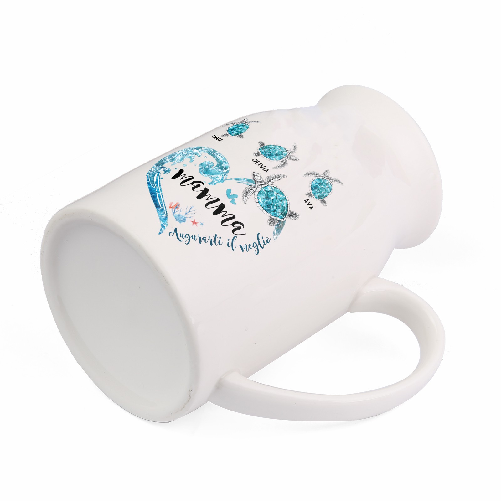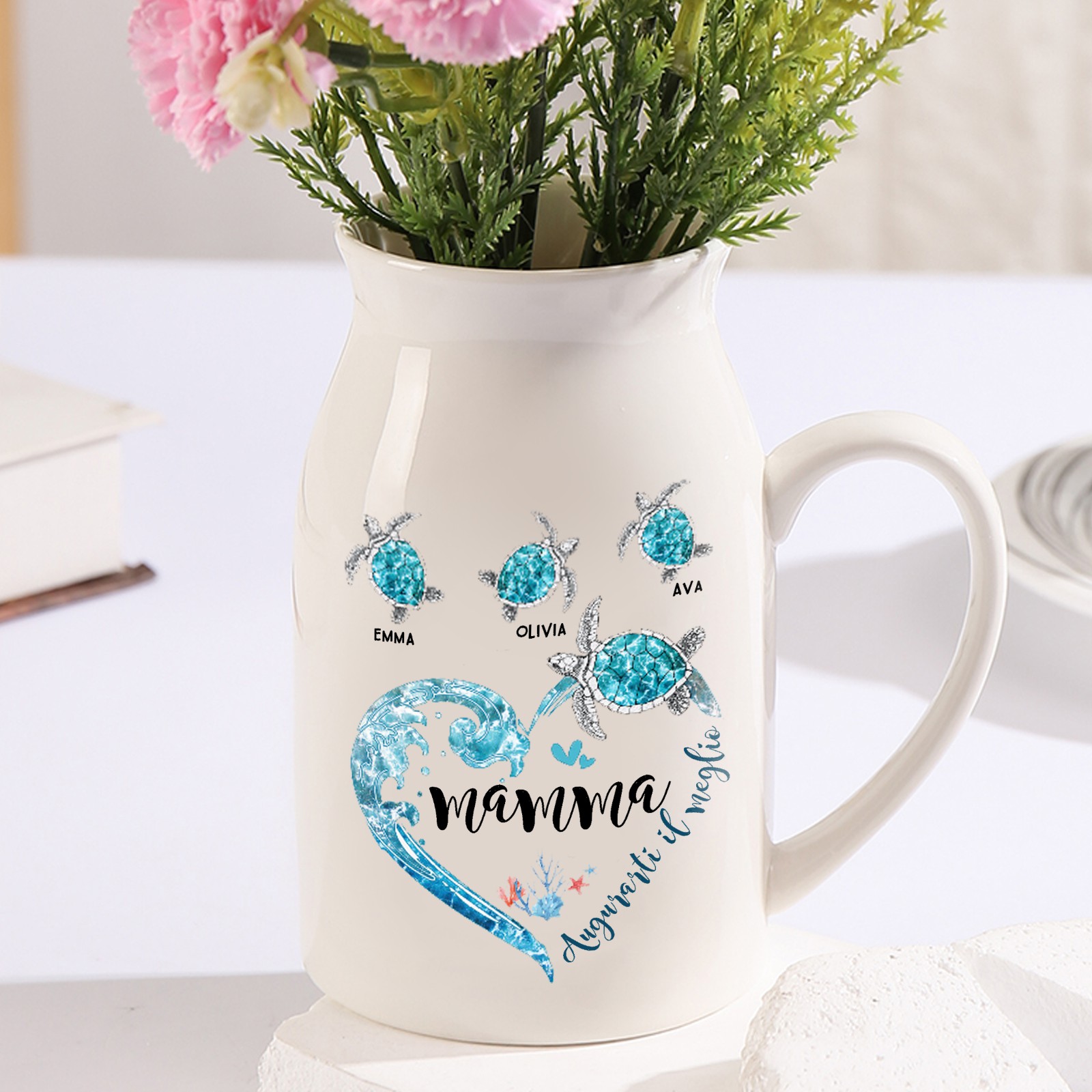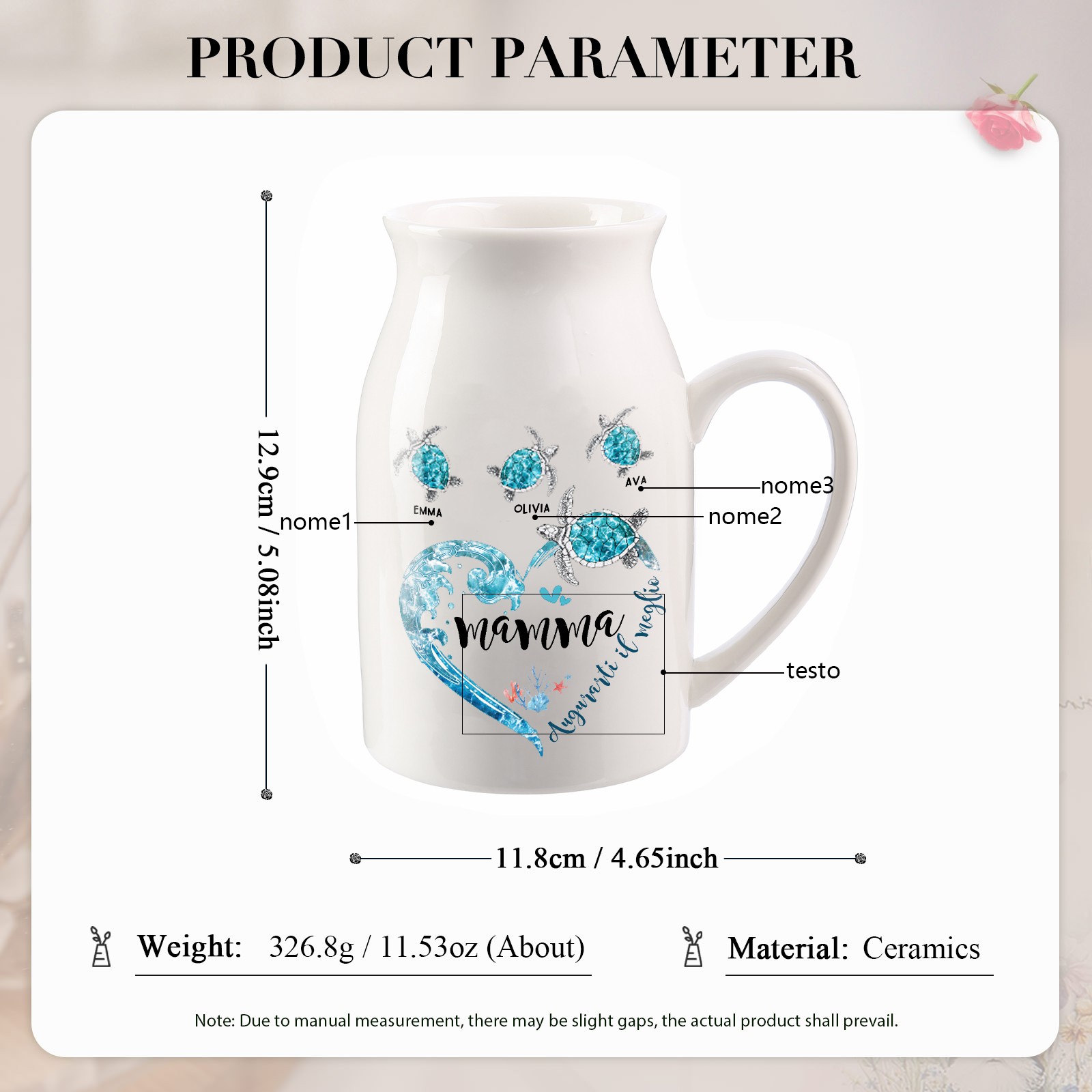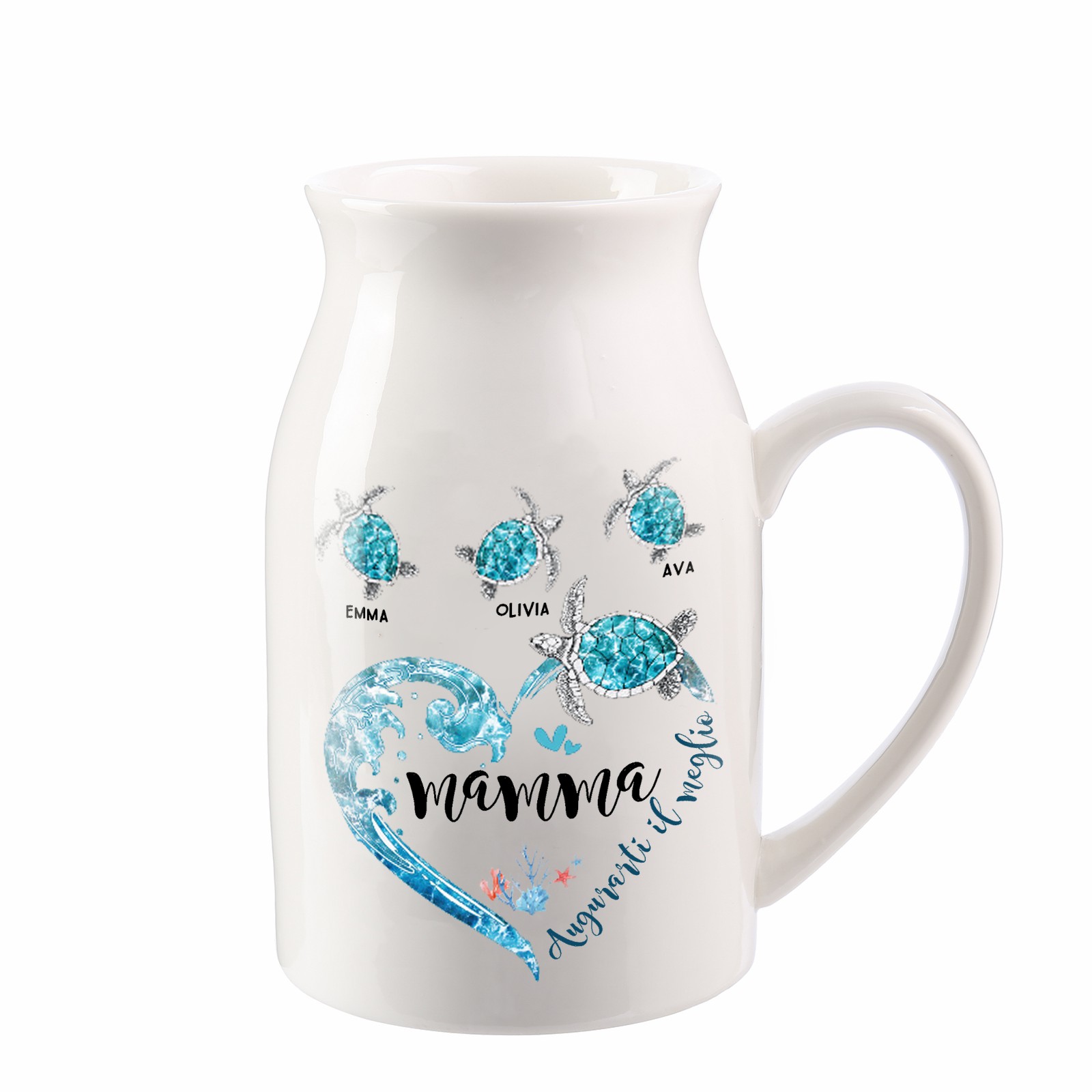 Vaso di ceramica mamma tartaruga blu personalizzato con 3 nomi e 1 testo per mamma/nonna