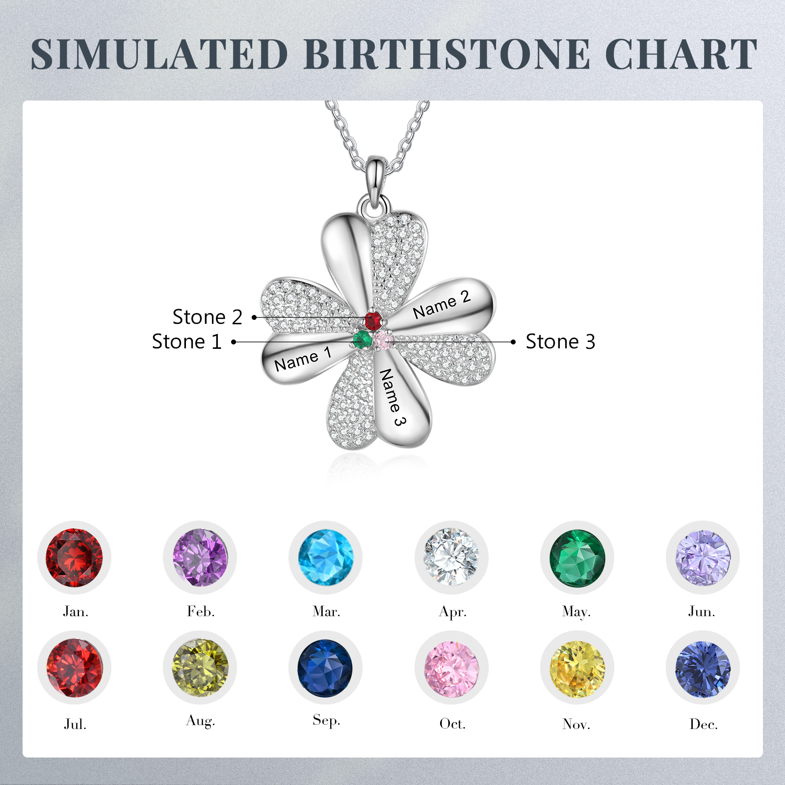 Collana con un pendente di quadrifoglio fortunato con 3 pietre di nascita e 3 nomi personalizzabili per donna
