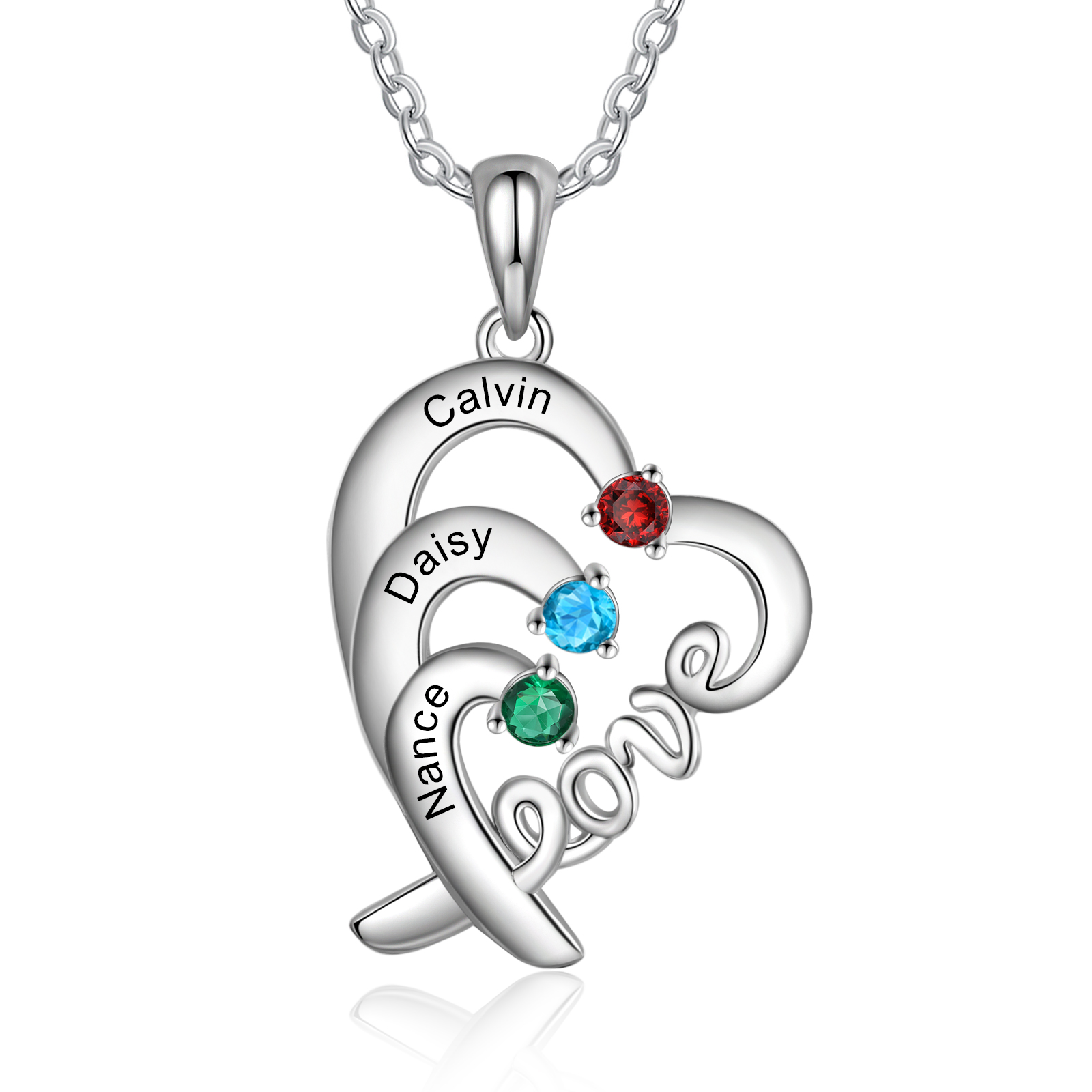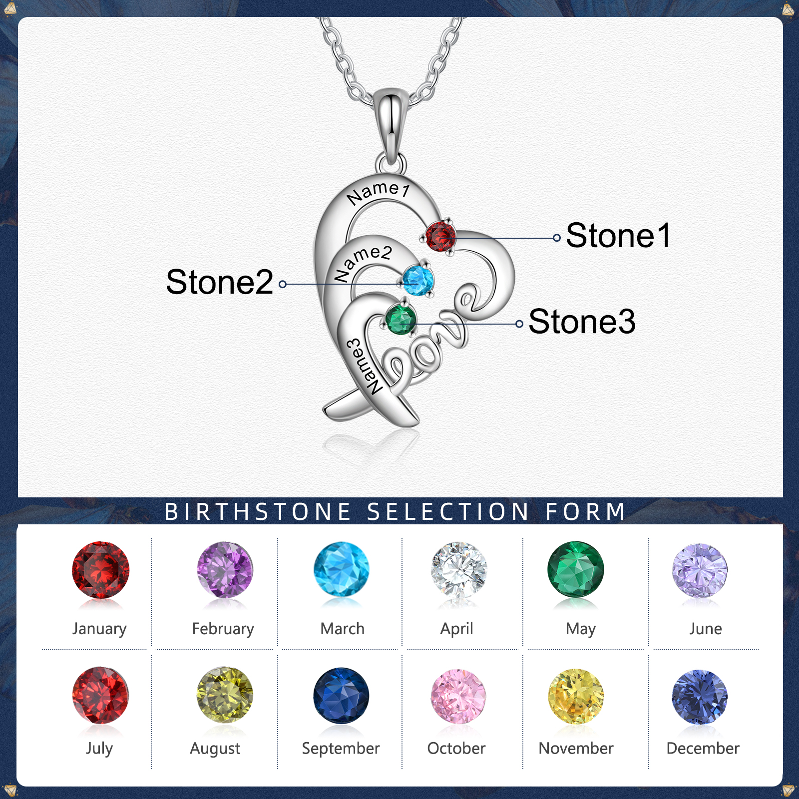 Collana con 3 nomi personalizzati e un pendente di 1 cuore pietra di nascita per donna