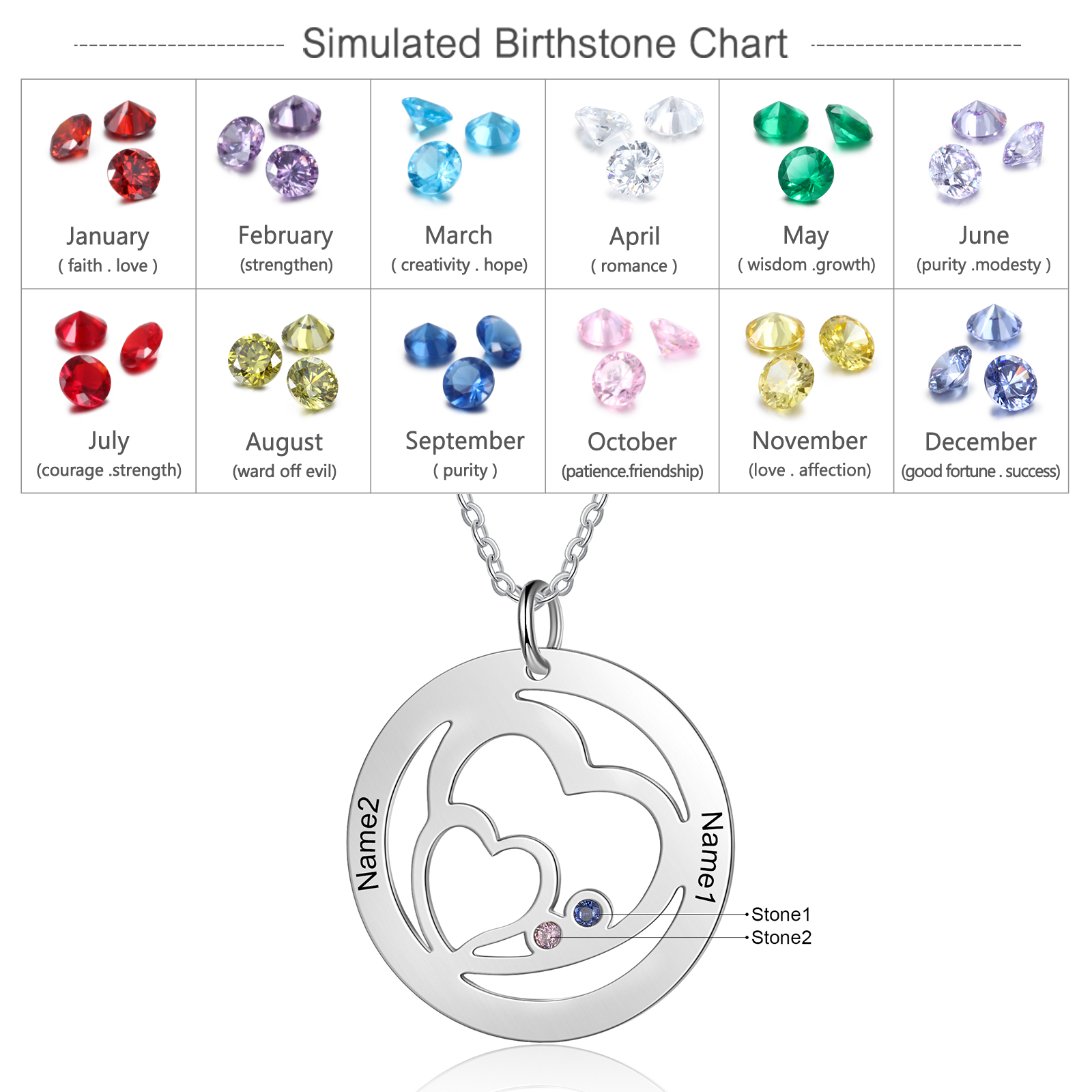 Collana con ciondolo cuore e 2 nomi e 2 pietre di nascita personalizzati regalo per donna