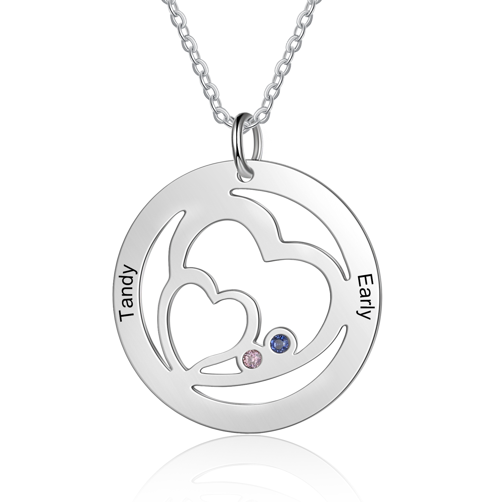 Collana cerchio e cuore nel cuore con 2 pietre di nascita e 2 nomi regalo per donna