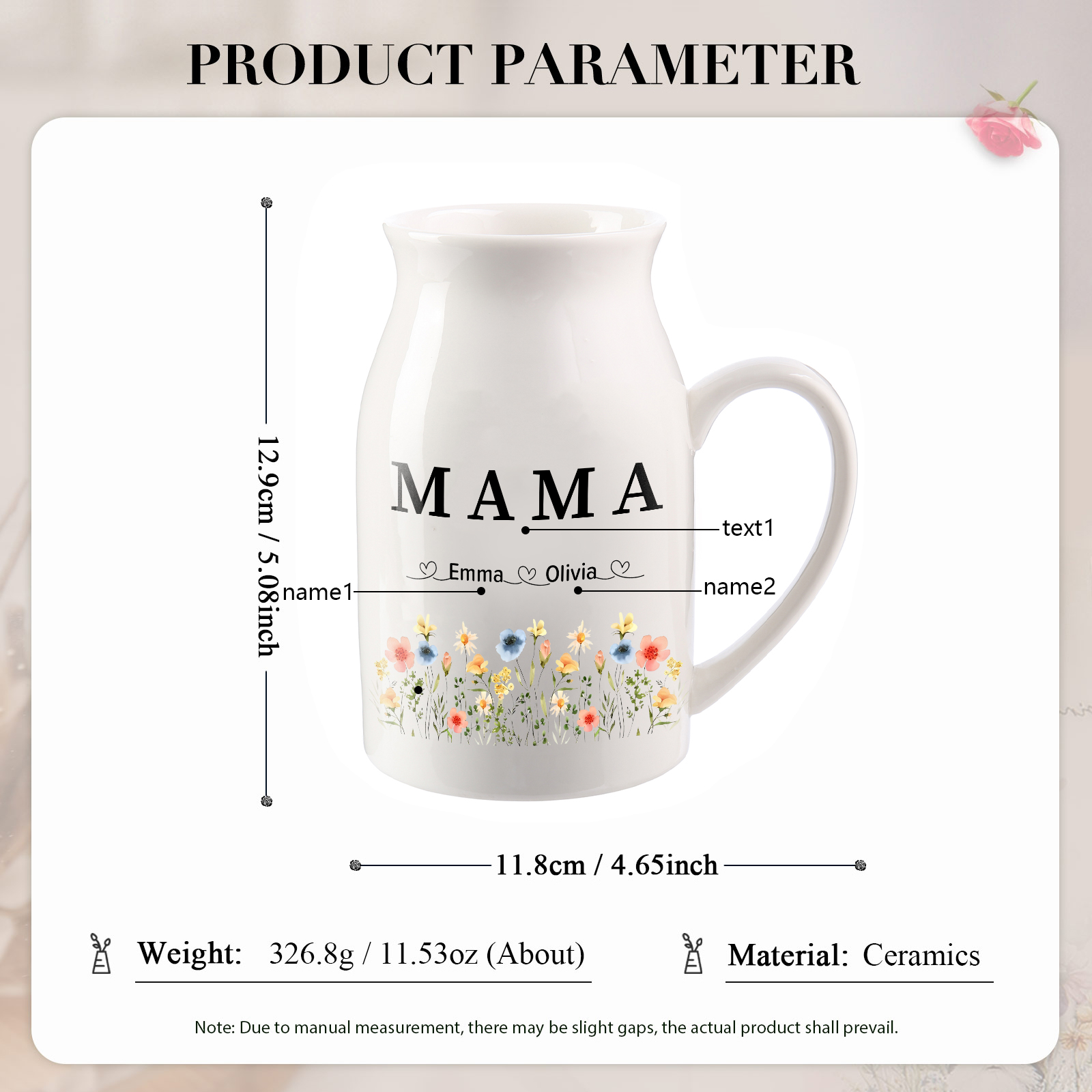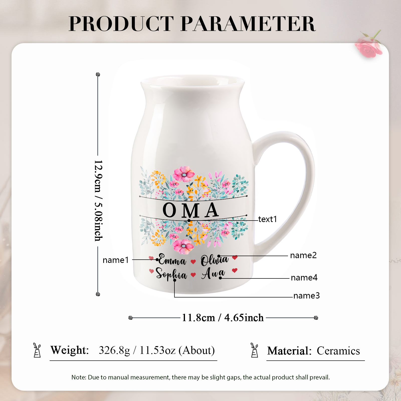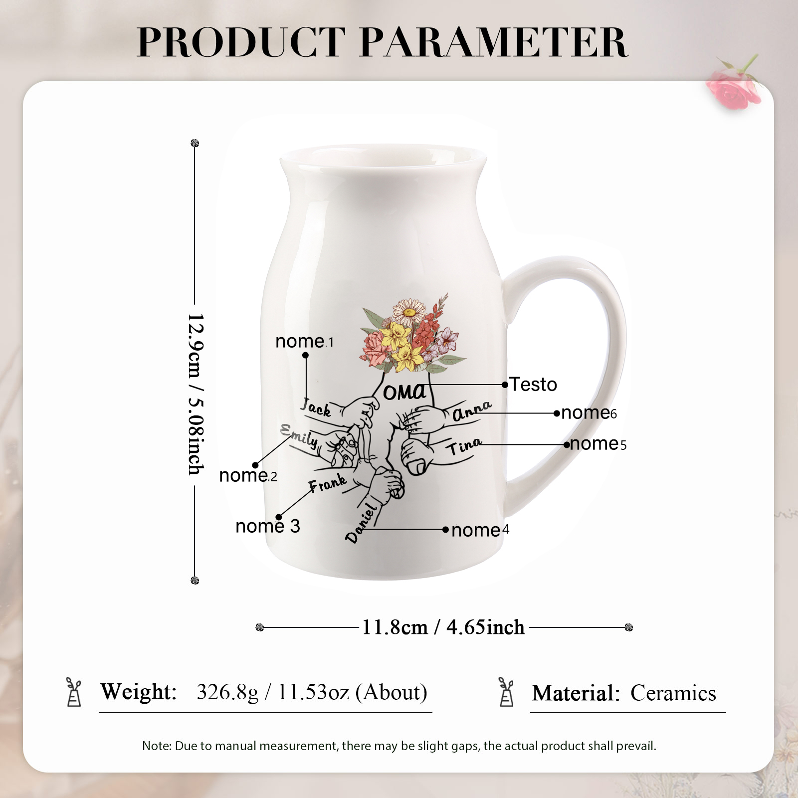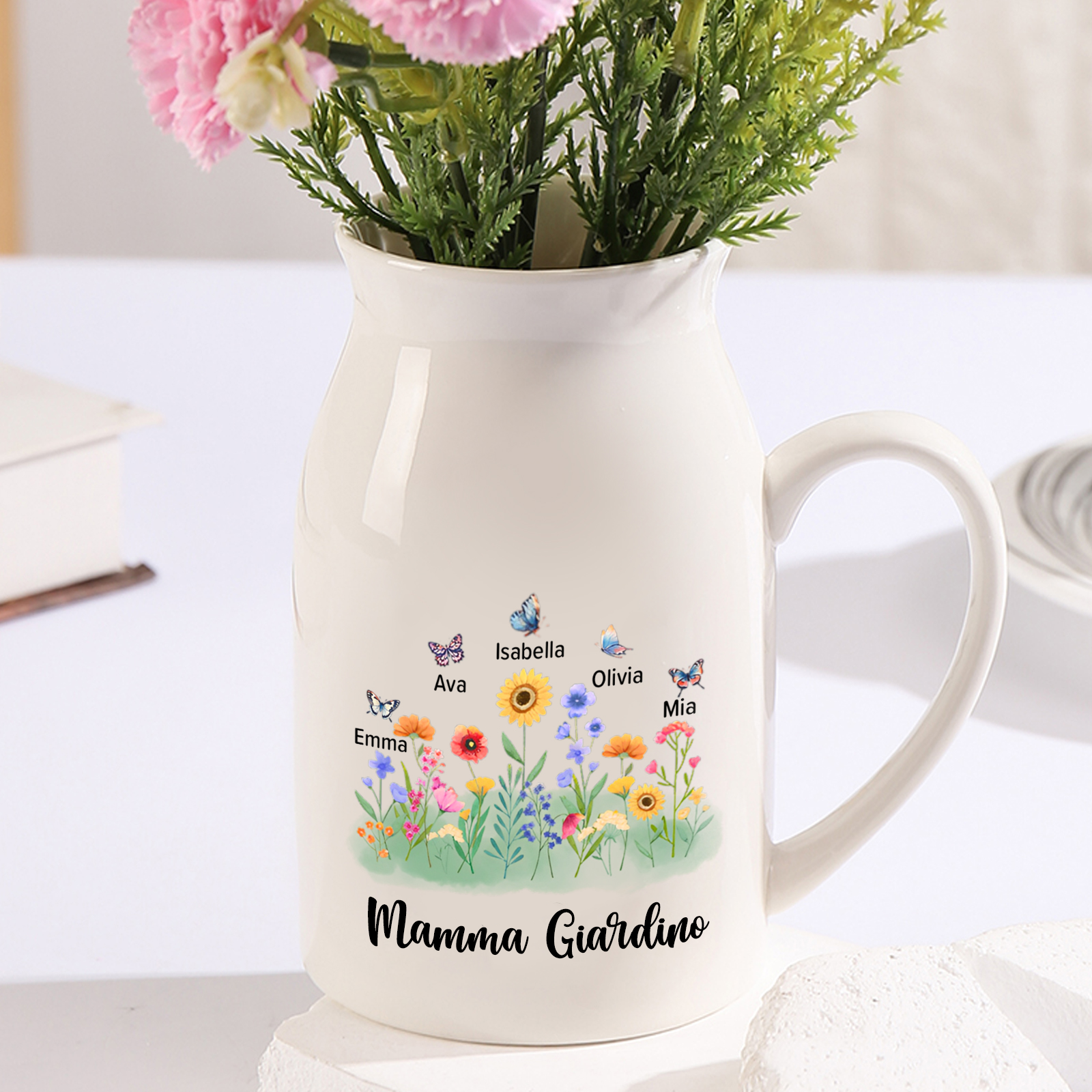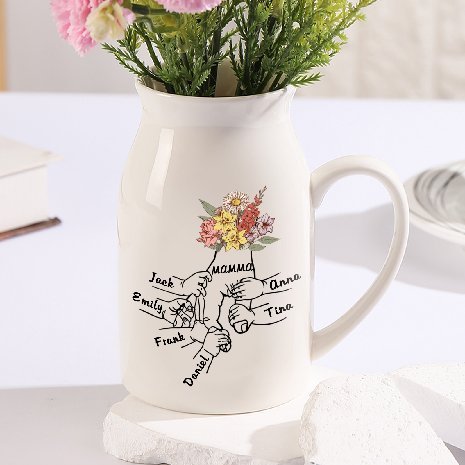 Vaso di ceramica con mano passando il fiore 7 nomi personalizzati per nonna/mamma