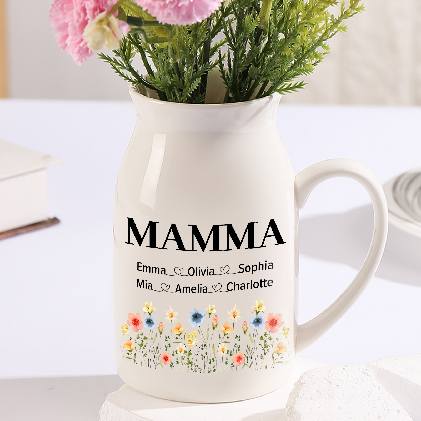 Vaso di ceramica mamma con fiori colorati personalizzato con 5 nomi e 1 testo per mamma/nonna