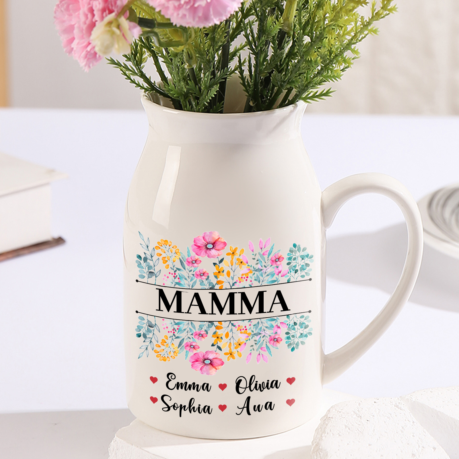 Vaso di ceramica mamma con fiore colorato personalizzato con 4 nomi e 1 testo per mamma/nonna