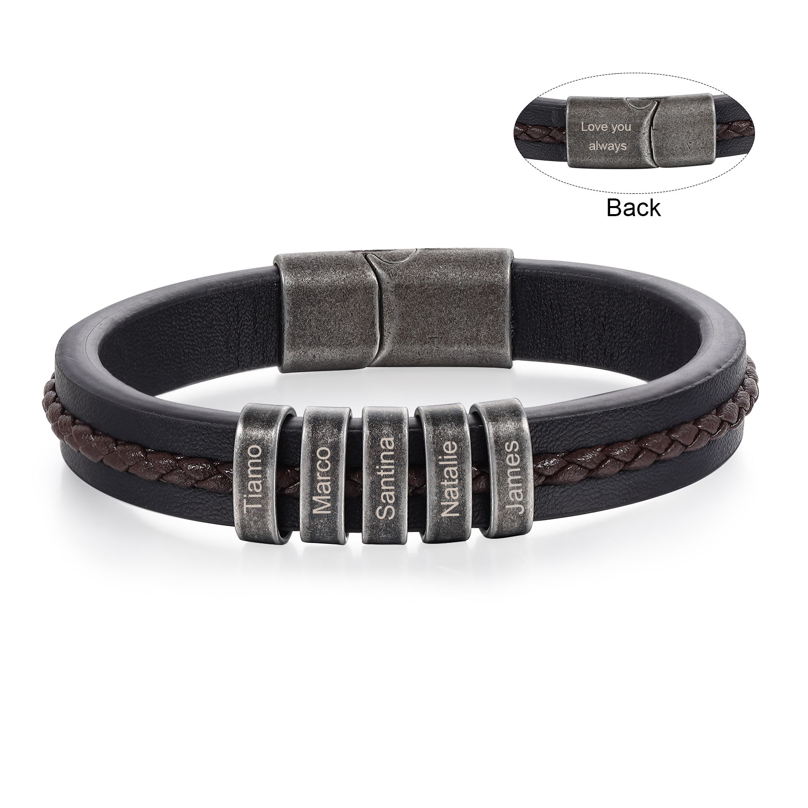 Bracciale vintage infinito in pelle personalizzato da uomo con 2 nomi data e perlina in acciaio inossidabile