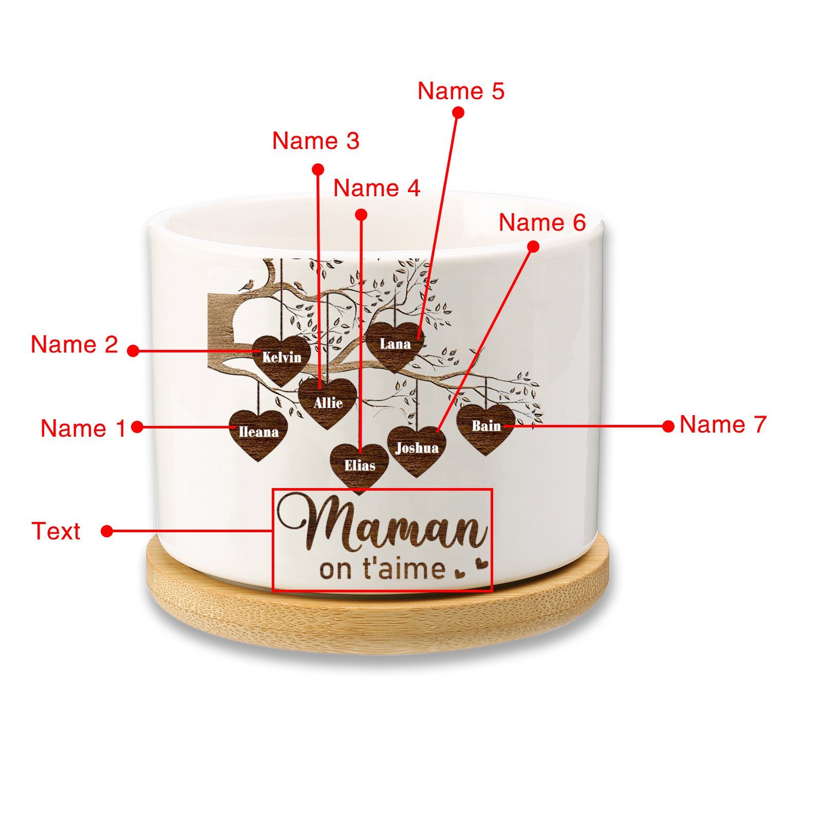 Vaso per fiori mamma albero e cuore personalizzato con 3 nomi e 1 testo per famiglia