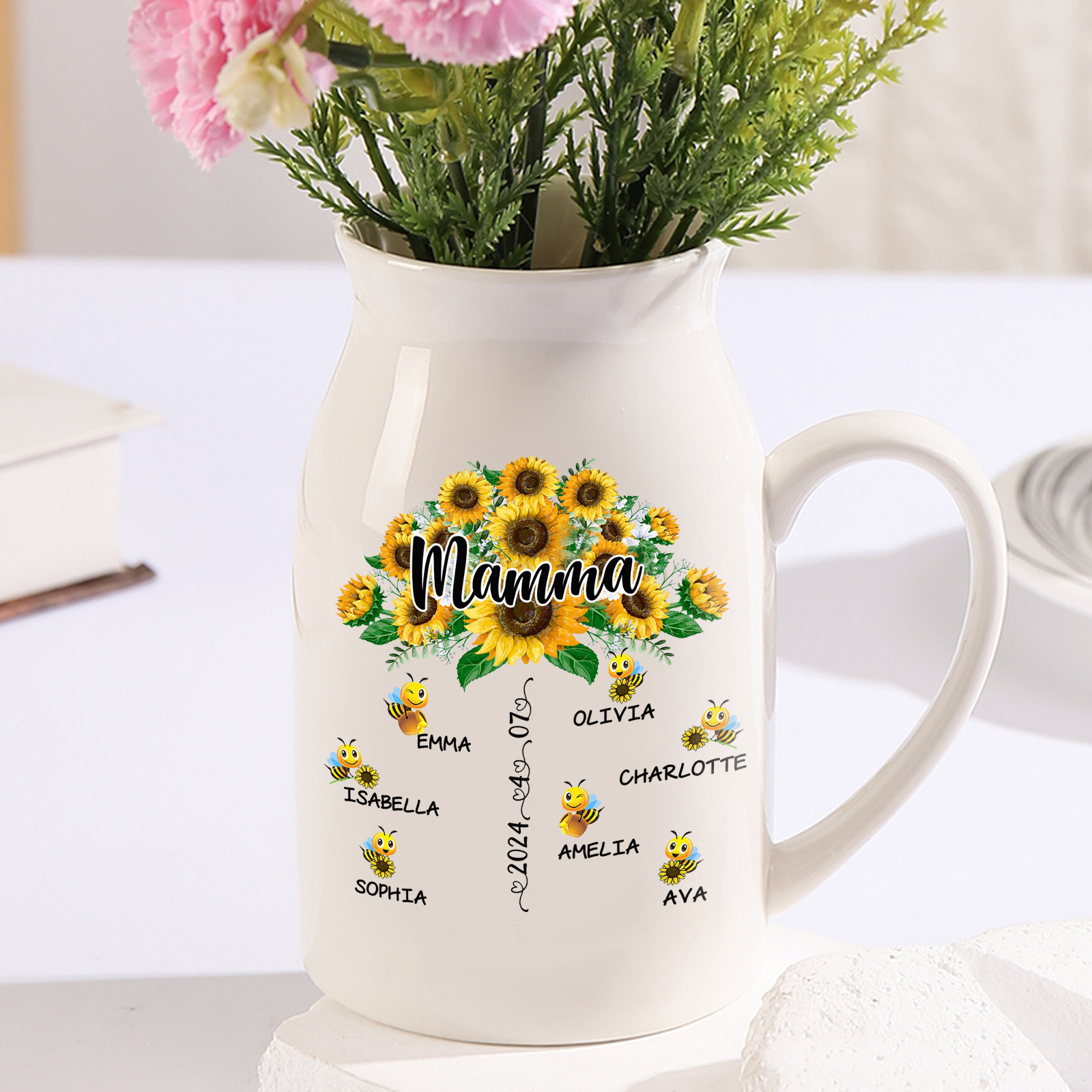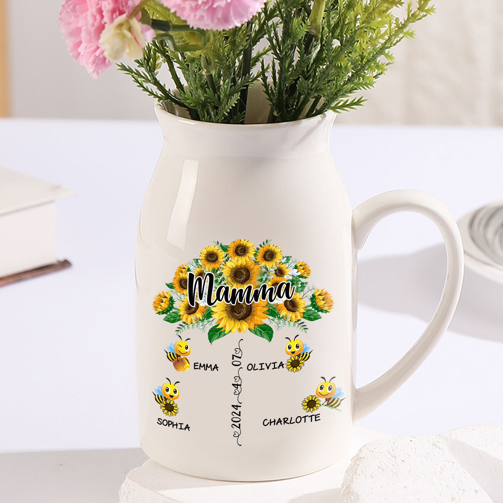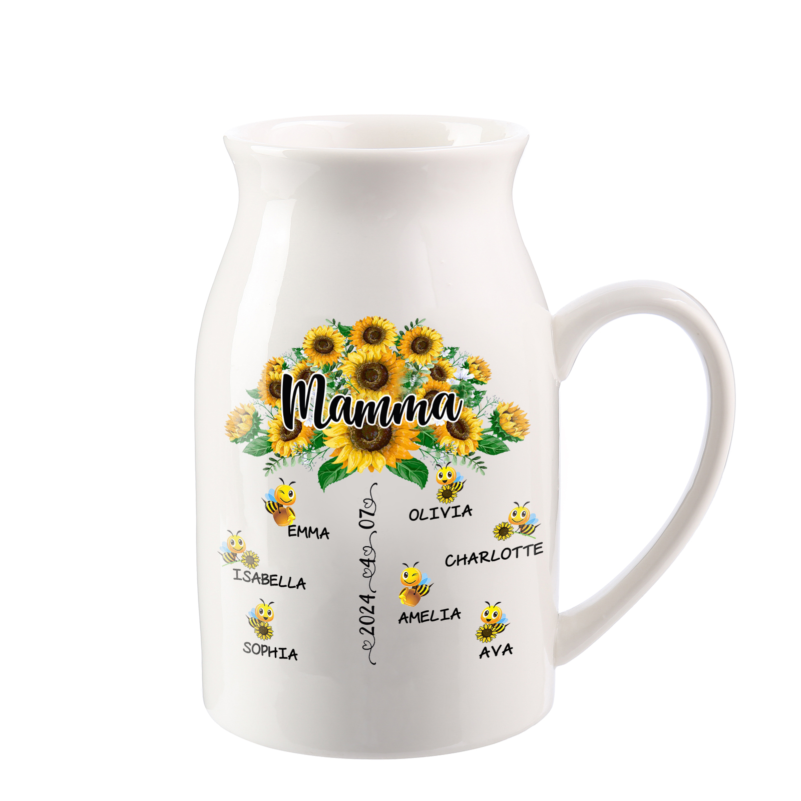 Vaso di ceramica mamma girasole personalizzato con 4 nomi e 1 testo e 1 data per mamma/nonna