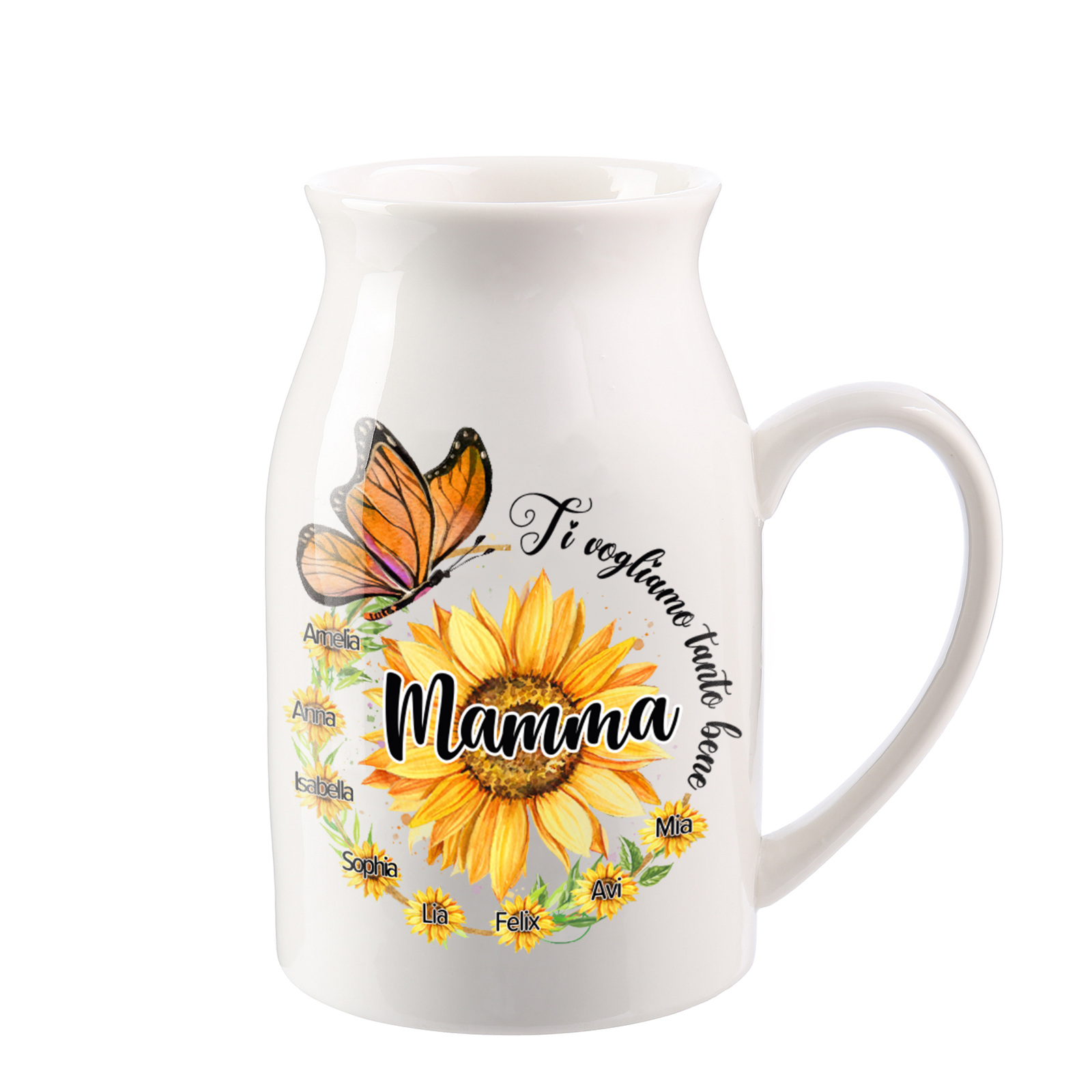 Vaso di ceramica mamma con girasole e farfalla personalizzato con 8 nomi e 2 testi per mamma/nonna