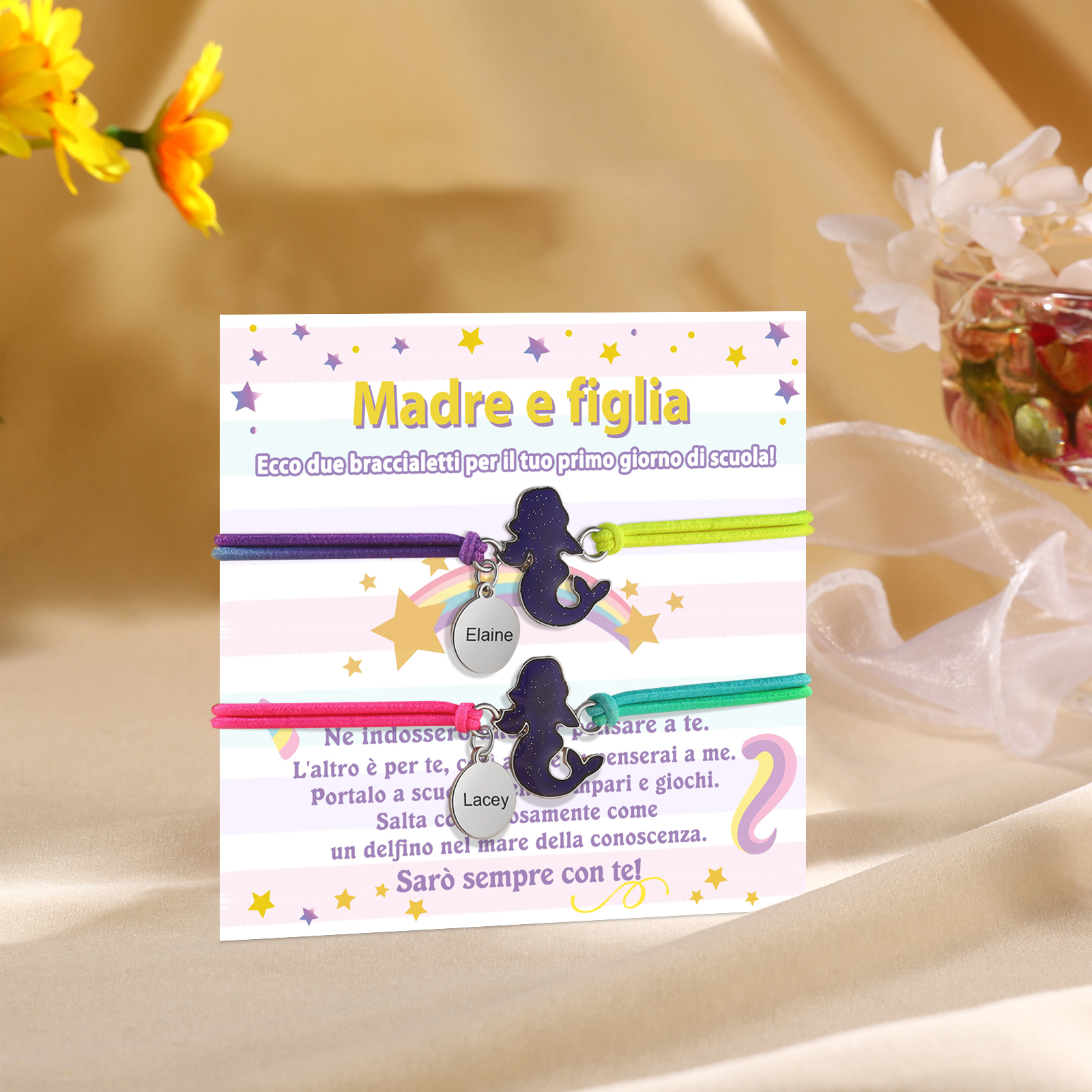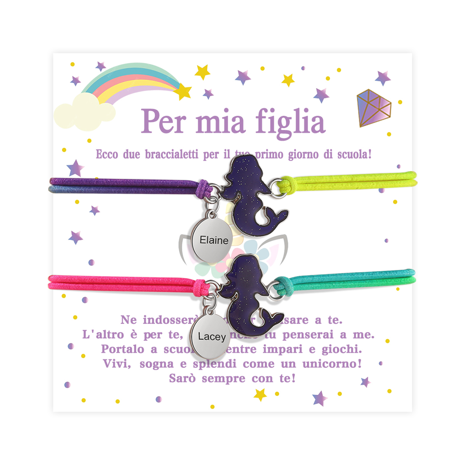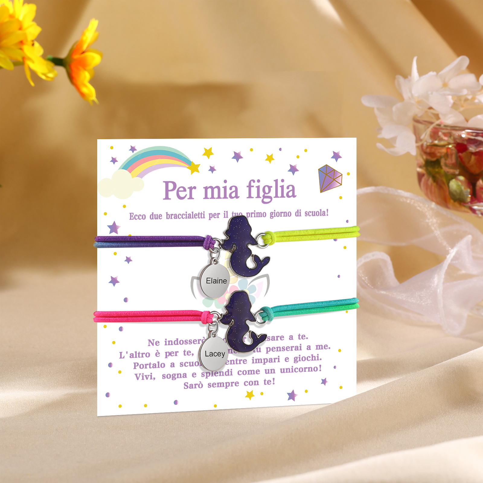 2PCS Braccialetto/Fasce per i capelli con sirene 2 nomi personalizzati regalo per i bambini con carta