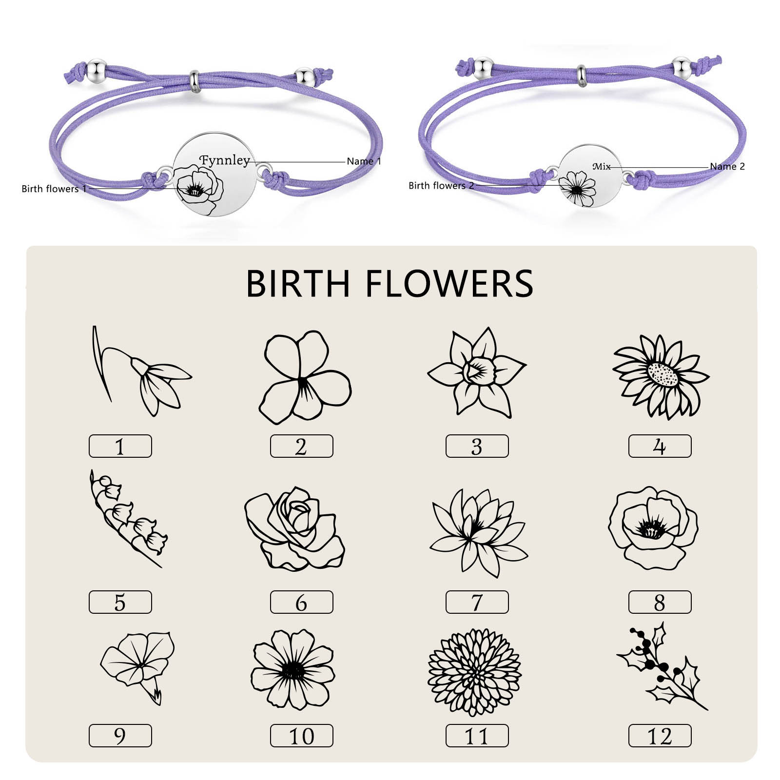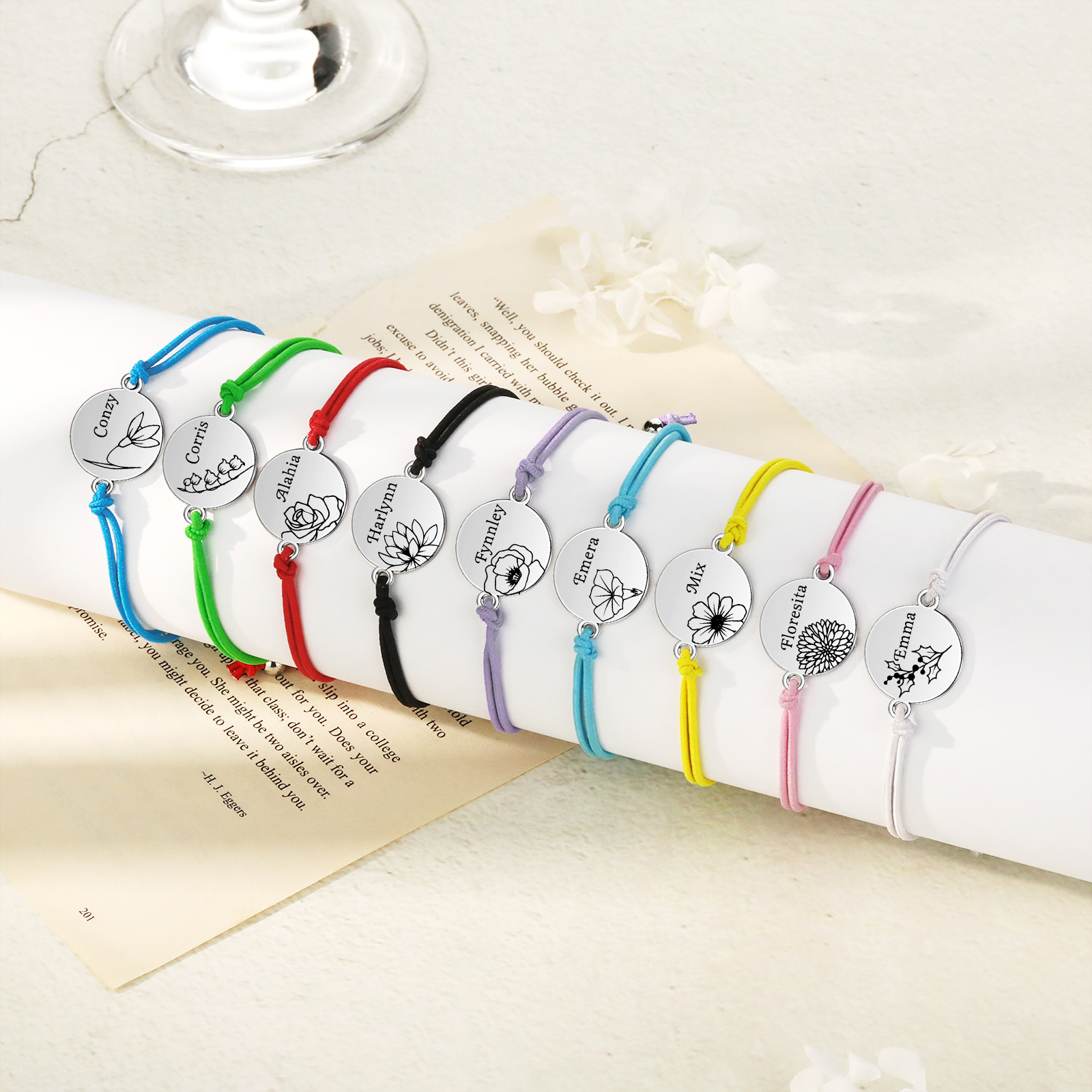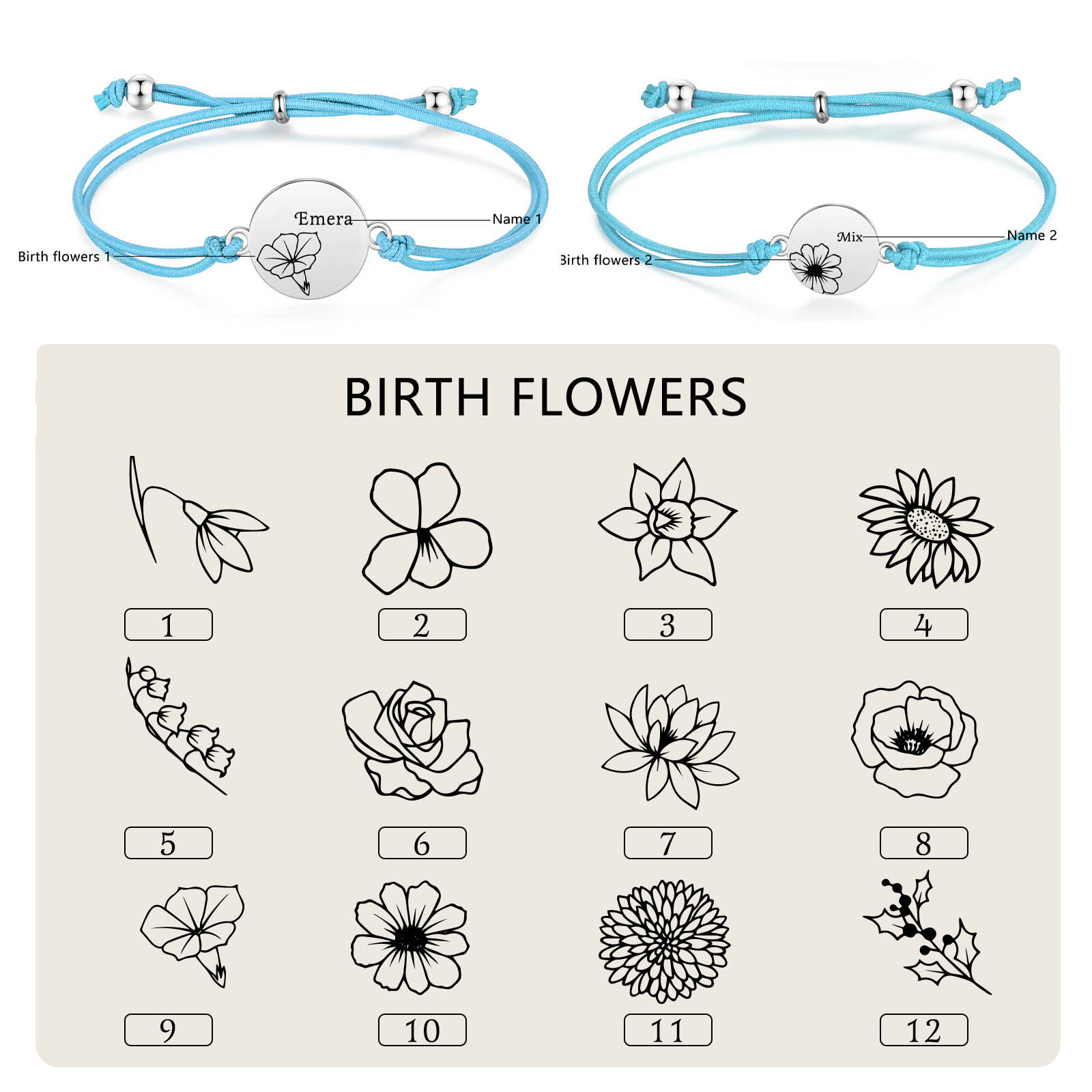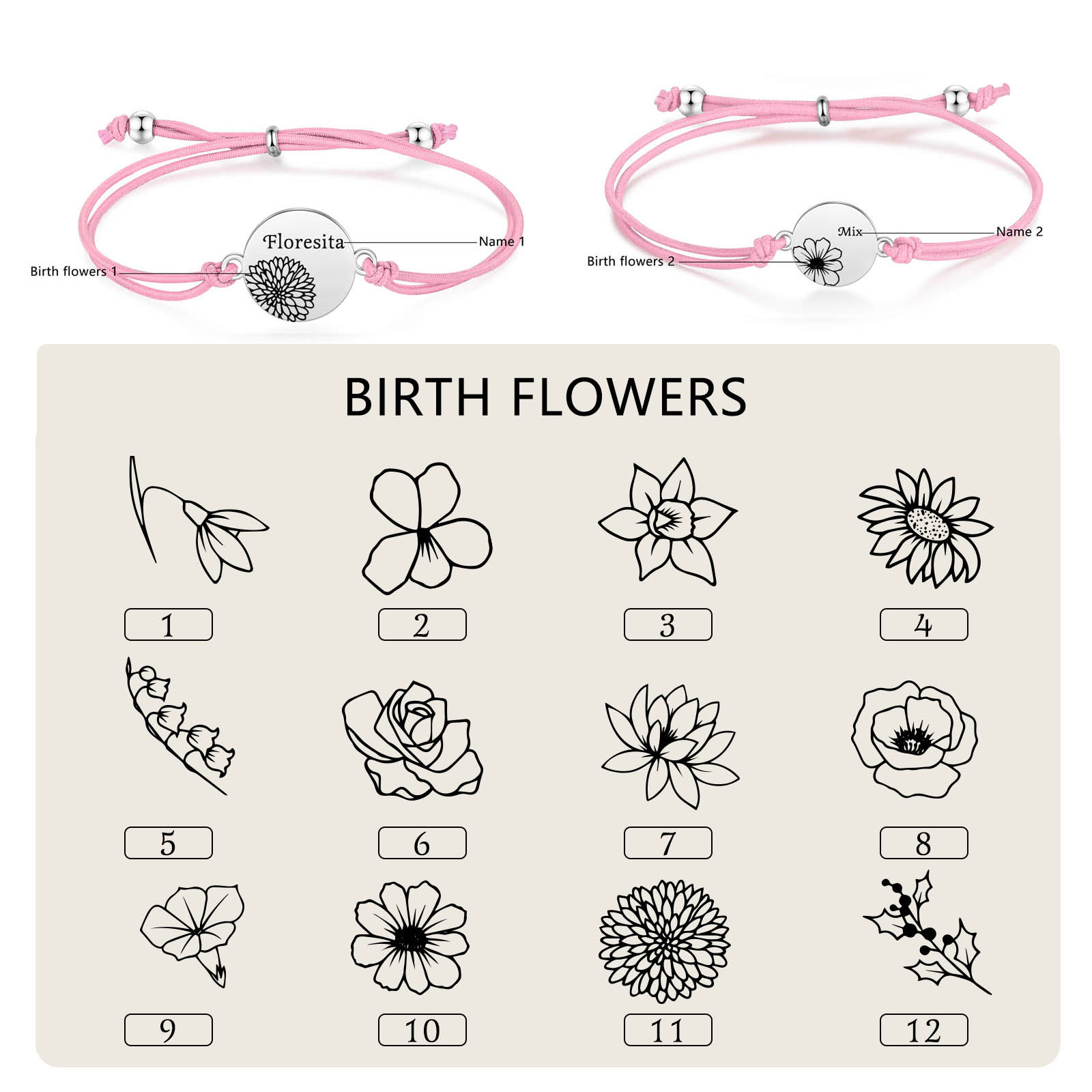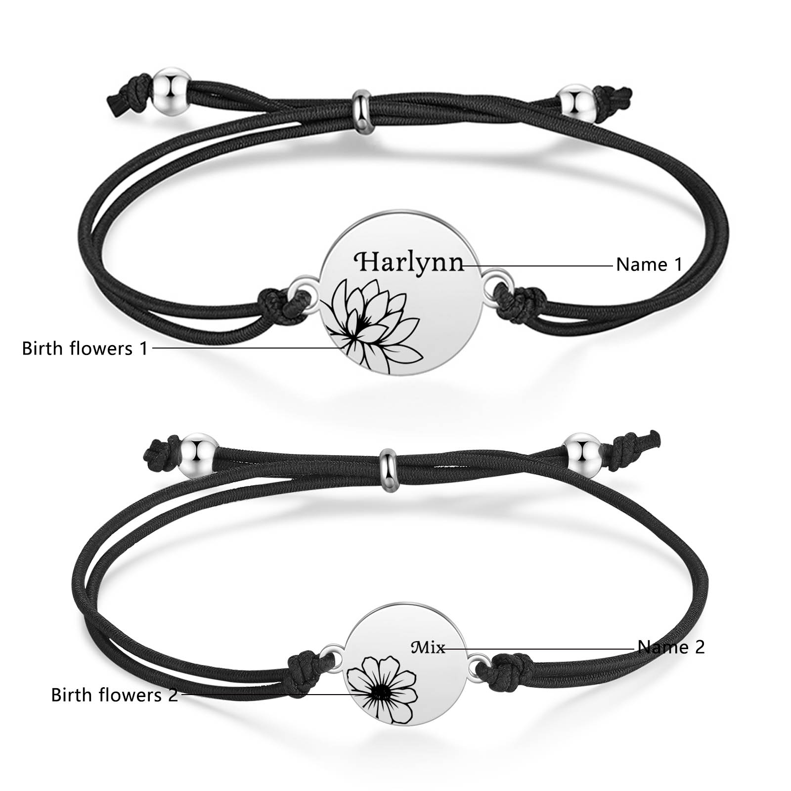 2PCS Braccialetto/Fasce per i capelli fiore di nascita con 2 nomi e 2 fiori personalizzati regalo per bambina/donna multicolori da scegliere