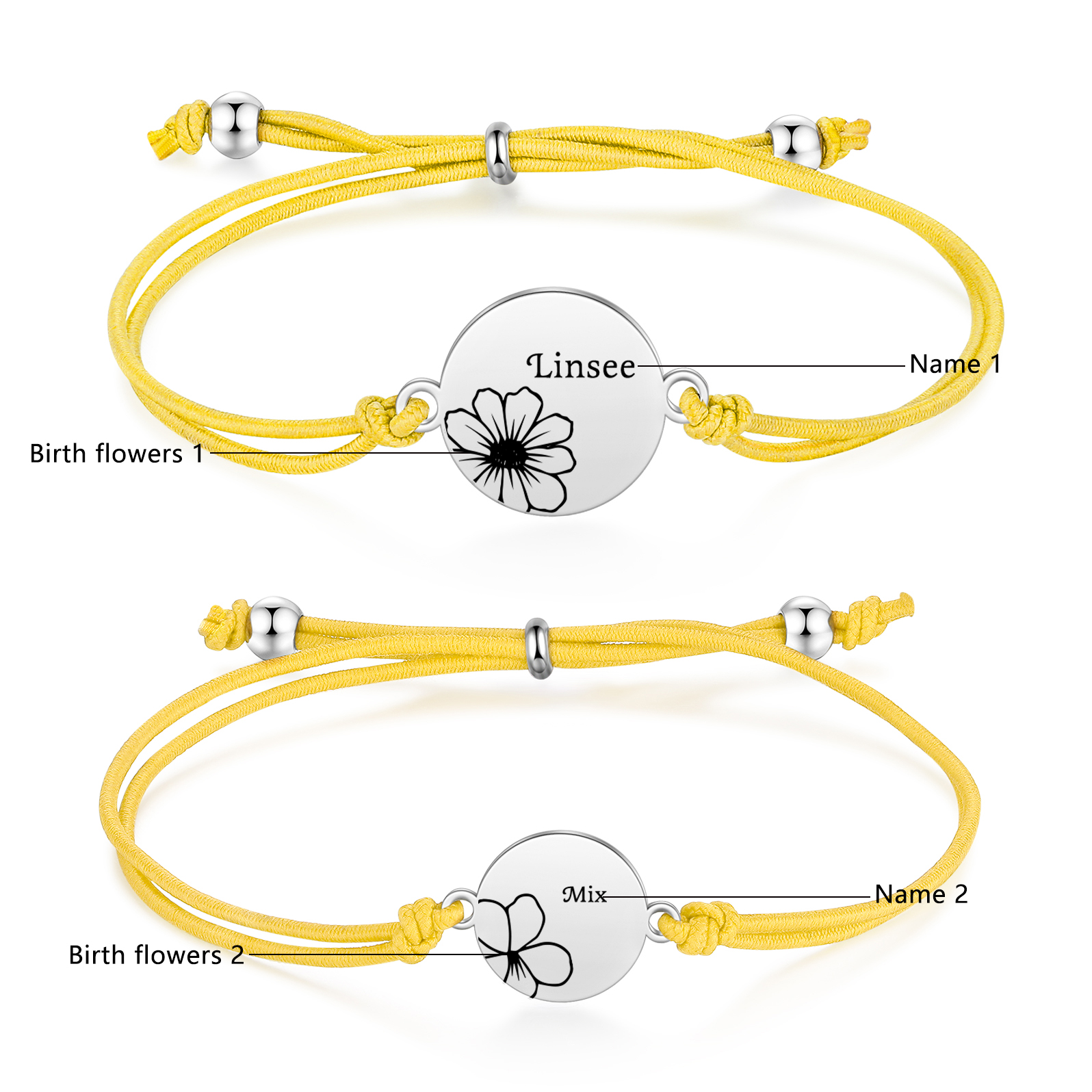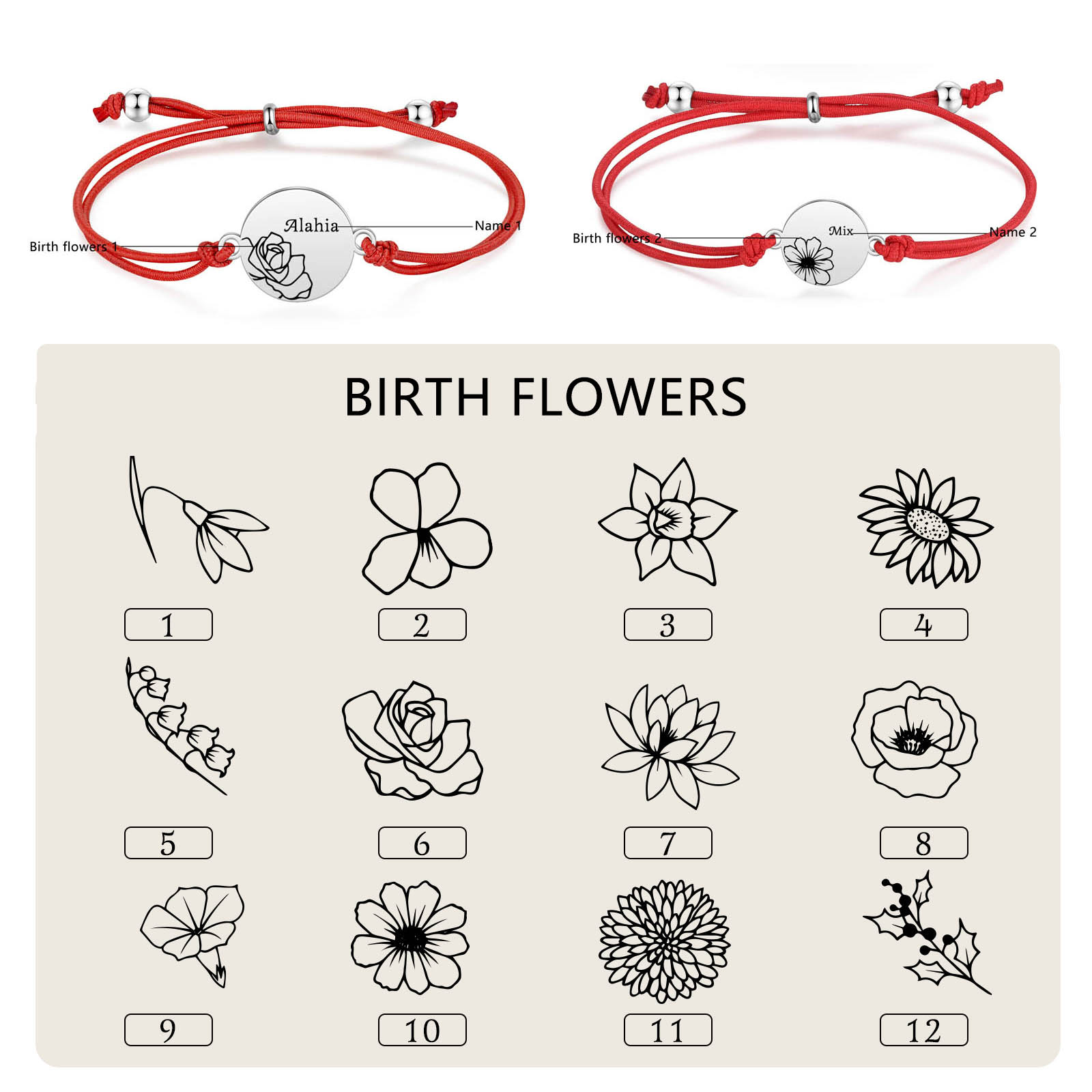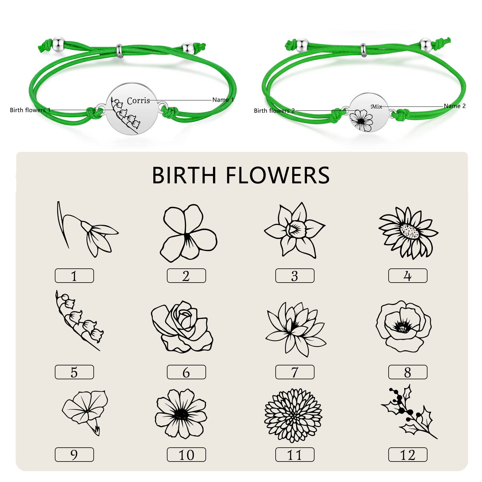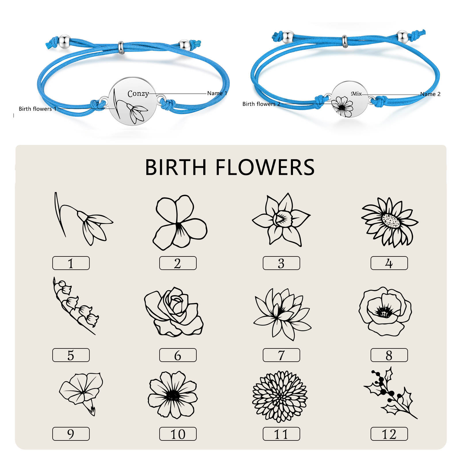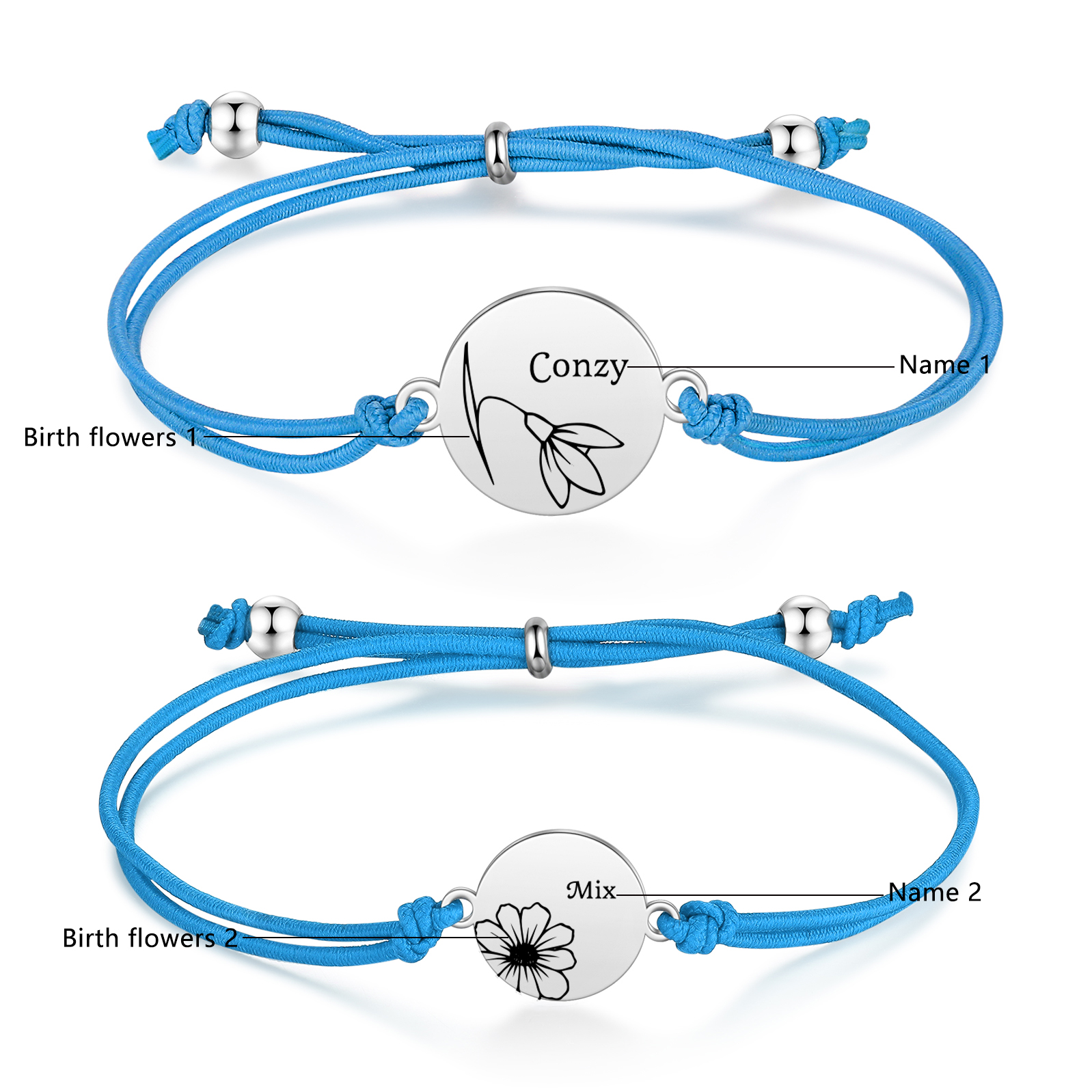 2PCS Braccialetto/Fasce per i capelli fiore di nascita con 2 nomi e 2 fiori personalizzati regalo per bambina/donna multicolori da scegliere