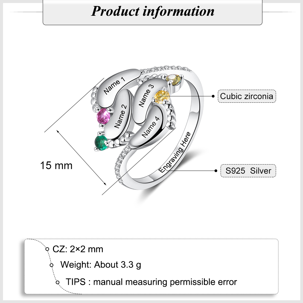 Anello d'argento 925 con 4 piedi di bambino e 4 nomi e 4 pietre di nascita e 1 testo personalizzati regalo per donna