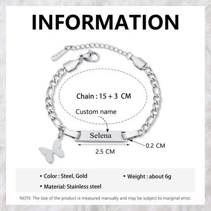 Bracciale Colore Argento Oro a Farfalla Animali personalizzato con 1 nome regalo di Compleanno per bambini ragazzi
