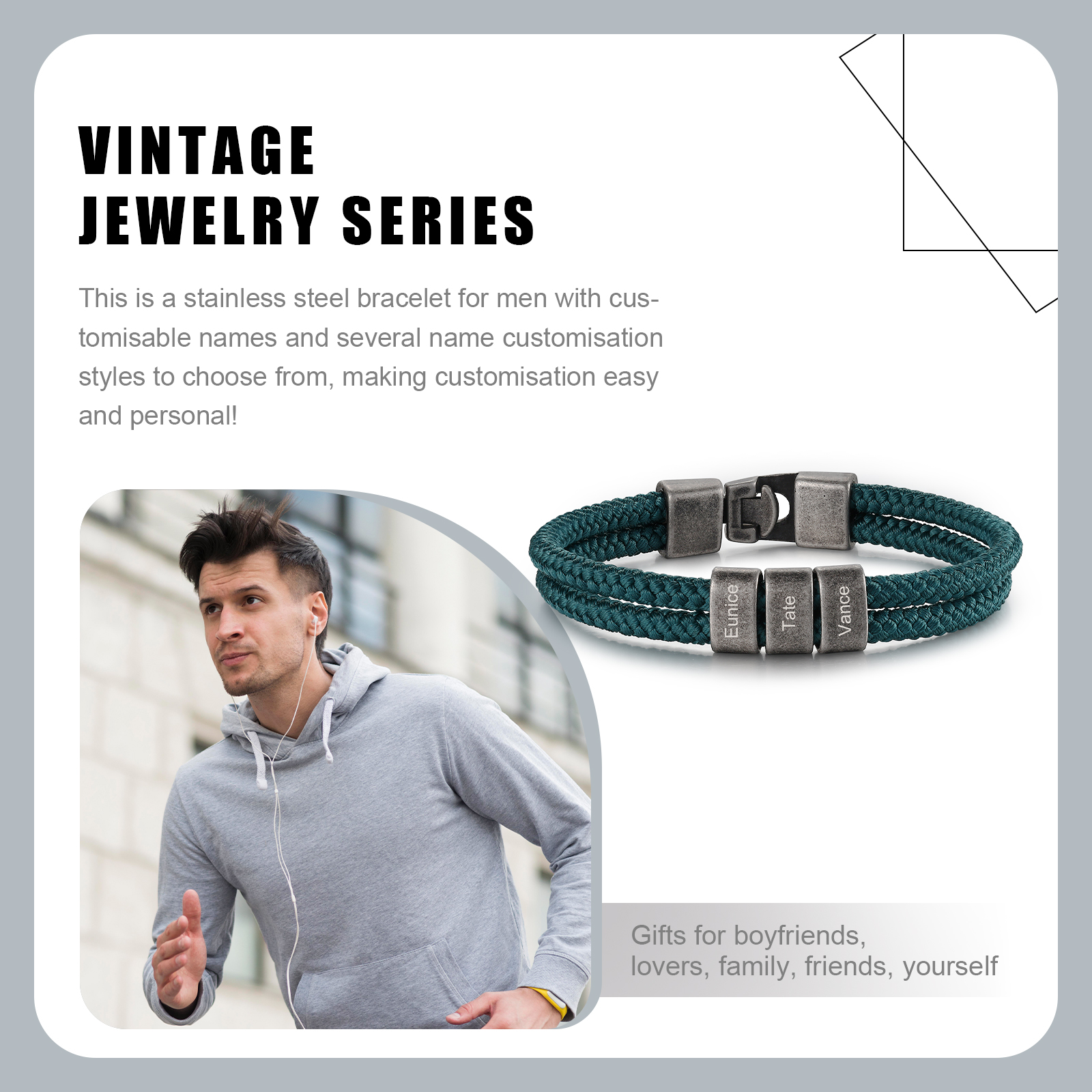 Bracciale marinario menta a corda per uomo 3 nomi personalizzati
