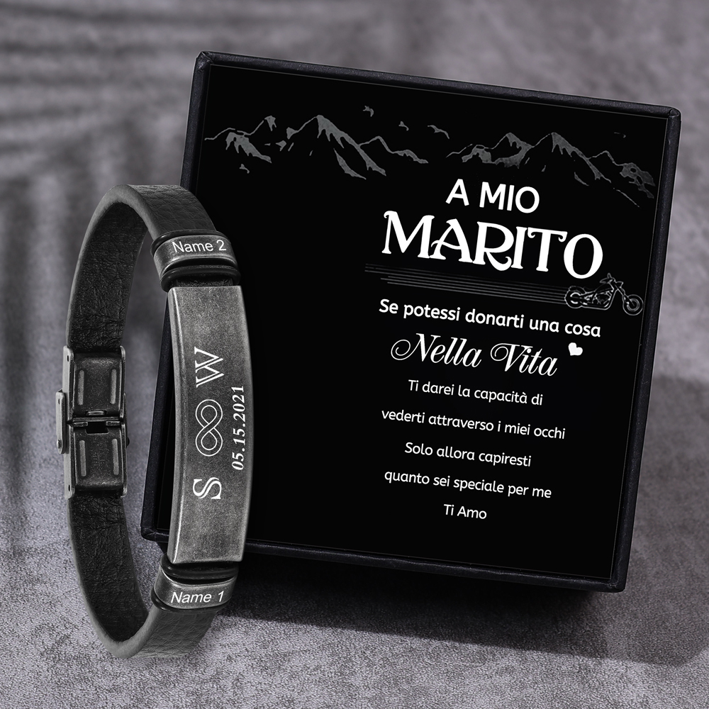Bracciale vintage infinito in pelle personalizzato da uomo con 2 nomi data e perlina in acciaio inossidabile
