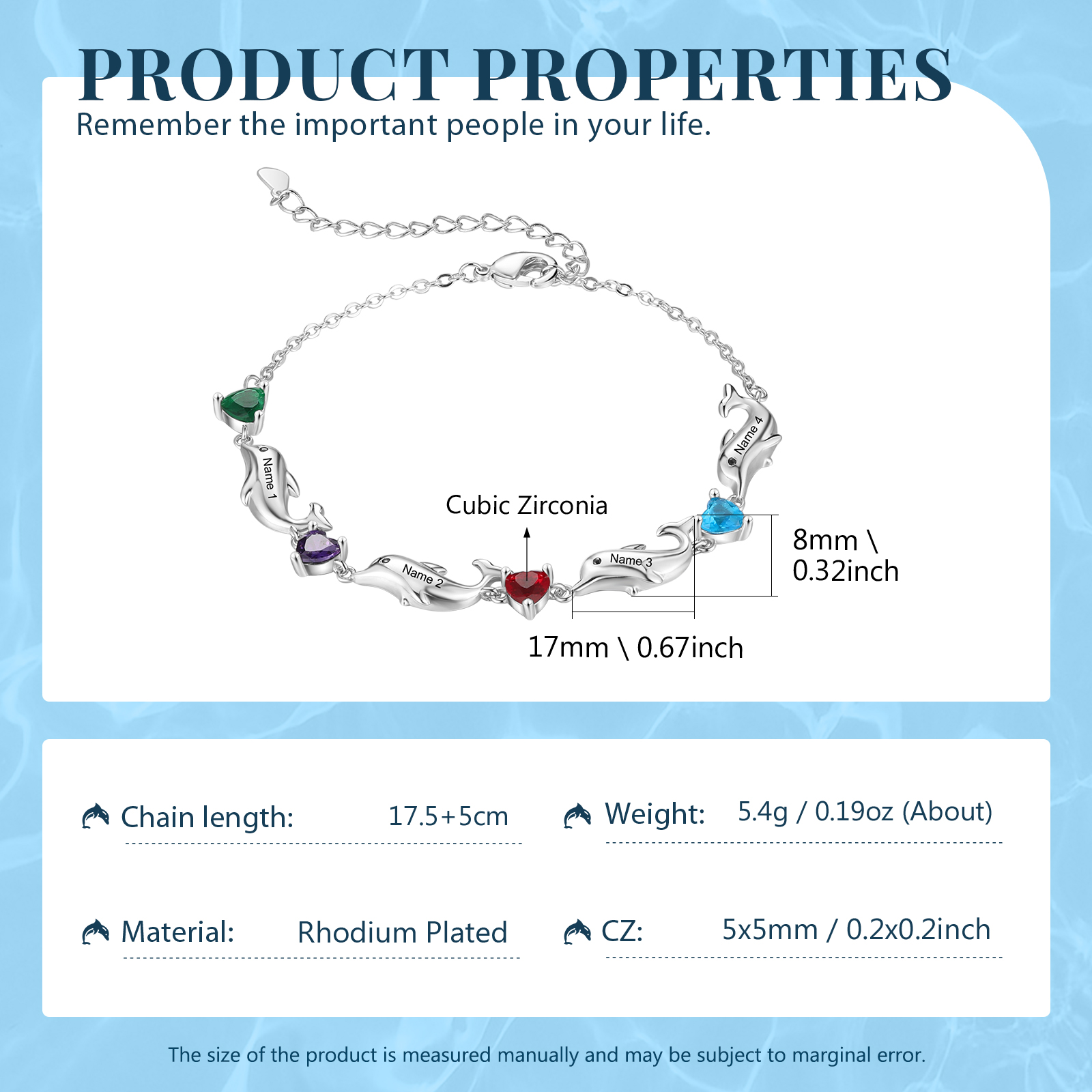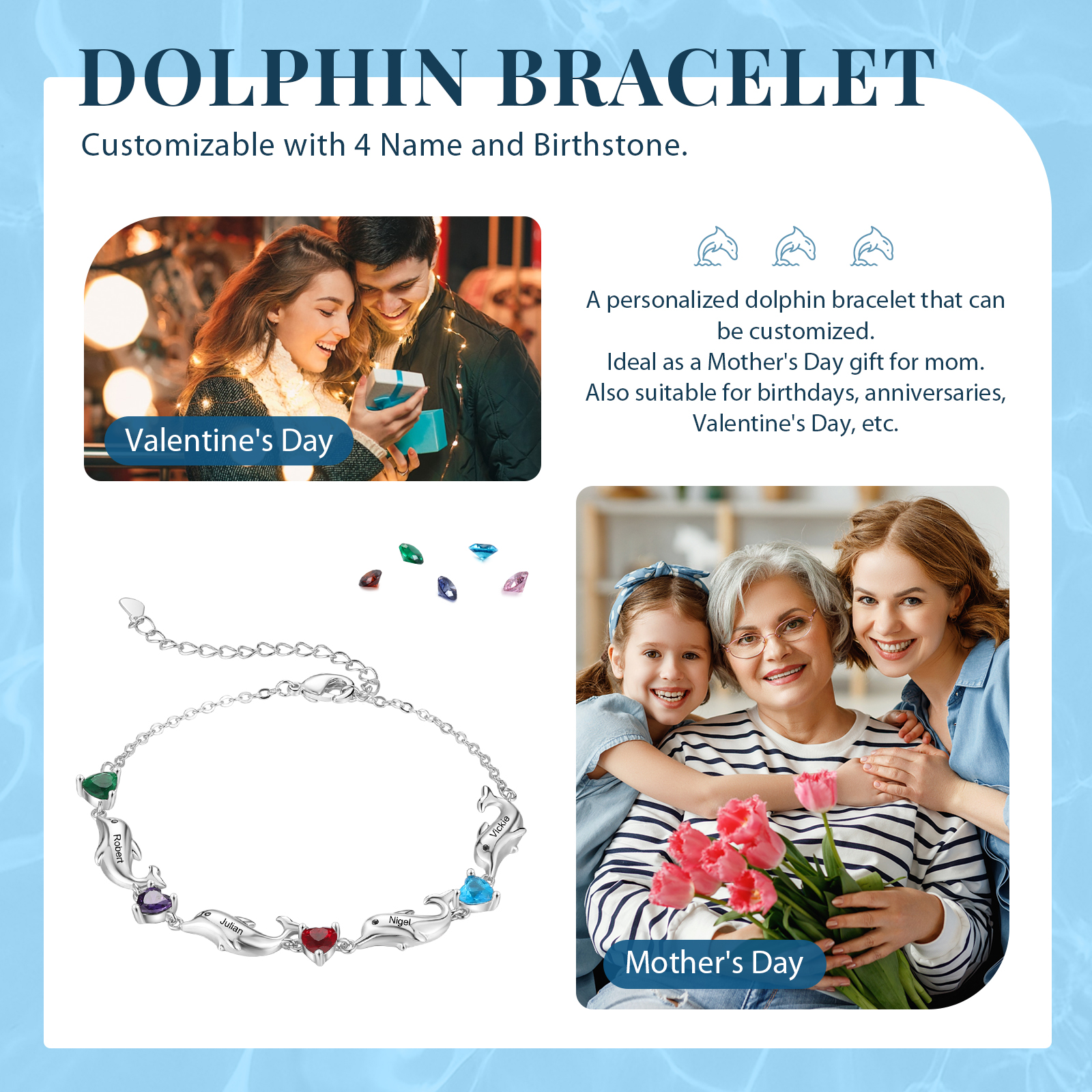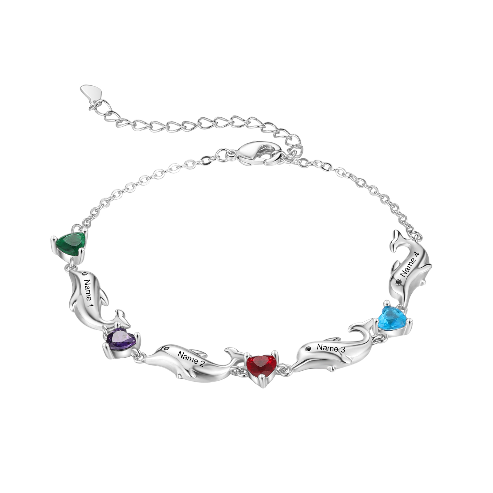 Braccialetto Cuore e Delfino con 4 pietre di nascita e 4 nomi personalizzati regalo per donna