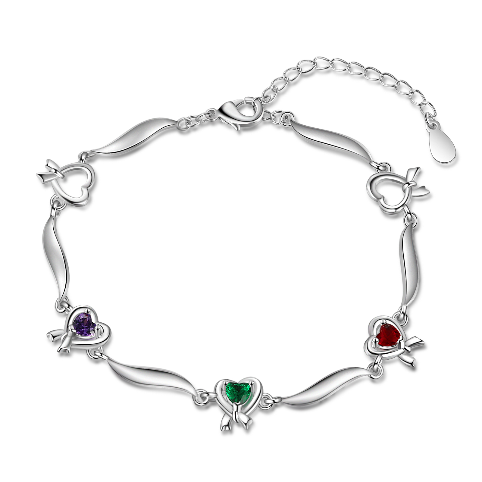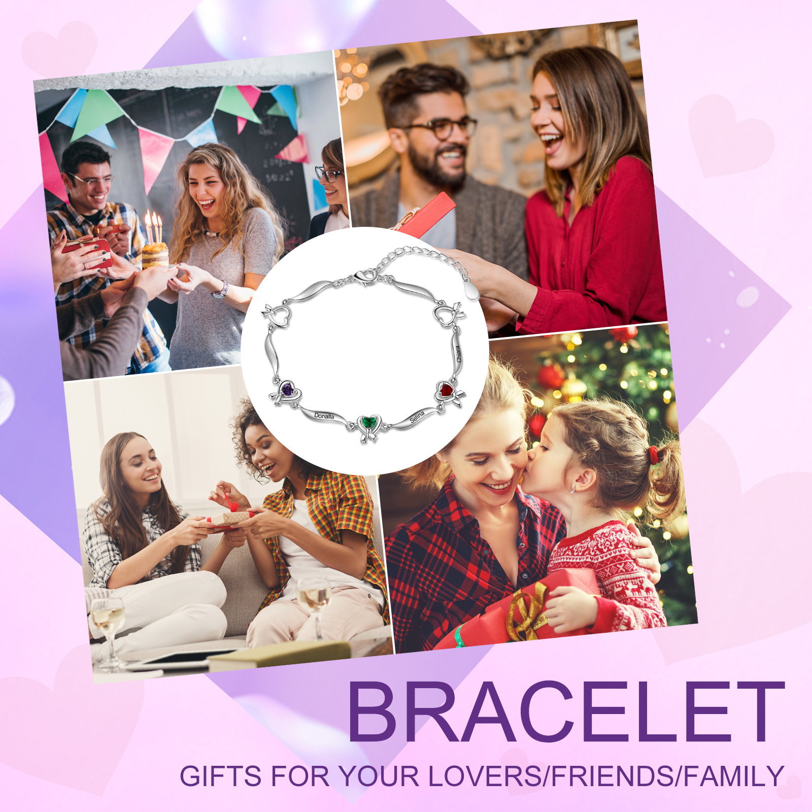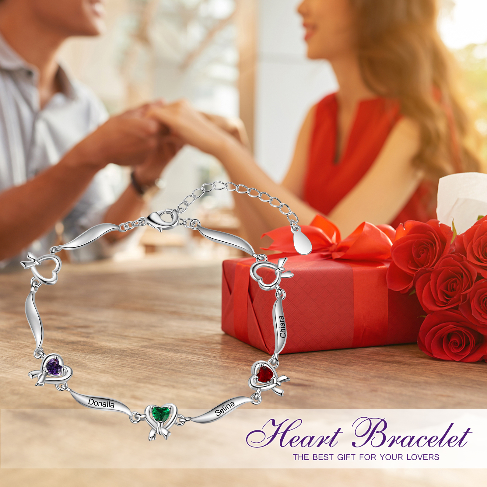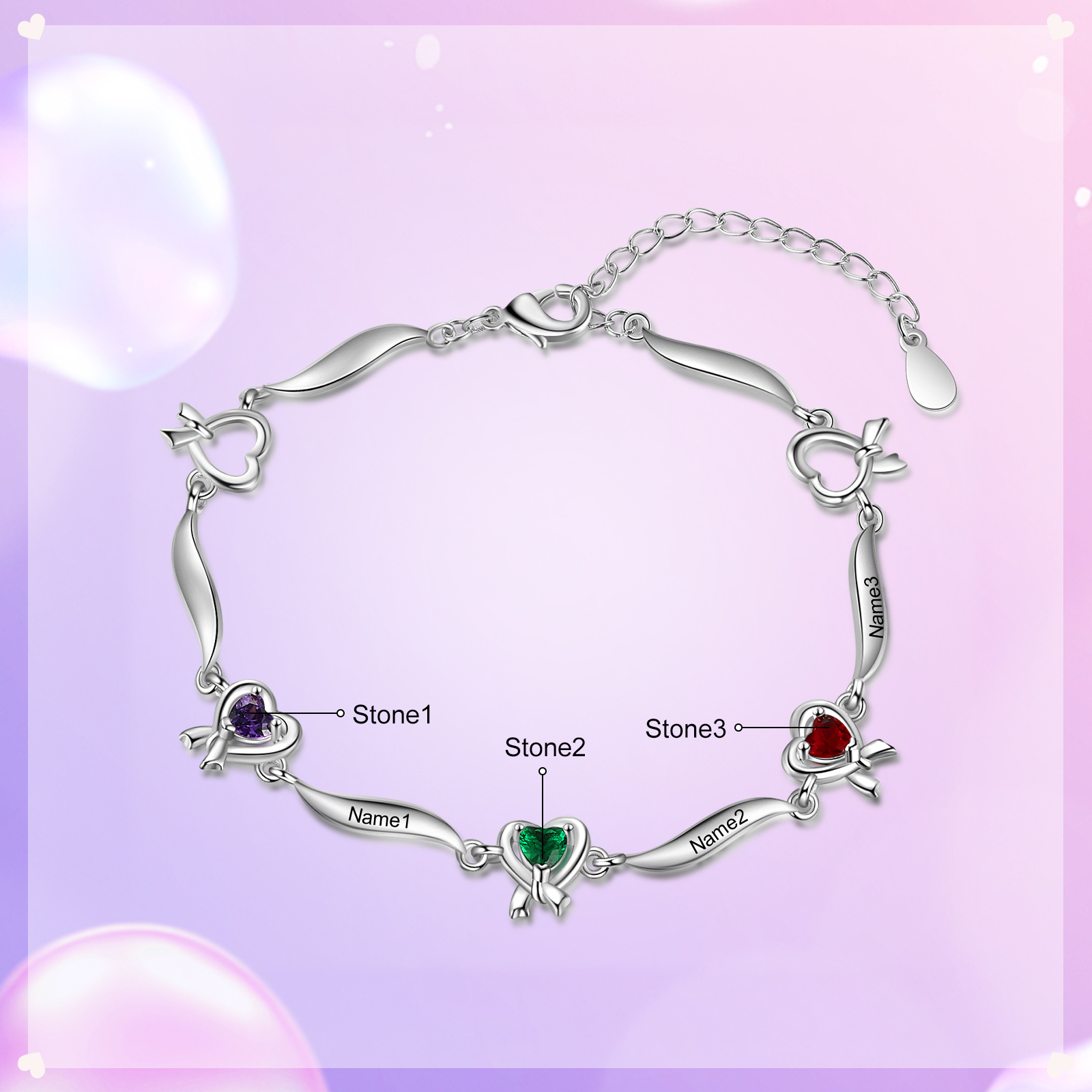 Braccialetto Cuore nodo di farfalla con 3 pietre di nascita e 3 nomi personalizzati regalo per donna