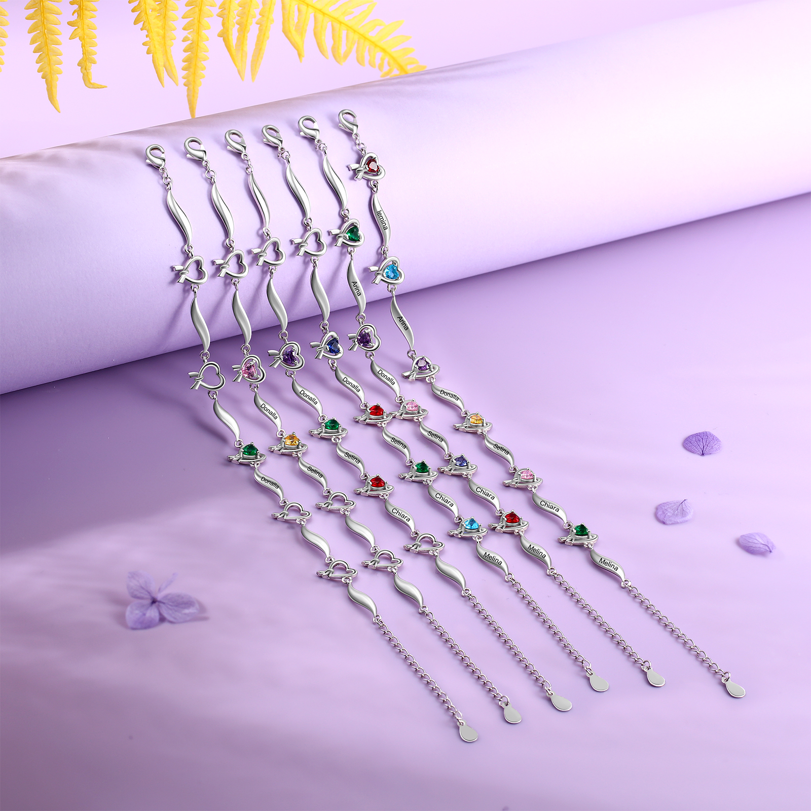 Braccialetto Cuore nodo di farfalla con 6 pietre di nascita e 6 nomi personalizzati regalo per donna