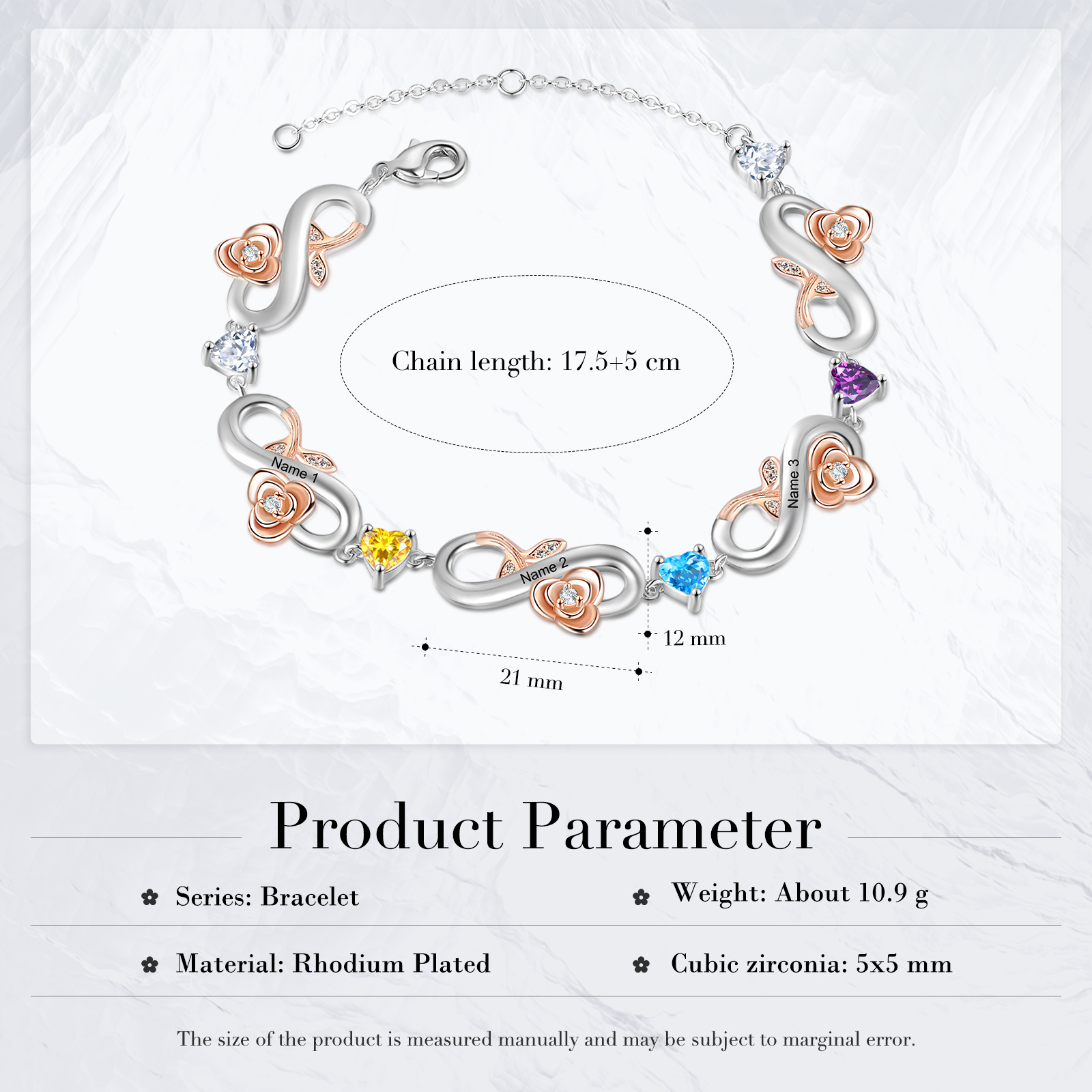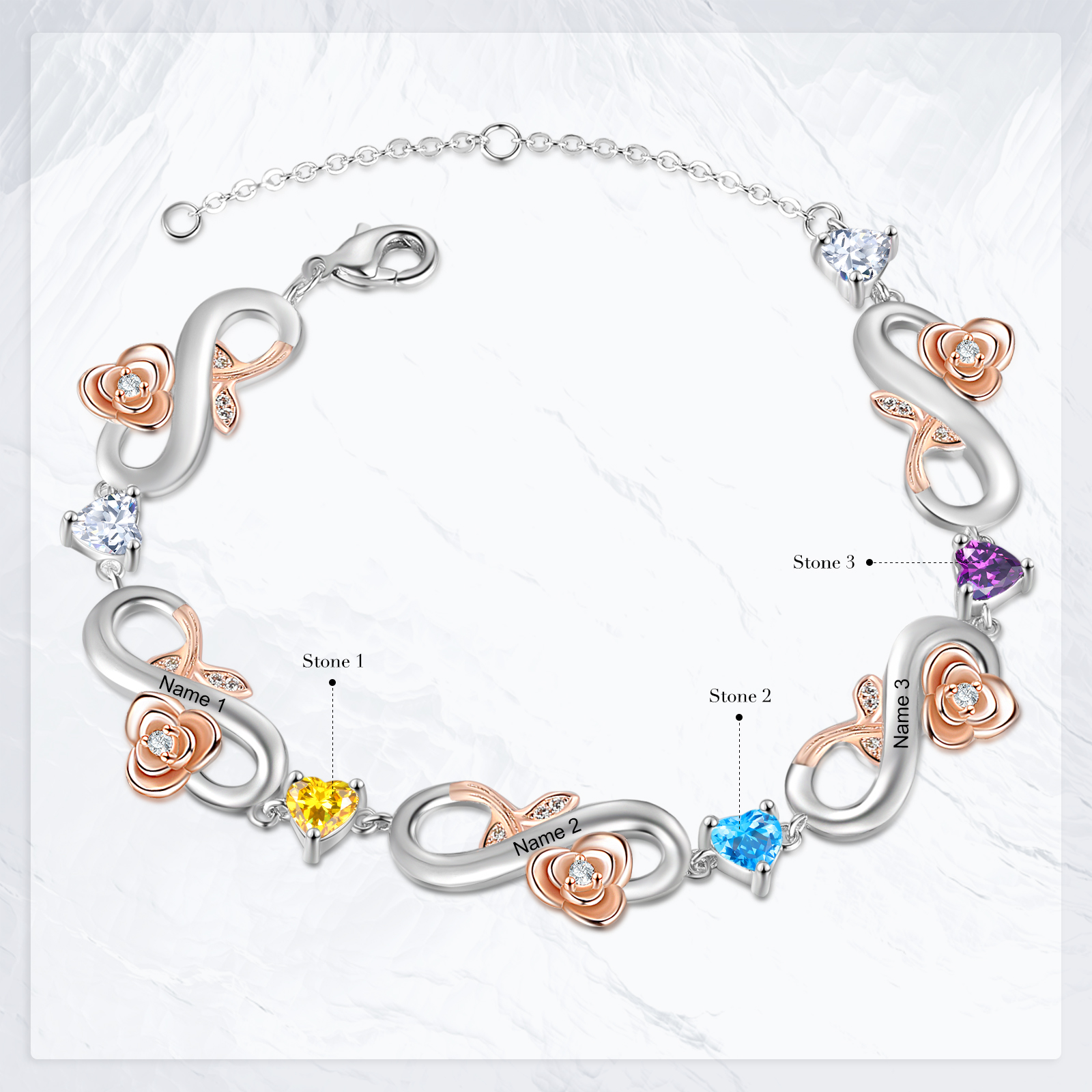 Braccialetto Fiore e infinito con 3 pietre di nascita e 3 nomi personalizzati regalo per donna