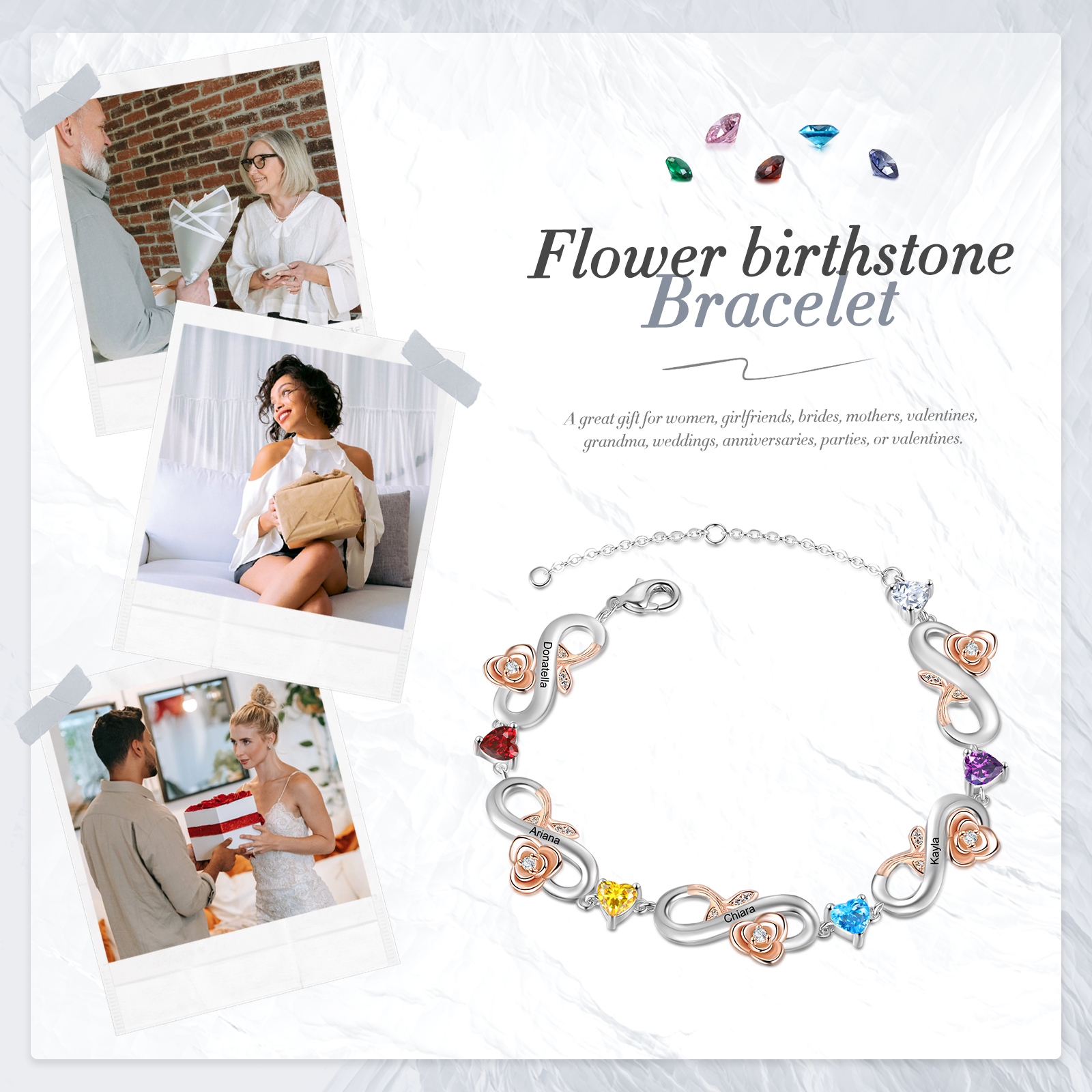 Braccialetto Fiore e infinito con 4 pietre di nascita e 4 nomi personalizzati regalo per donna