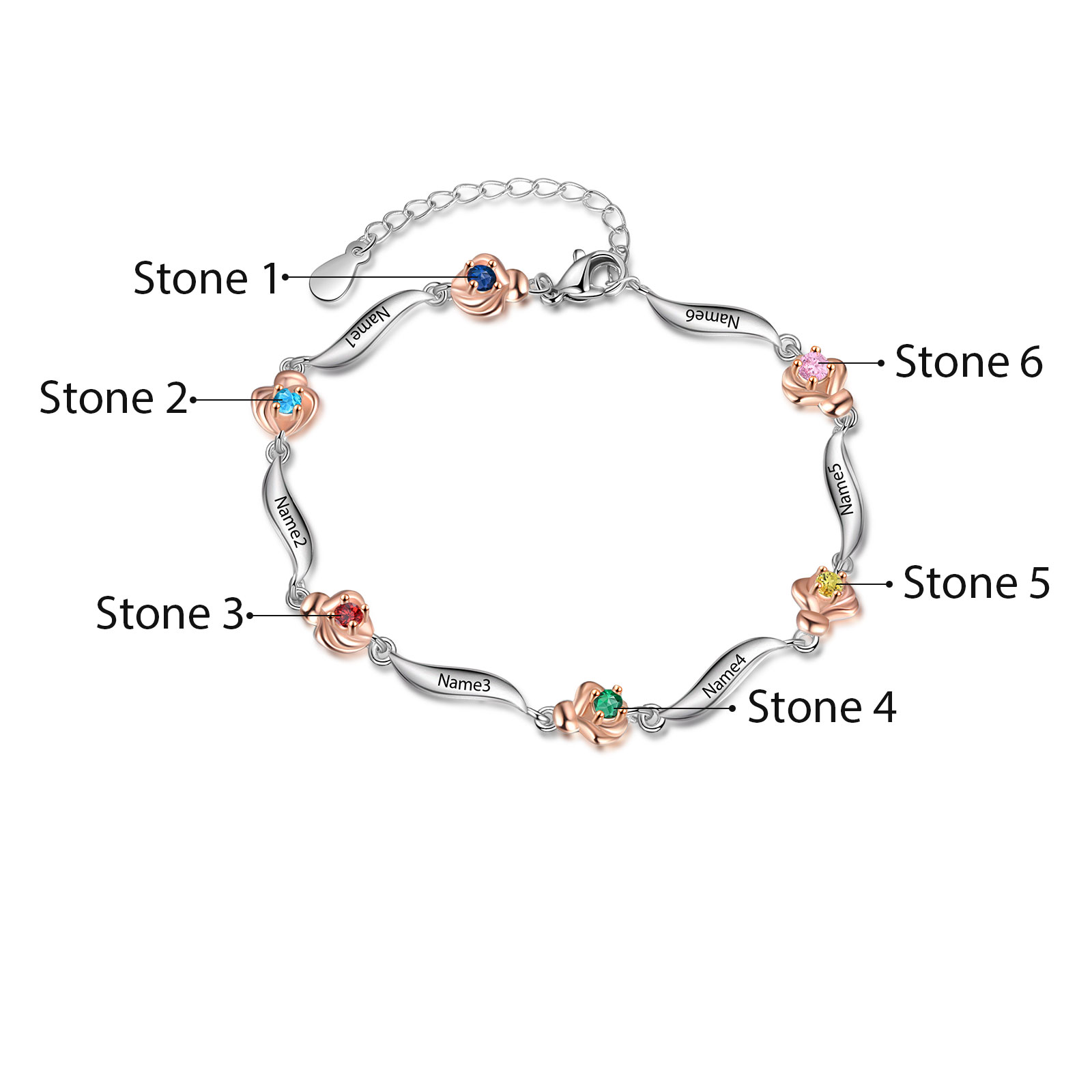 Braccialetto Fiore rosa con 6 pietre di nascita e 6 nomi personalizzati regalo per donna