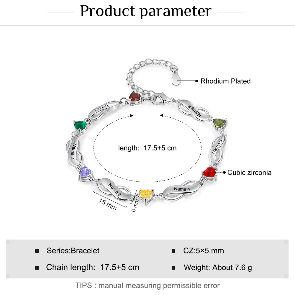 Braccialetto infinito con 6 pietre di nascita a forma di cuore e 6 nomi personalizzati