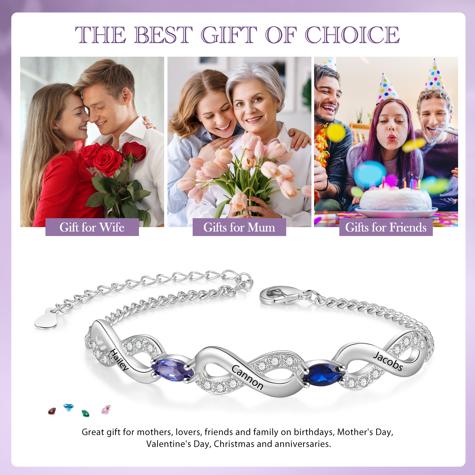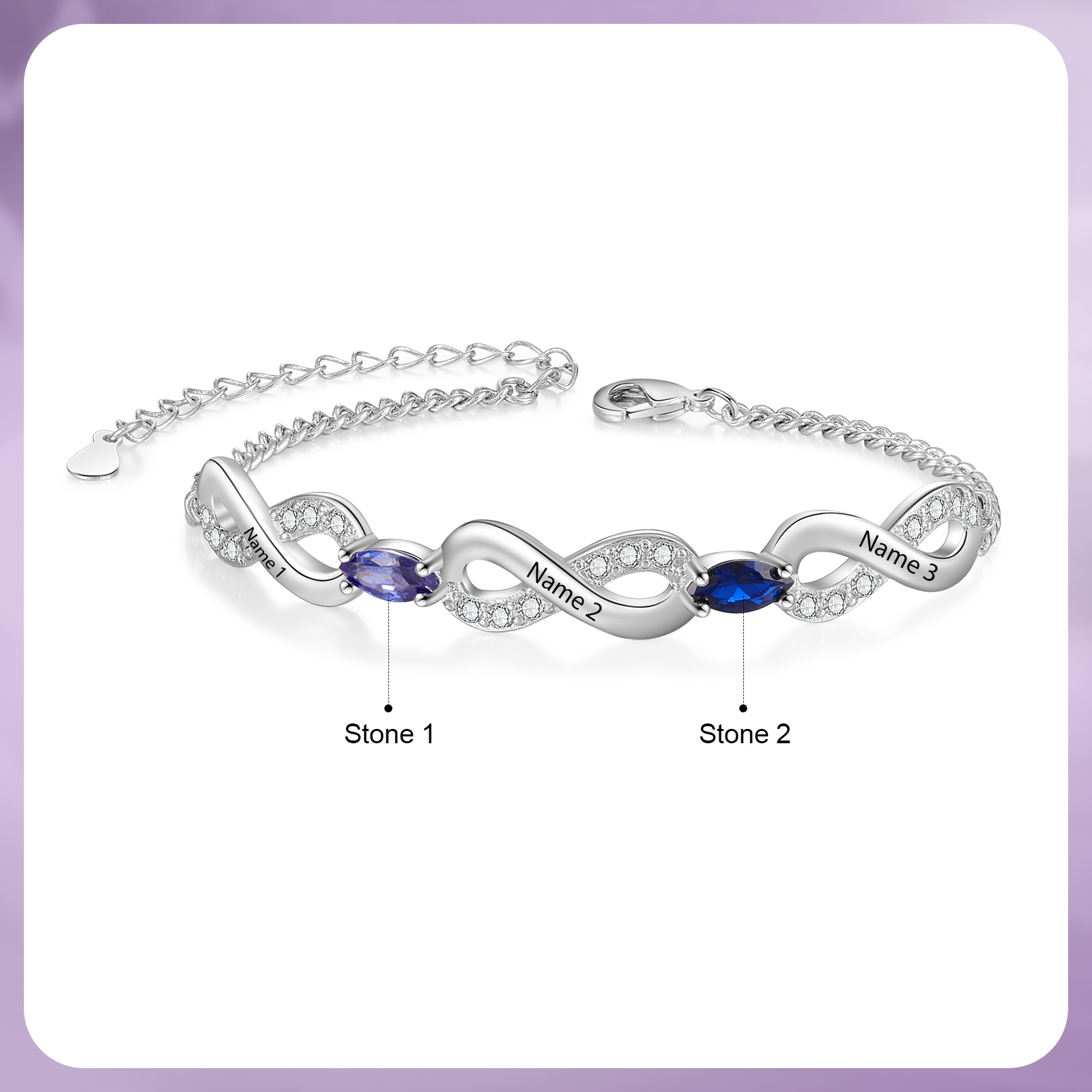 Braccialetto infinito personalizzato con 3 nomi e 2 pietre di nascita