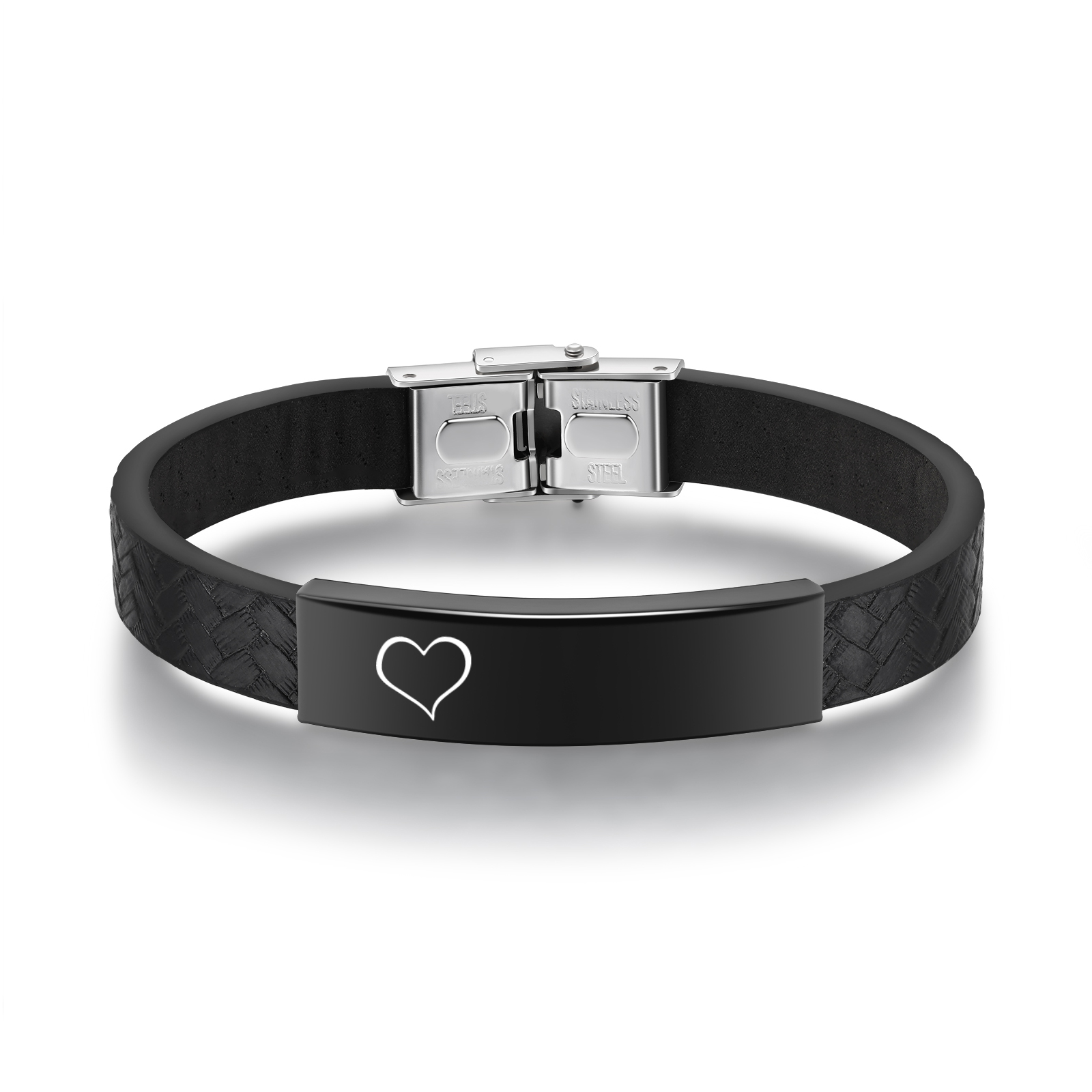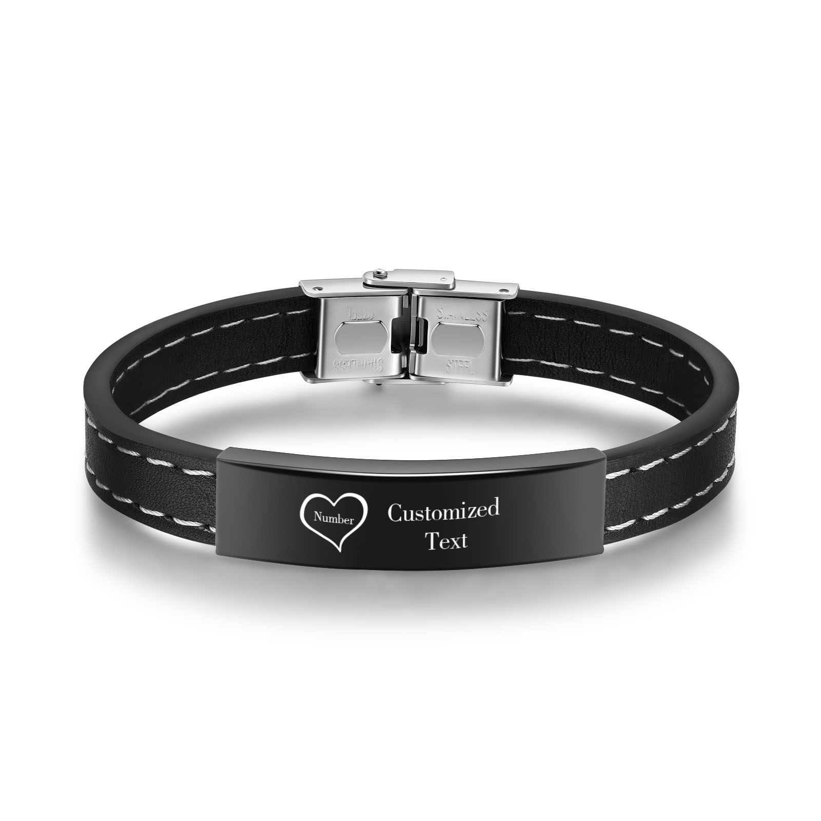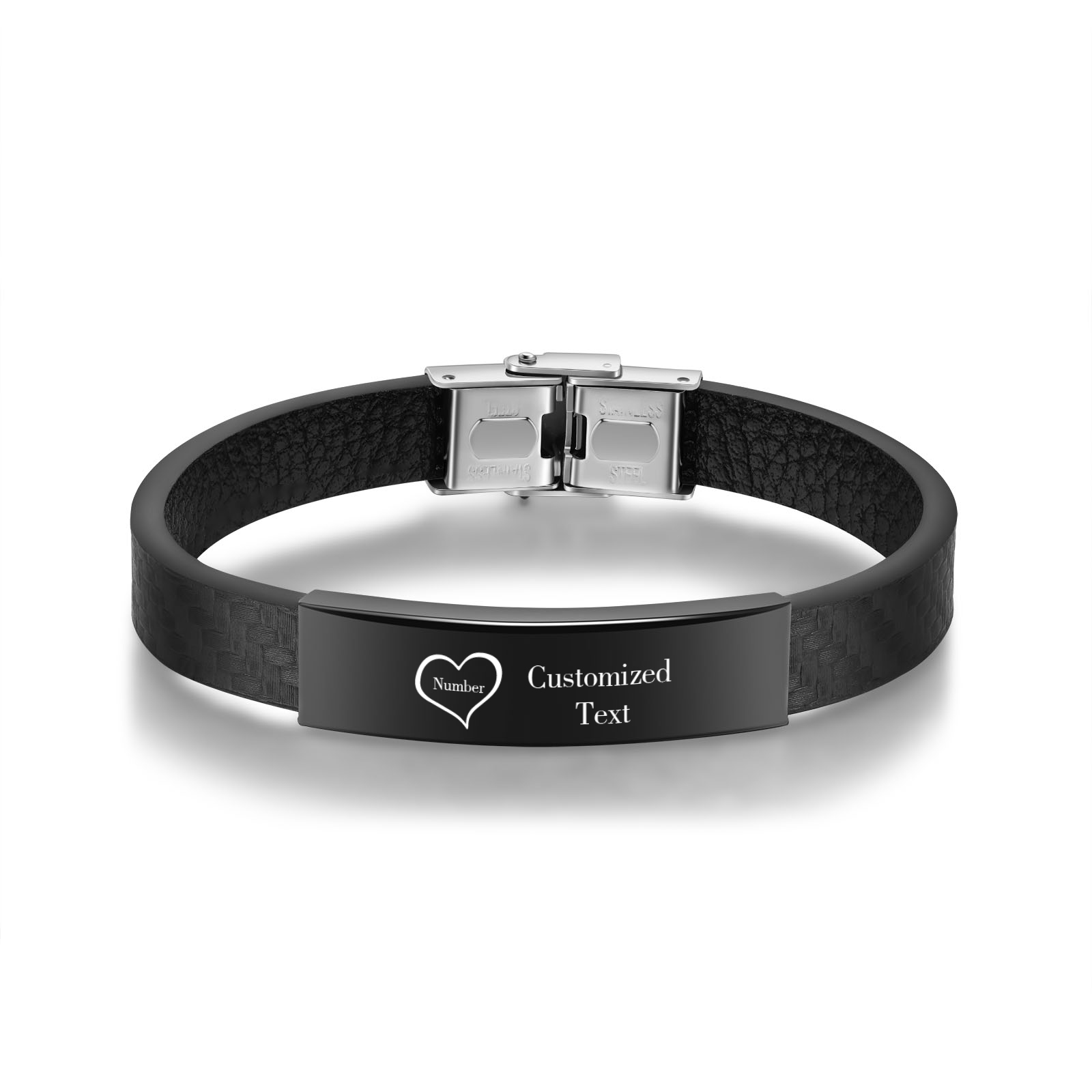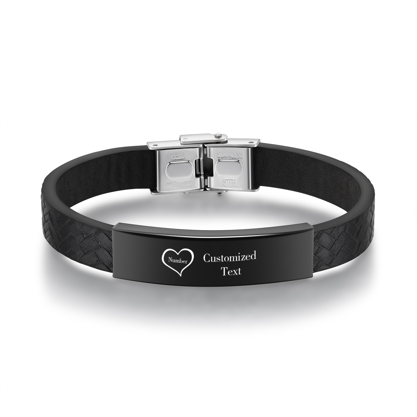Braccialetto maschile in acciaio inox e ecopelle con 1 numero e 1 testo personalizzati