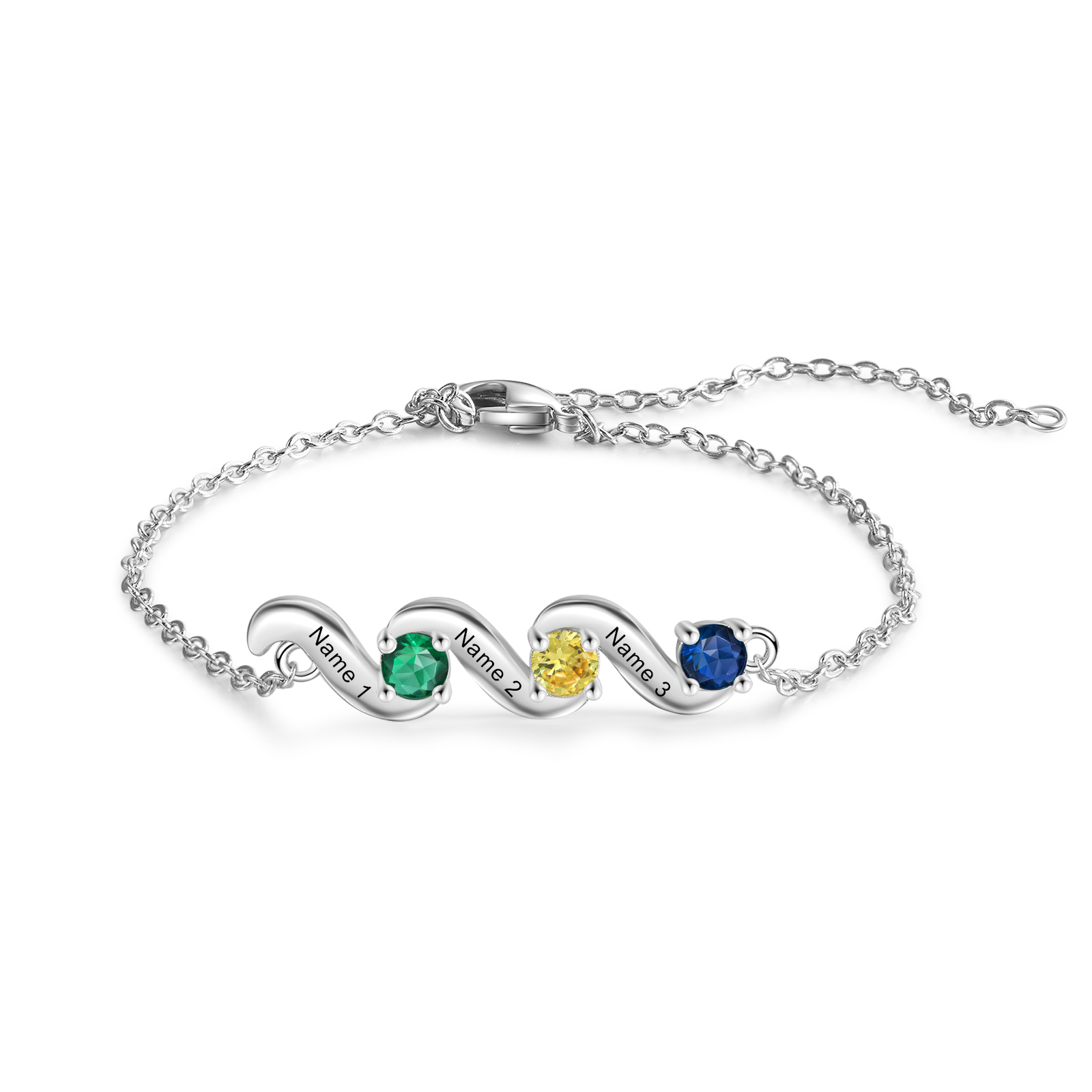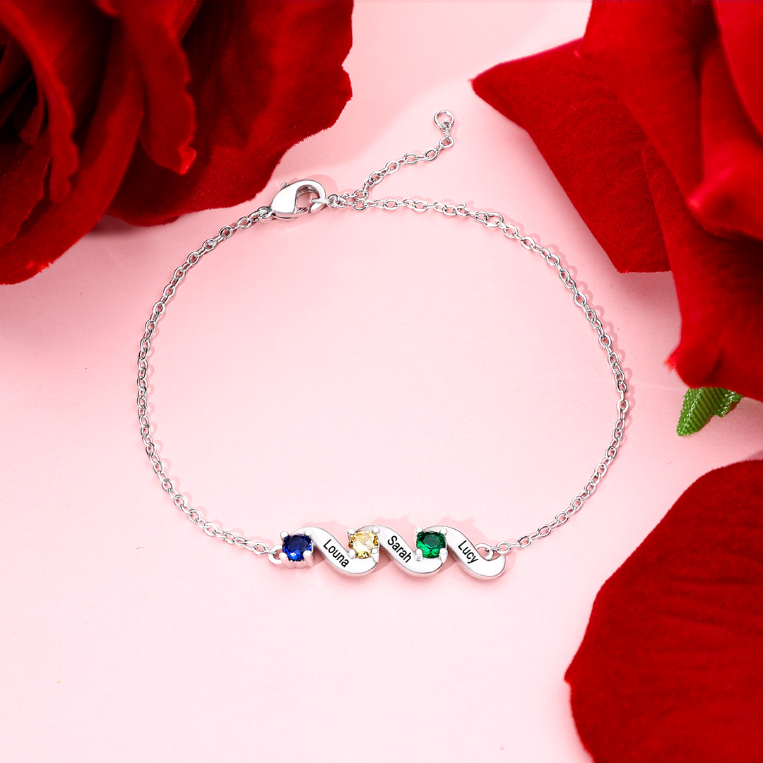 Braccialetto personalizzato con 3 pietre di nascita e 3 nomi personalizzati regalo per donna