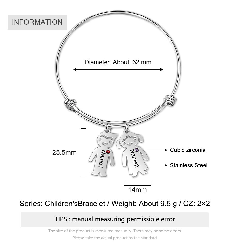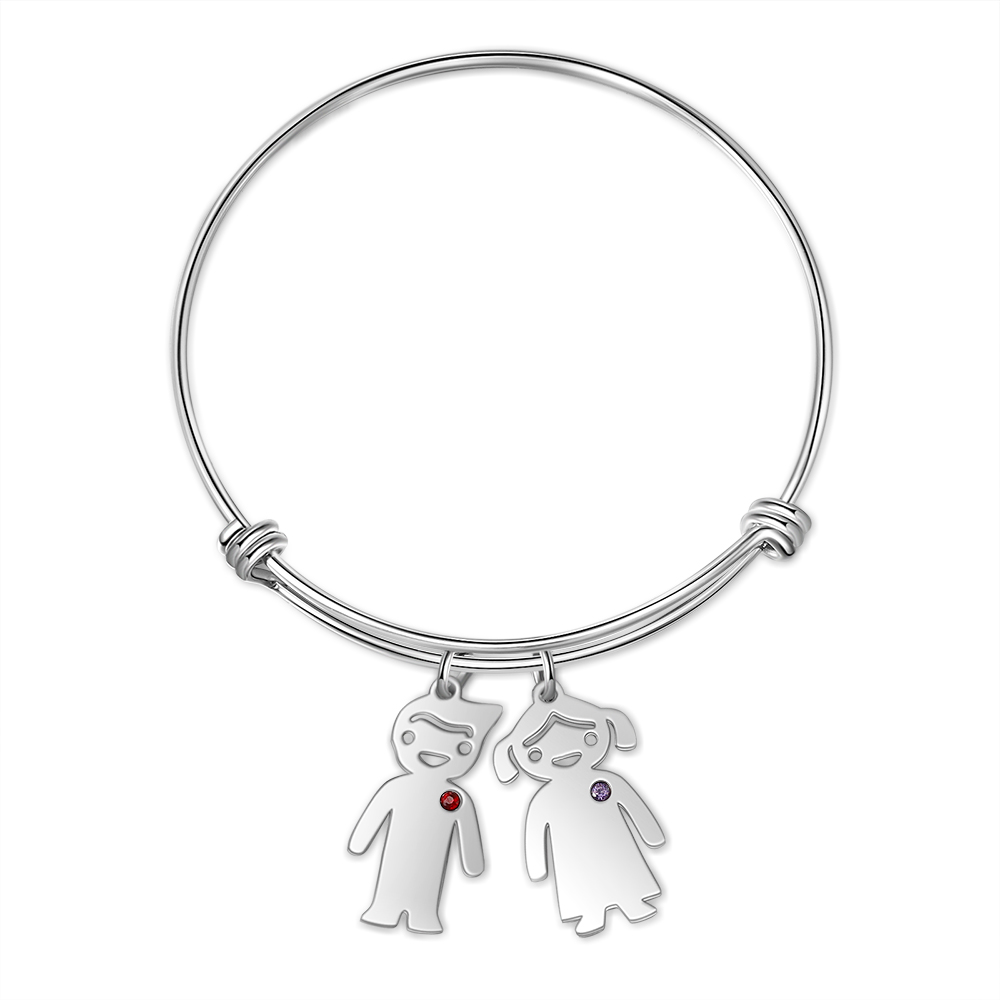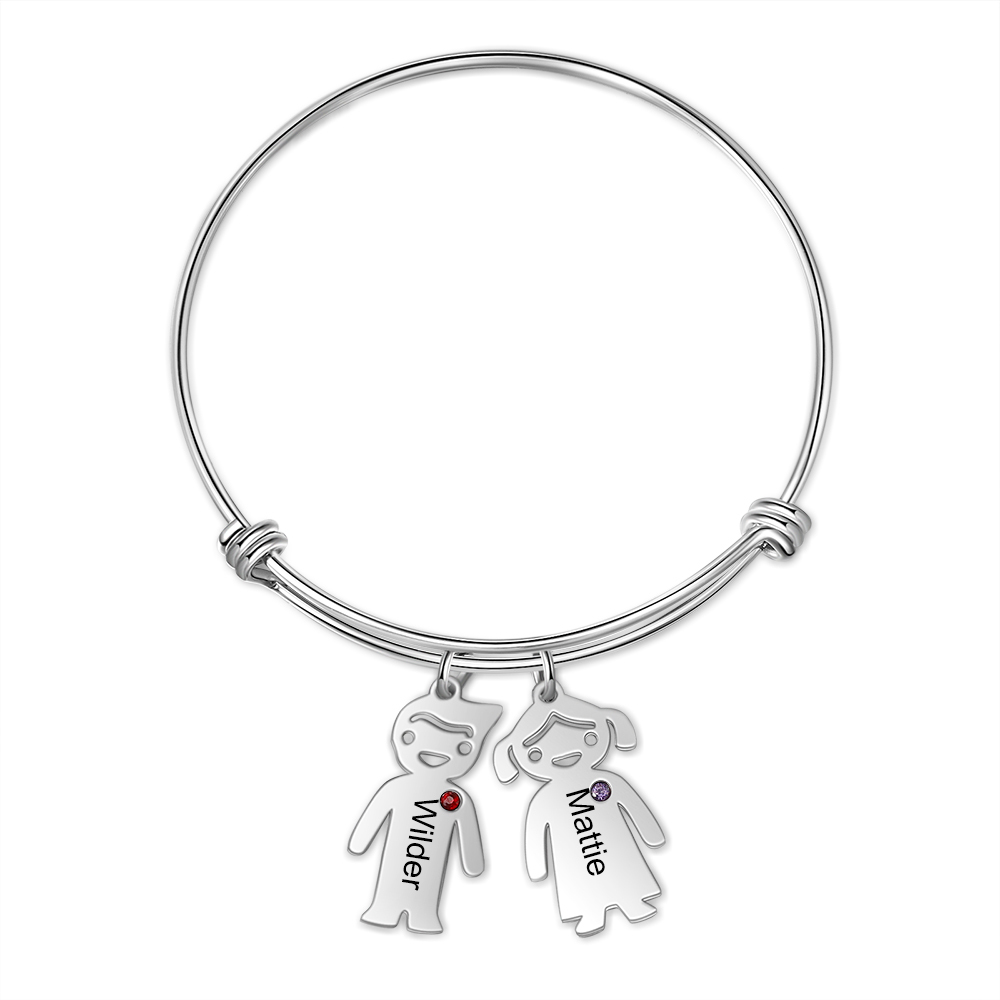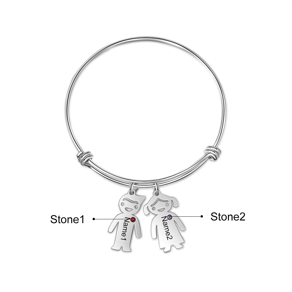 Braccialetto rigido con ciondolo di bambino personalizzato 2 nomi e 2 pietre di nascita per mamma/nonna