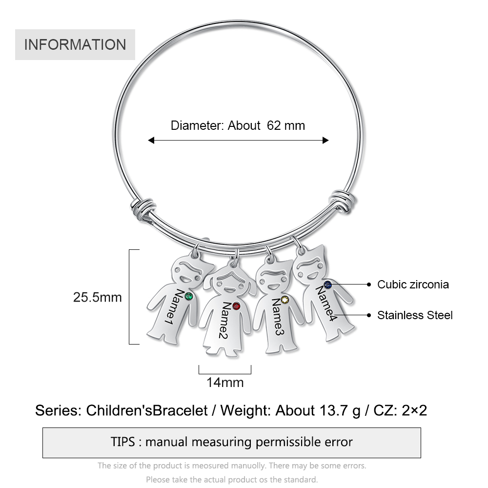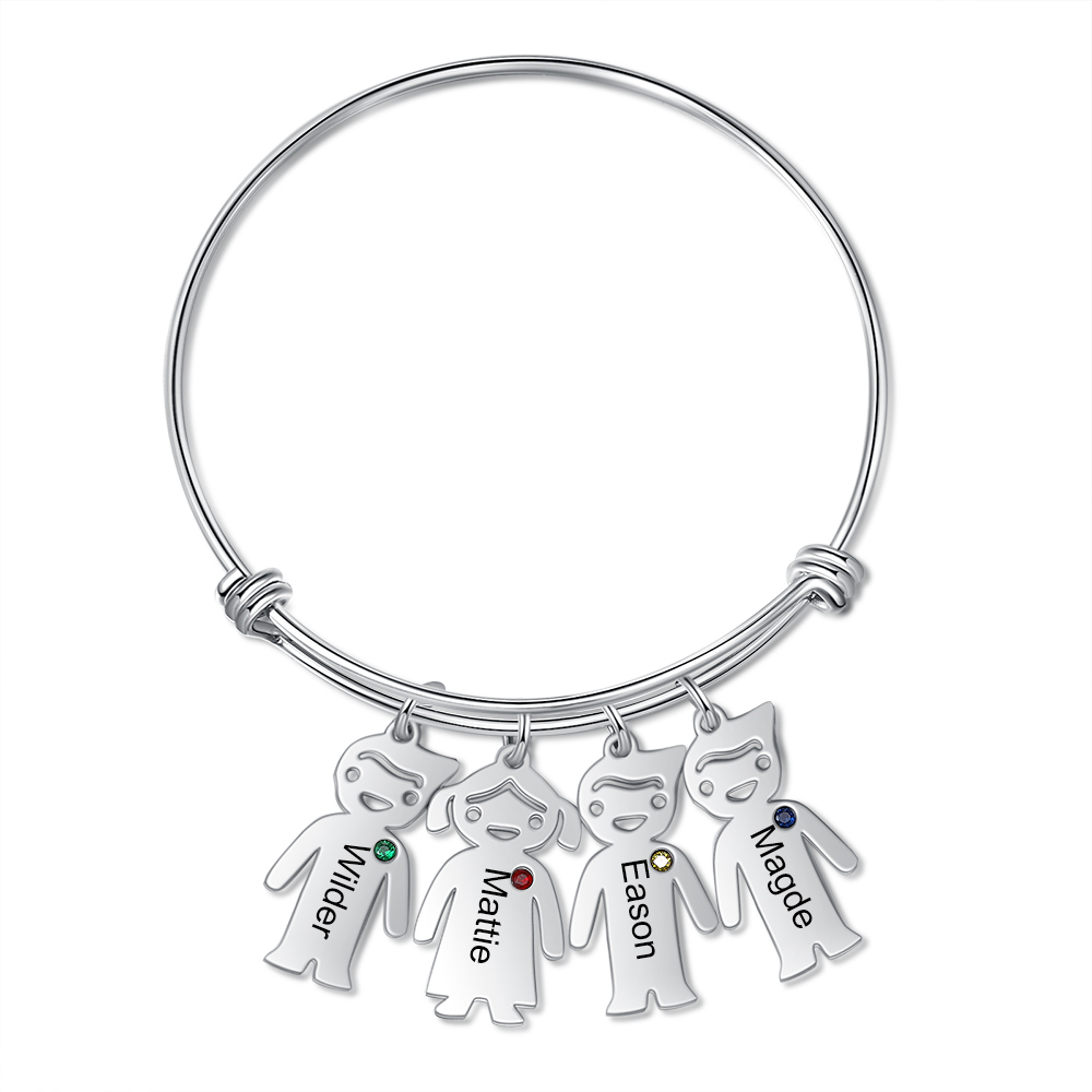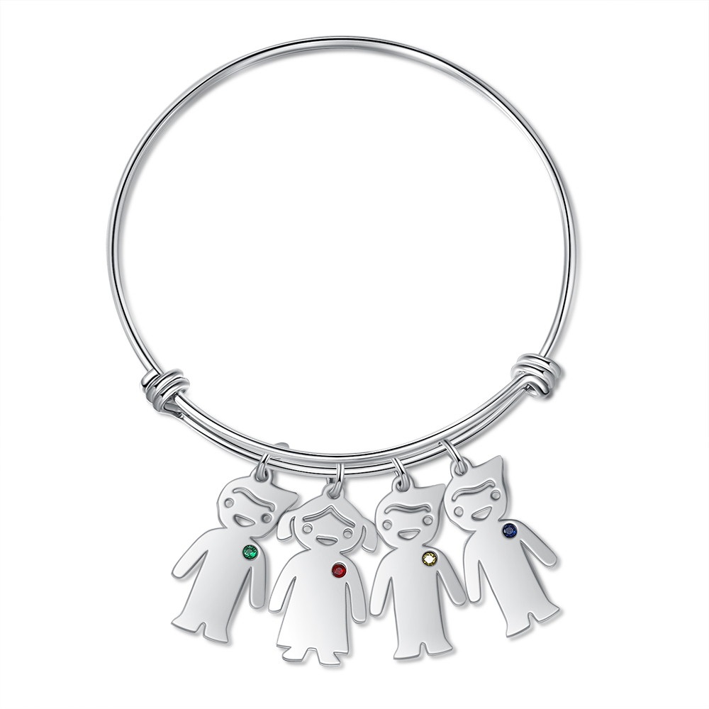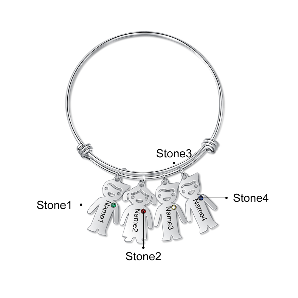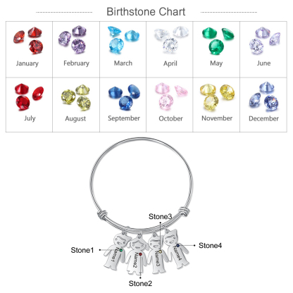 Braccialetto rigido con ciondolo di bambino personalizzato 4 nomi e 4 pietre di nascita per mamma/nonna