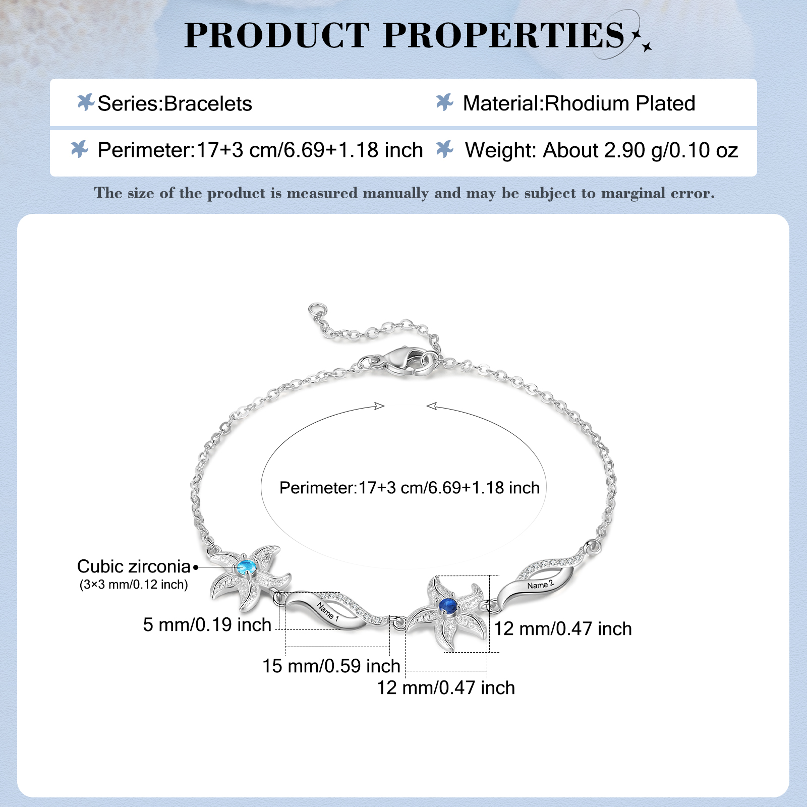 Braccialetto stella marina con 2 pietre di nascita e 2 nomi personalizzati regalo per donna