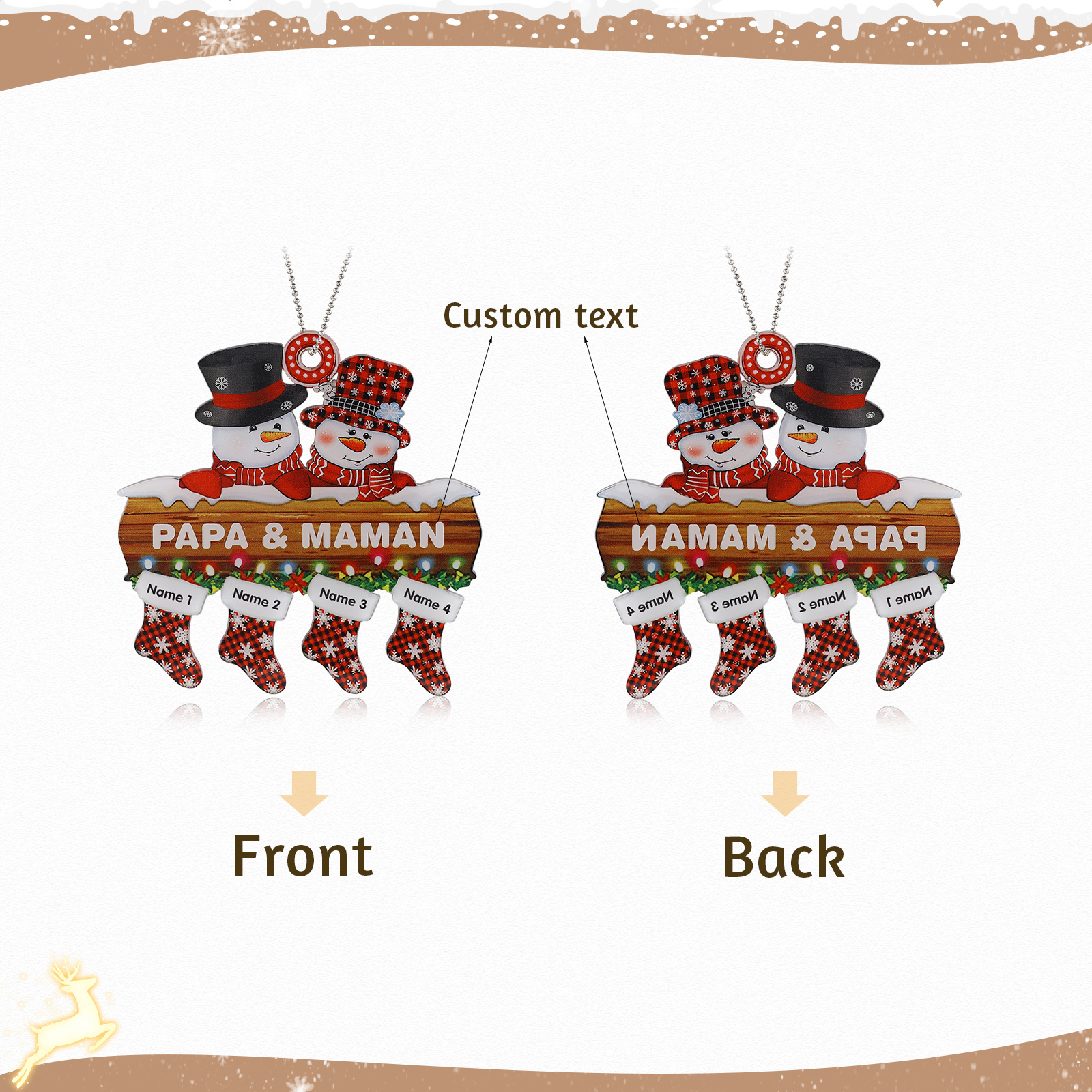Calzini & Pupazzo di neve-Decorazione acrilica natalizia 4 nomi personalizzabili