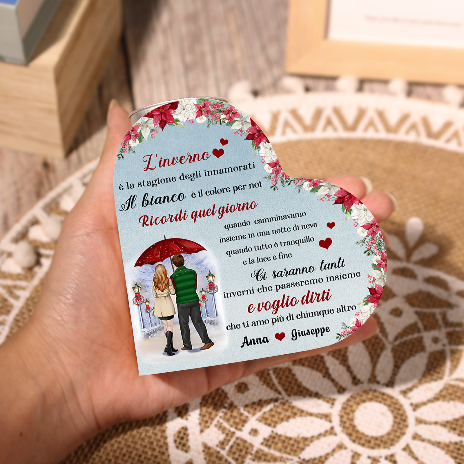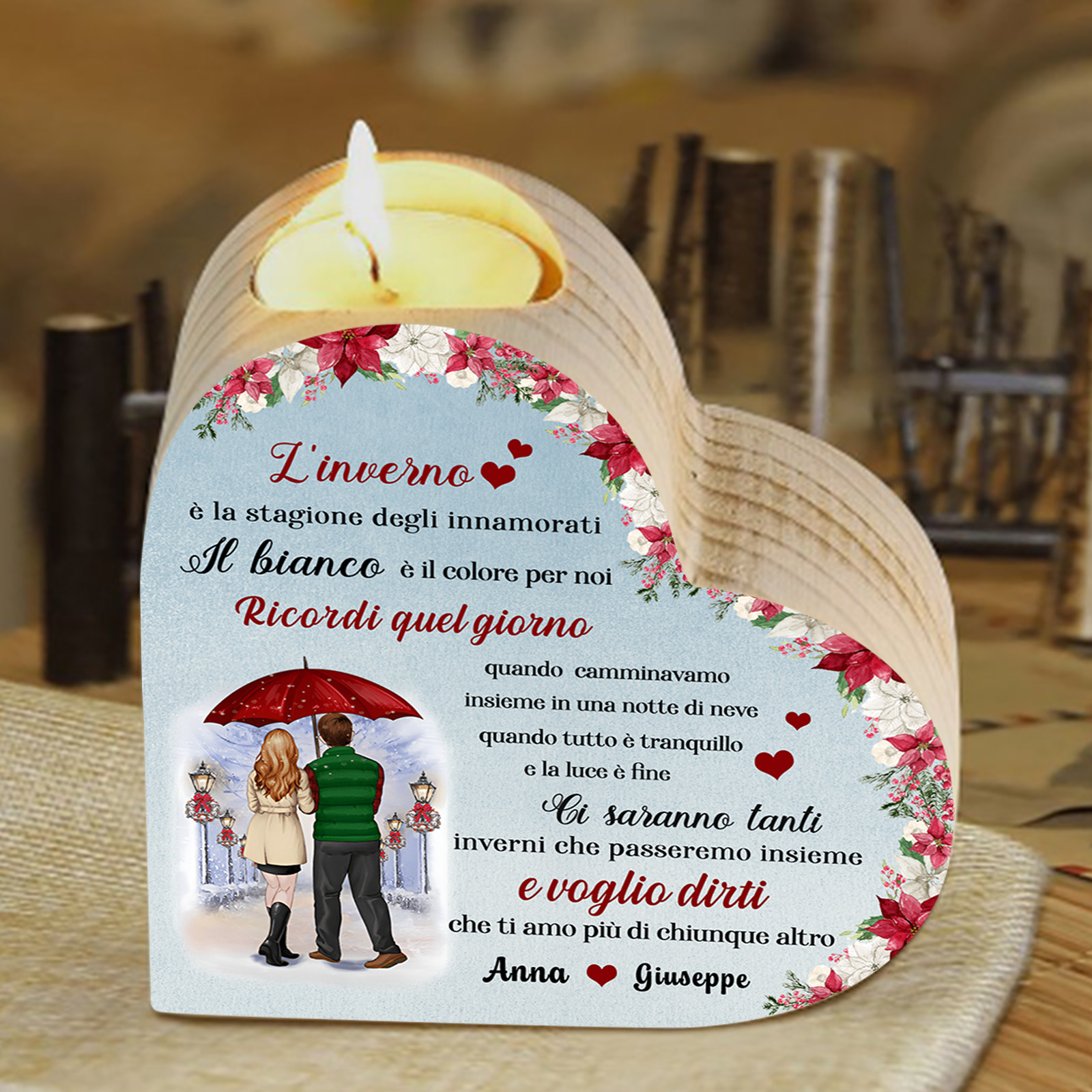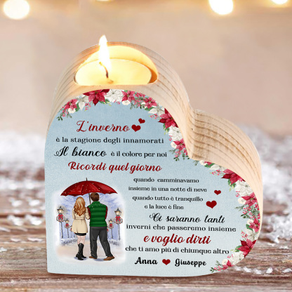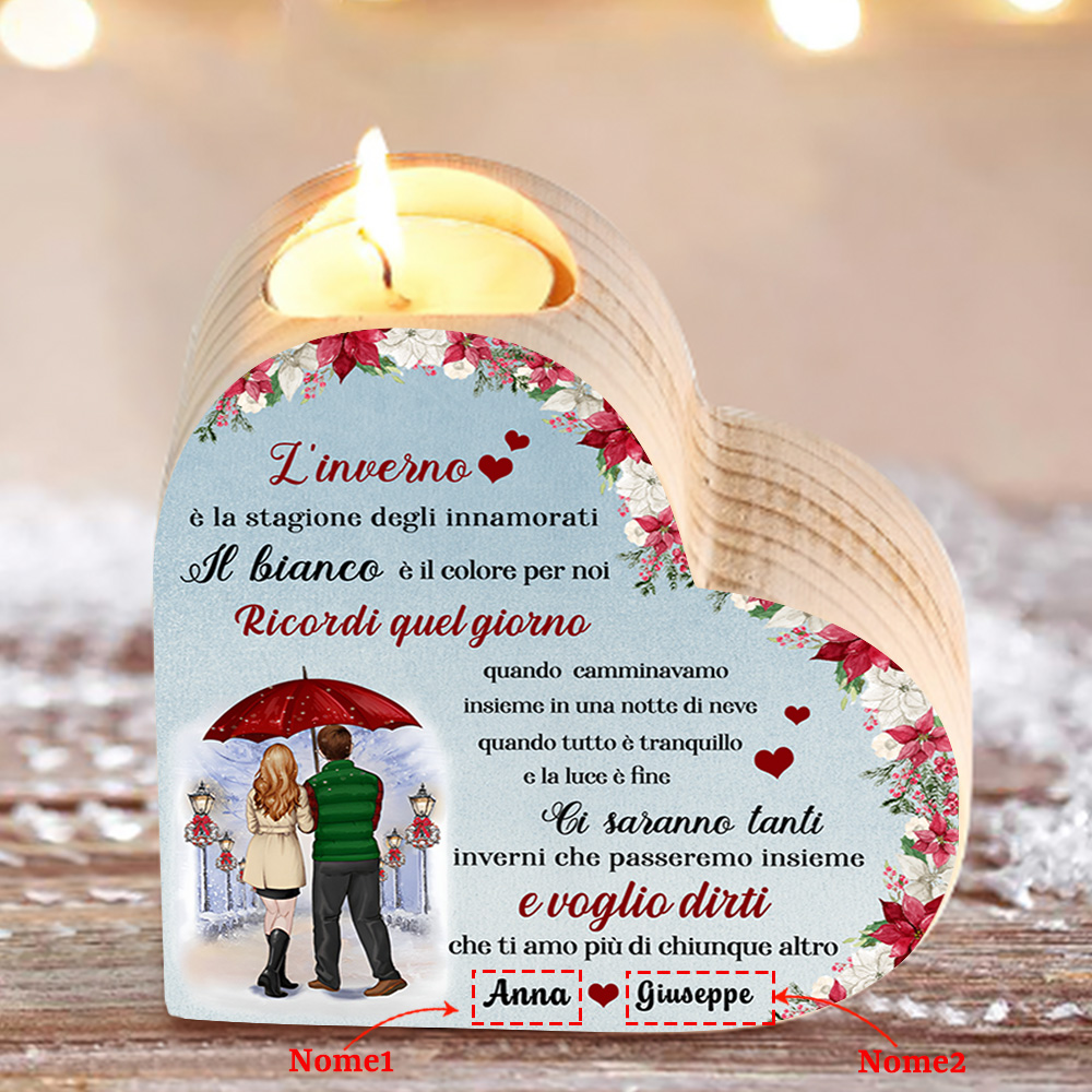 Questo candeliere dedicato a una coppia crea un'atmosfera magica e romantica, perfetta per essere utilizzato come elemento decorativo durante le festività o come regalo speciale per celebrare l'amore invernale.