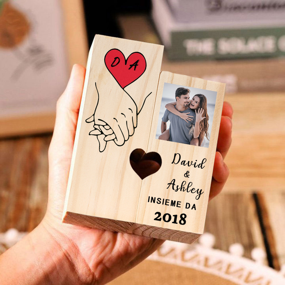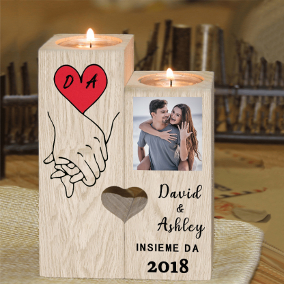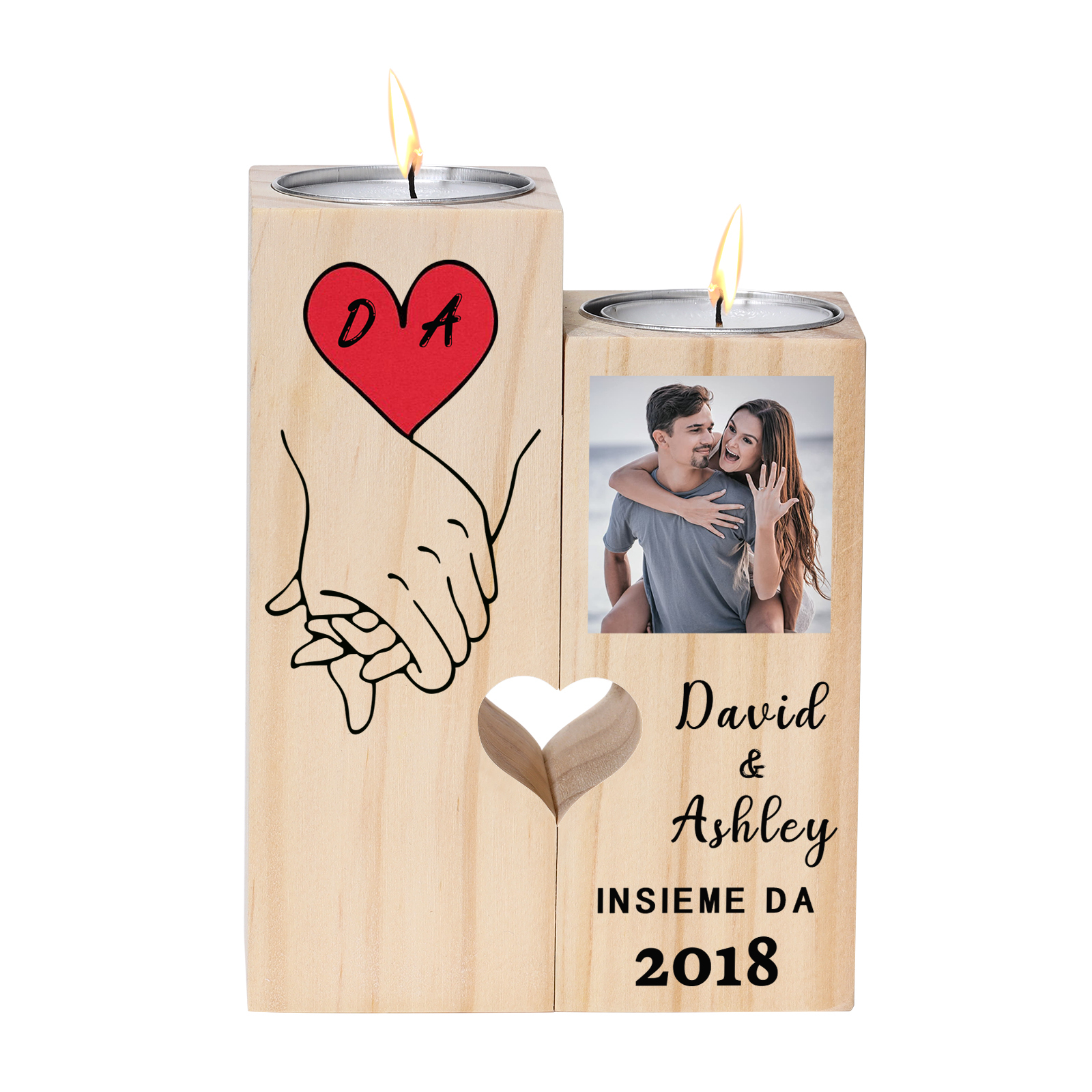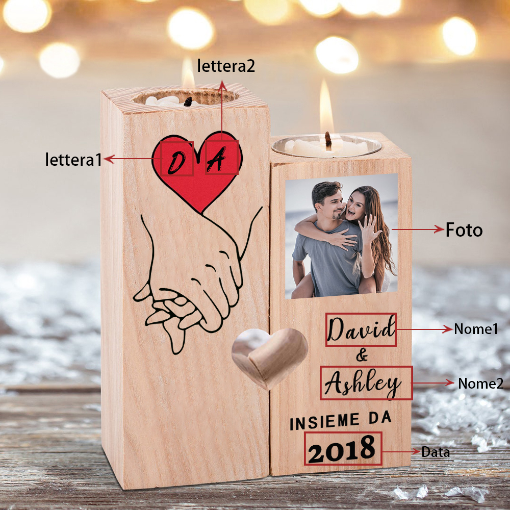 mano nella mano un cuore-Candelieri in legno 2 nomi 2 lettere 1 data e 1 foto personalizzati per coppia regalo di amore