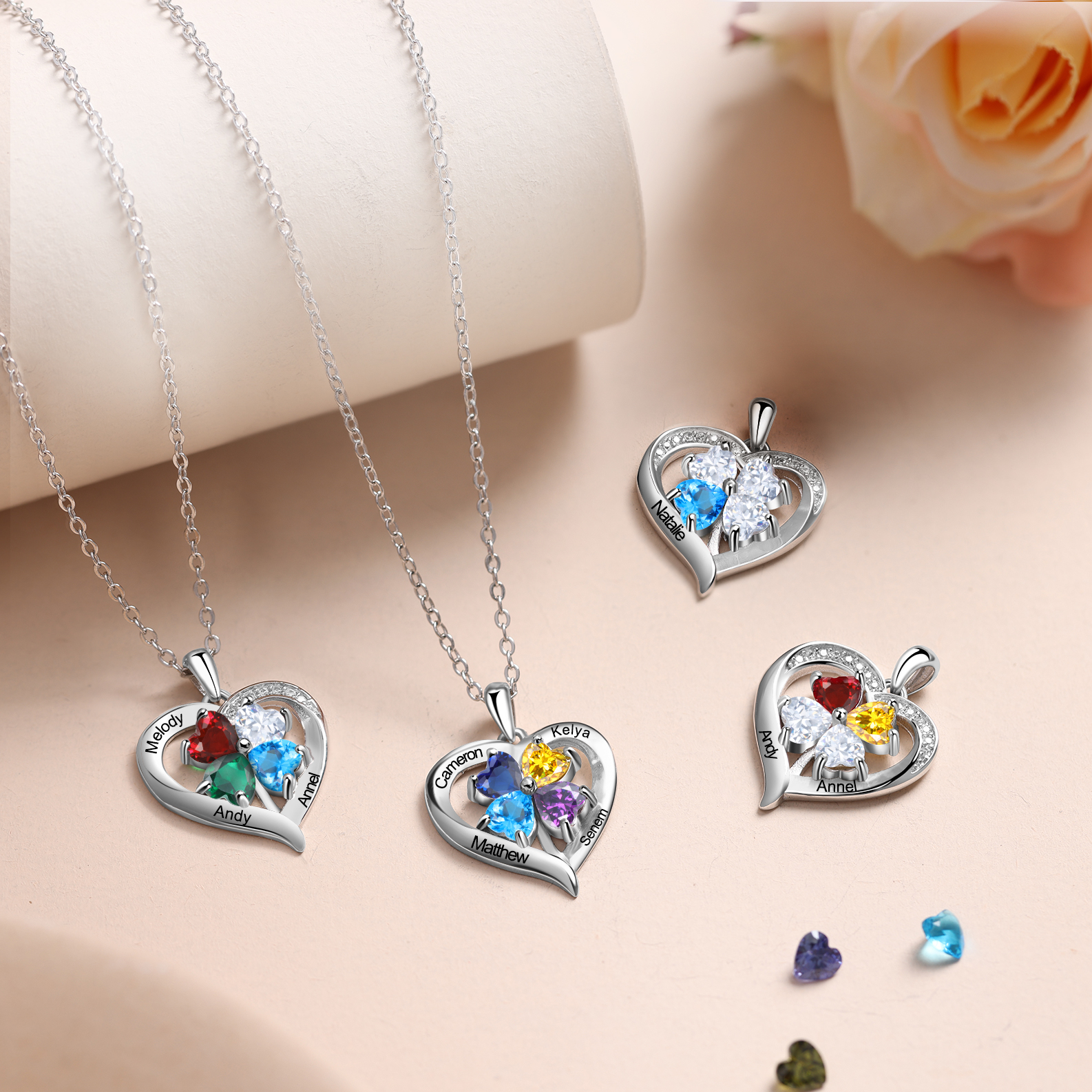 Collana 925 Argento cuore e quadrifoglio fortunato con 1 cuore pietra di nascita e 1 nome personalizzabili per donna
