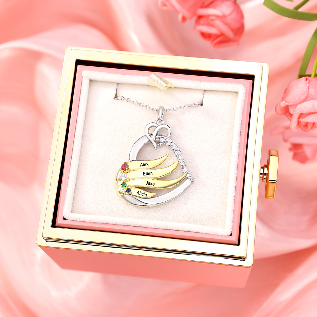 Collana ali nel cuore 4 pietre di nascita e 4 nomi personalizzati regalo per donna con scatola rotante