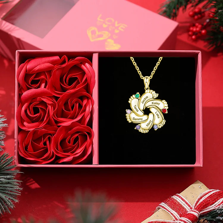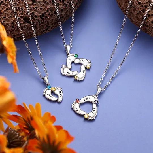Collana con 6 nomi Piedi di bambino personalizzati con pietre di nascita