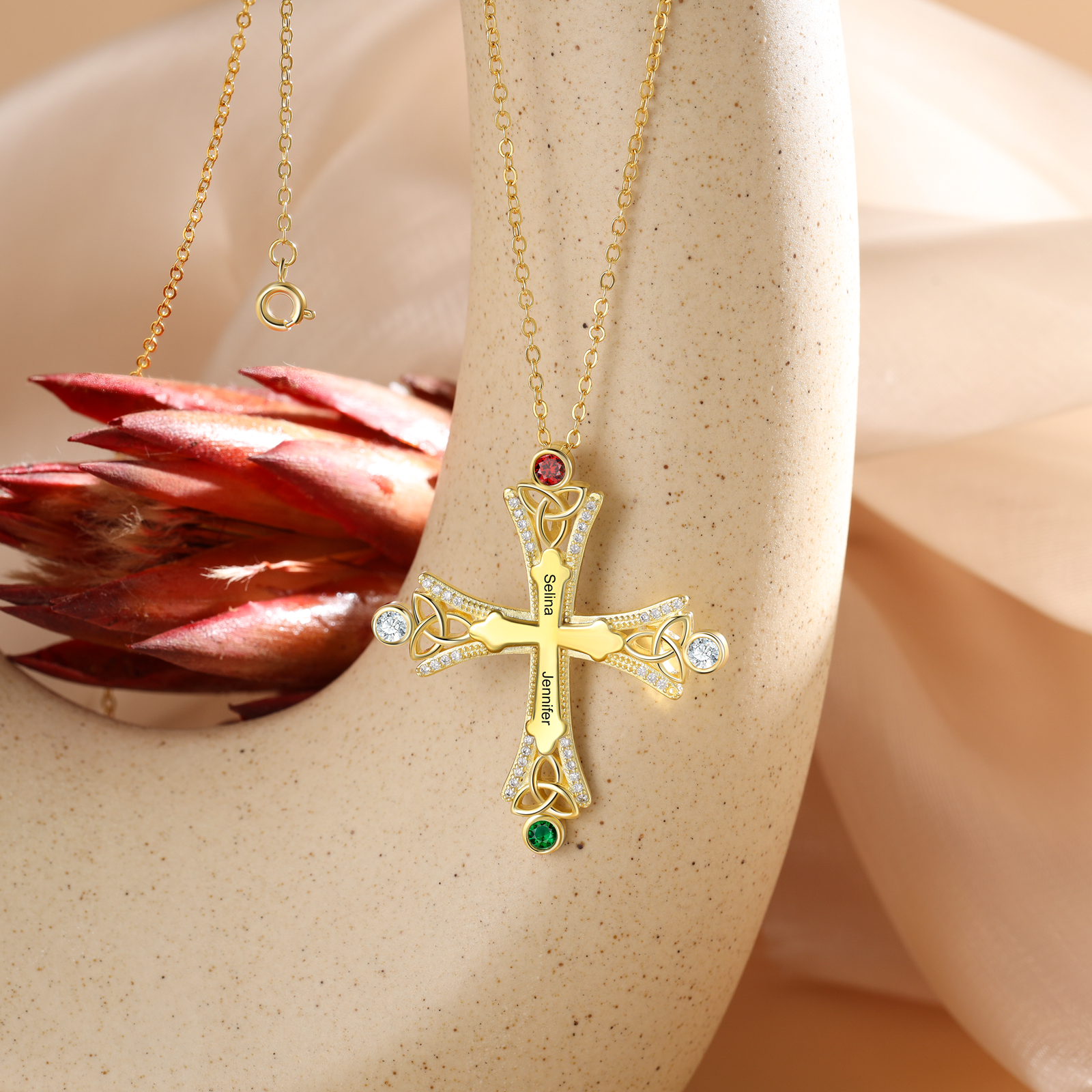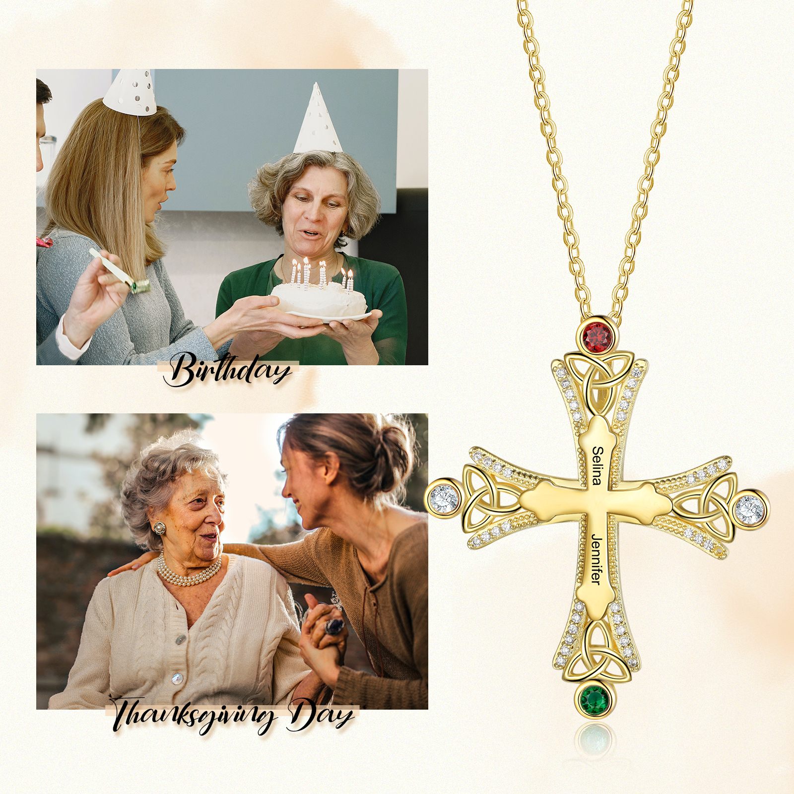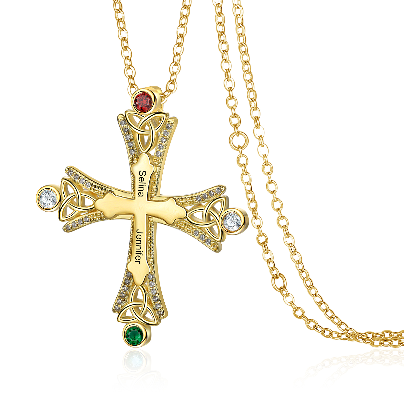Collana con croce con 2 pietre di nascita e 2 nomi regalo