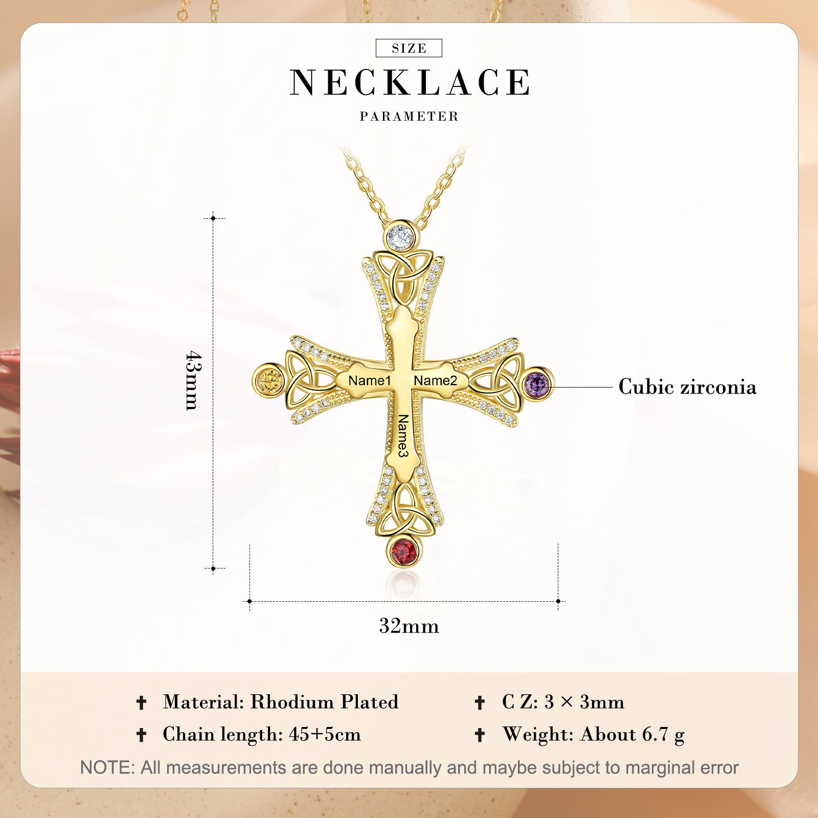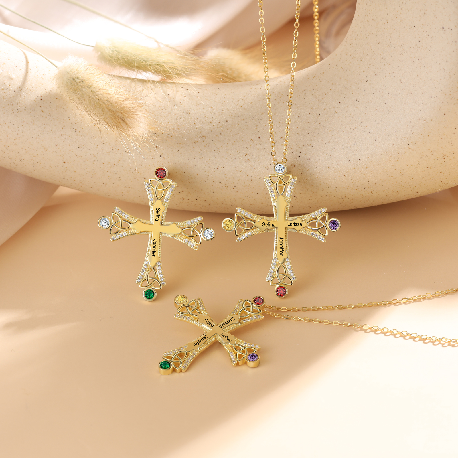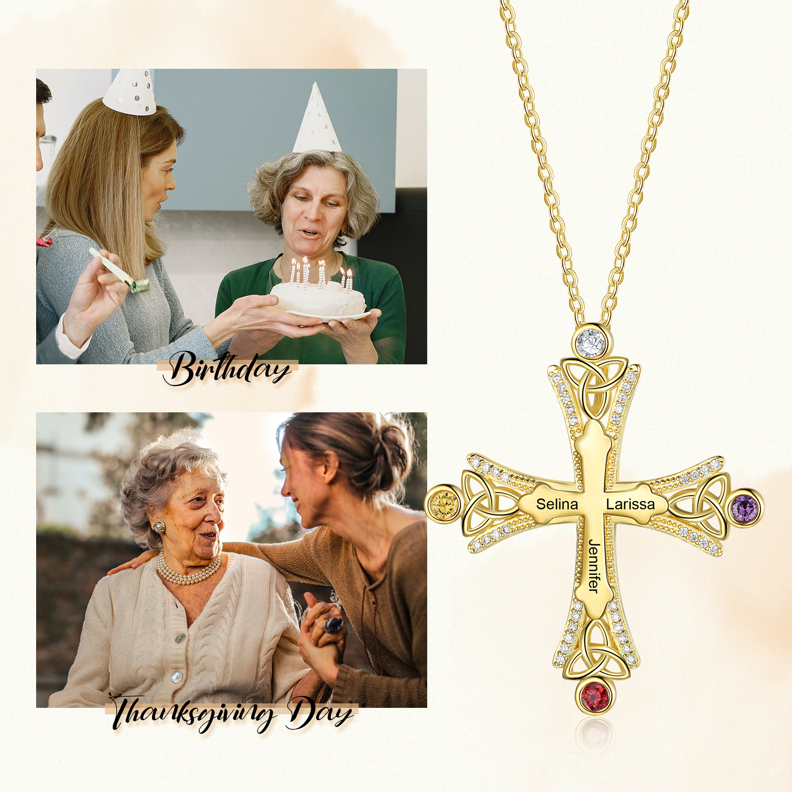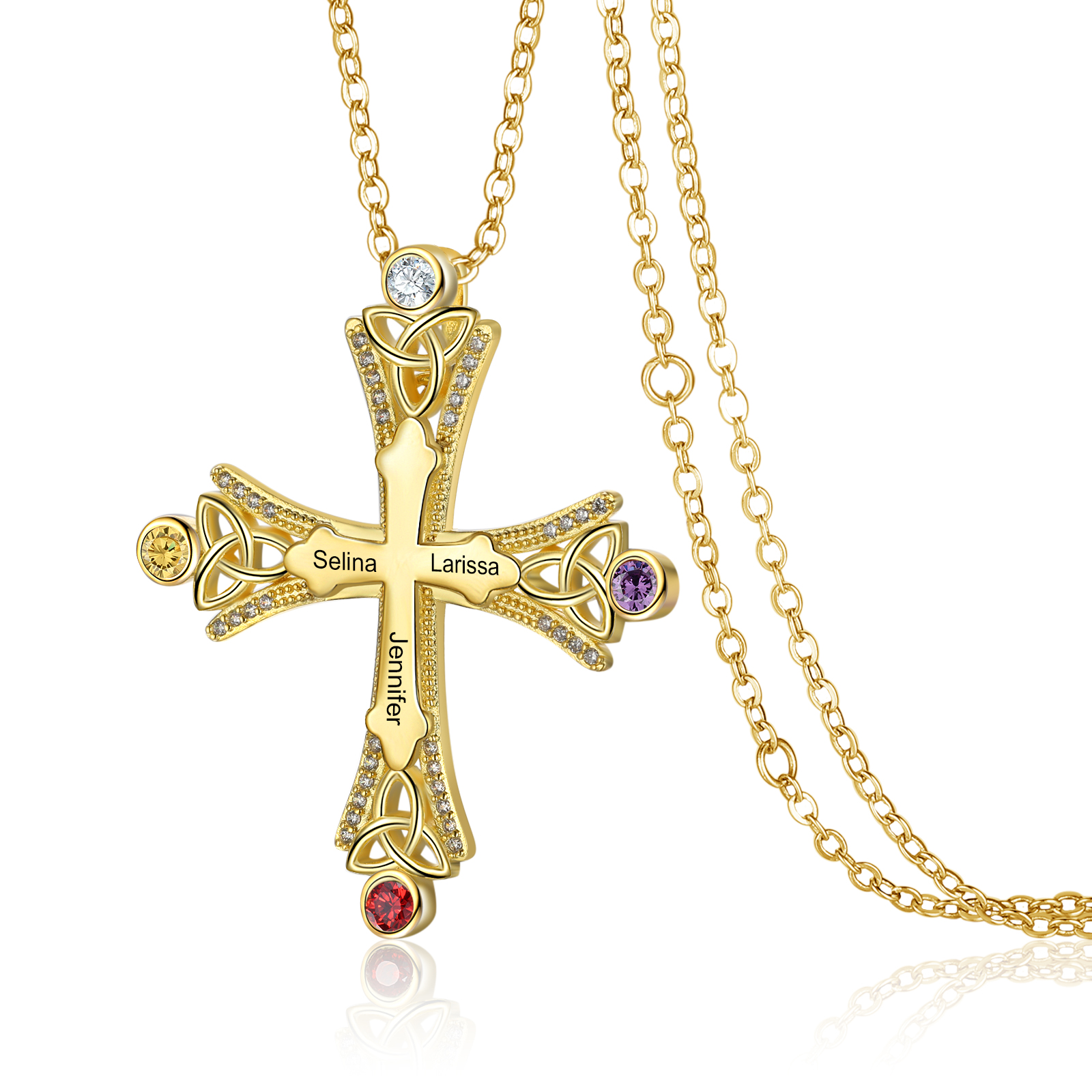 Collana con croce con 3 pietre di nascita e 3 nomi regalo