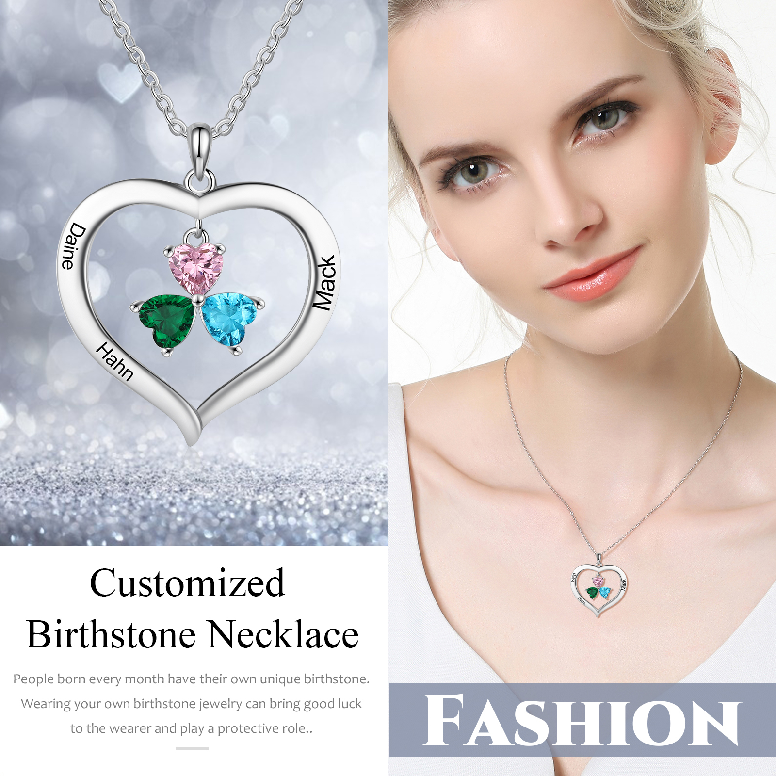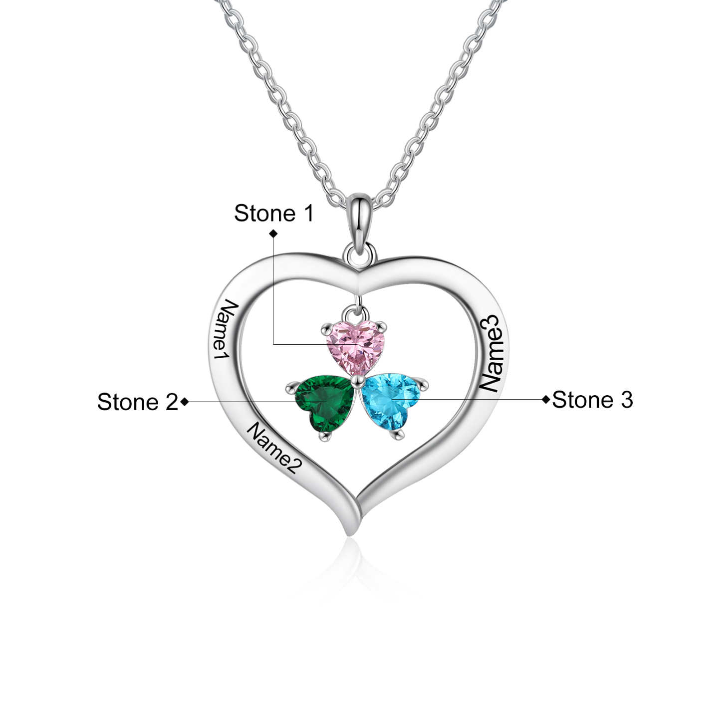 Collana Cuore 3 nomi personalizzato con ciondolo di cuore pietra di nascita per donna