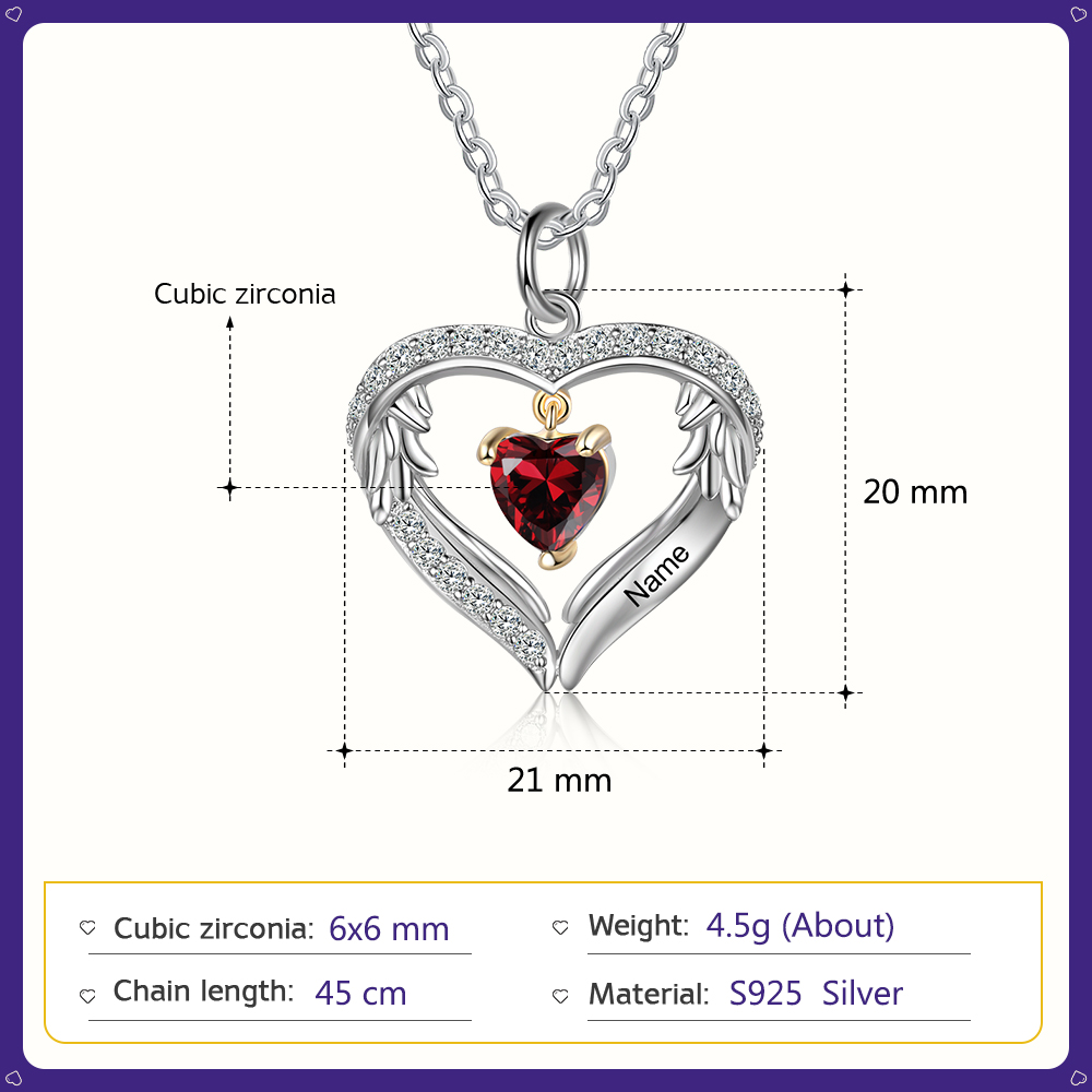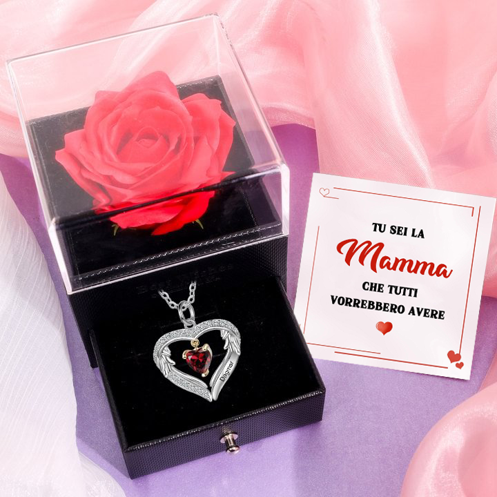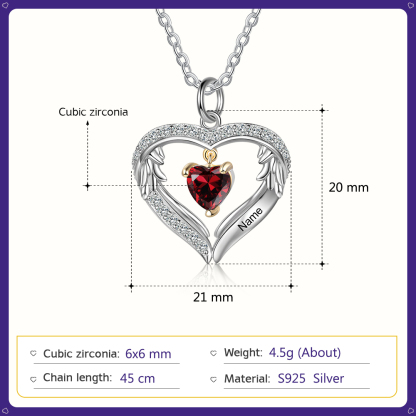Collana Cuore con ali d'Argento S925 personalizzata 1 nome e 1 cuore pietra di nascita per donna